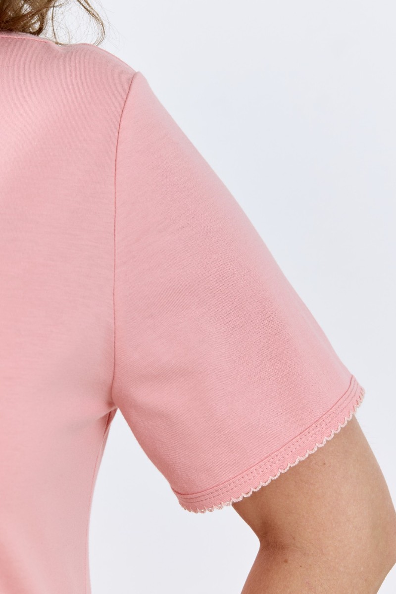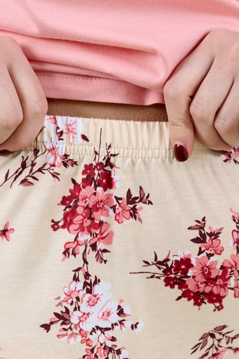 Представляем Вашему вниманию женскую пижаму из трикотажного полотна «кулирка» в комбинации двух видов: гладкокрашеного и с набивным рисунком, состоящая из футболки и шорт. Футболка – из гладкокрашеного полотна, с короткими цельнокроеными рукавами, горловиной V-образной формы. Низ рукавов и горловина обработаны декоративной строчкой «кроше», на полочке печать, выполненная в технике «шелкографии».Шорты – из полотна с набивным рисунком, удлиненные, свободного покроя, с эластичной тесьмой по талии.