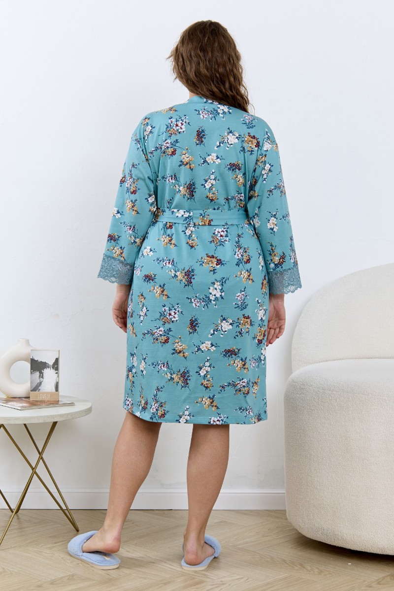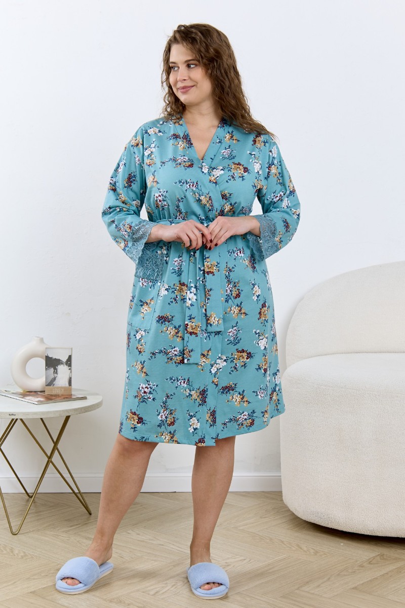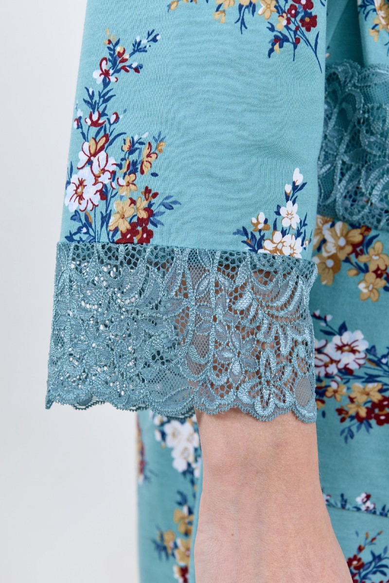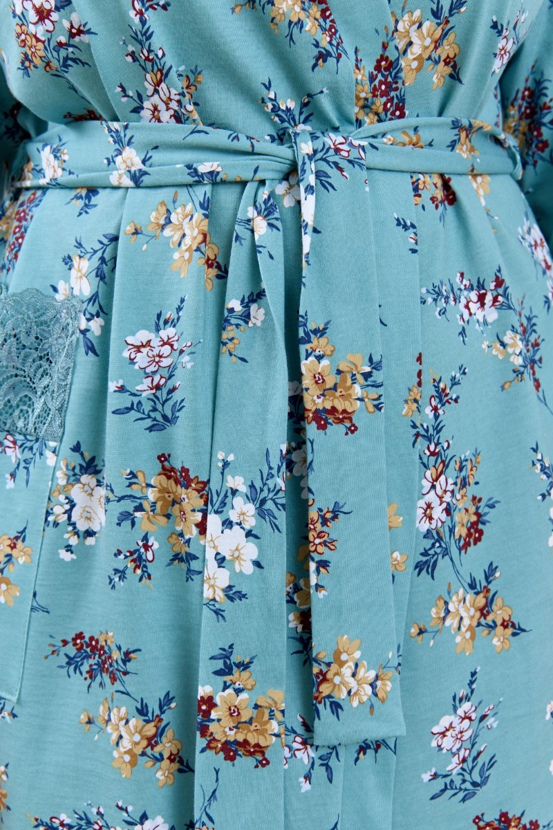 Представляем Вашему вниманию халат женский из трикотажного полотна «кулирка» с набивным рисунком, на запахе, с втачными длинными рукавами, съемным поясам, продетым в две шлевки, вставленные в боковые швы на уровне линии талии. На правой полочке на уровне бедер – накладной карман прямоугольной формы. Борта и горловина обработаны притачной планкой. Верхний срез кармана и нижние срезы рукавов отделаны кружевом.