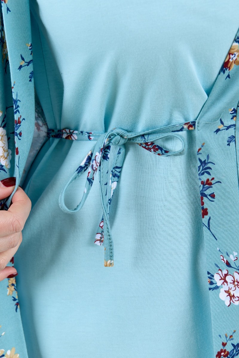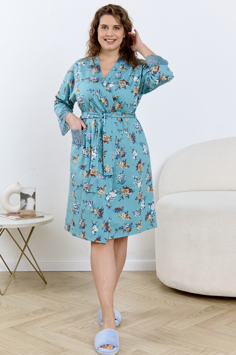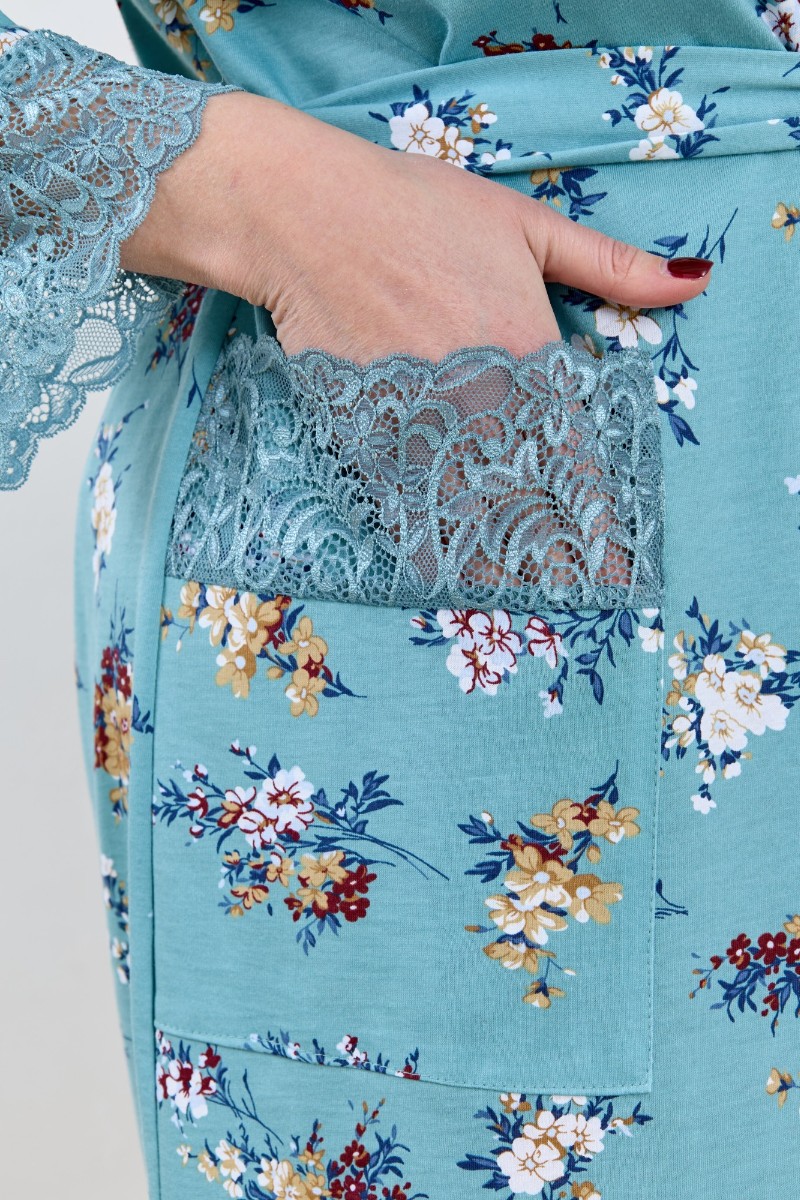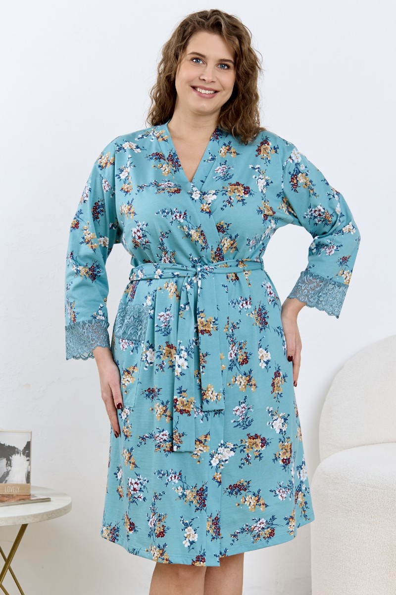 Представляем Вашему вниманию халат женский из трикотажного полотна «кулирка» с набивным рисунком, на запахе, с втачными длинными рукавами, съемным поясам, продетым в две шлевки, вставленные в боковые швы на уровне линии талии. На правой полочке на уровне бедер – накладной карман прямоугольной формы. Борта и горловина обработаны притачной планкой. Верхний срез кармана и нижние срезы рукавов отделаны кружевом.