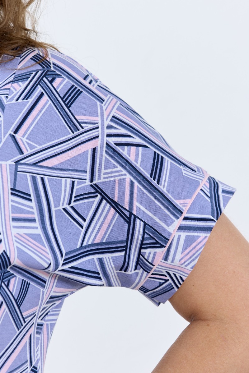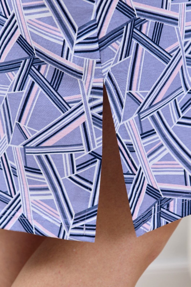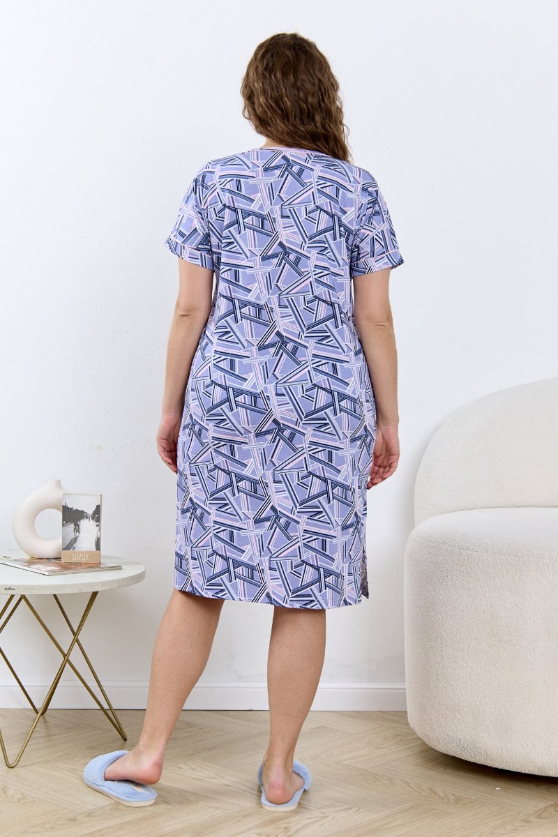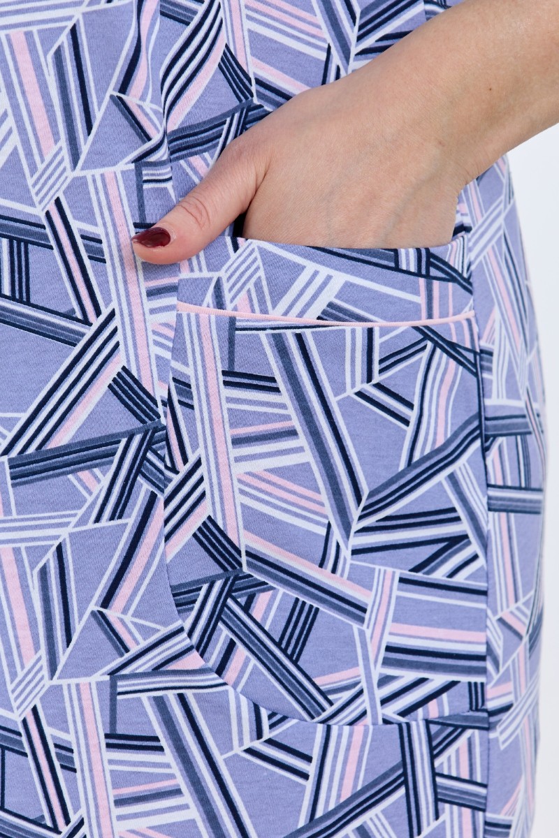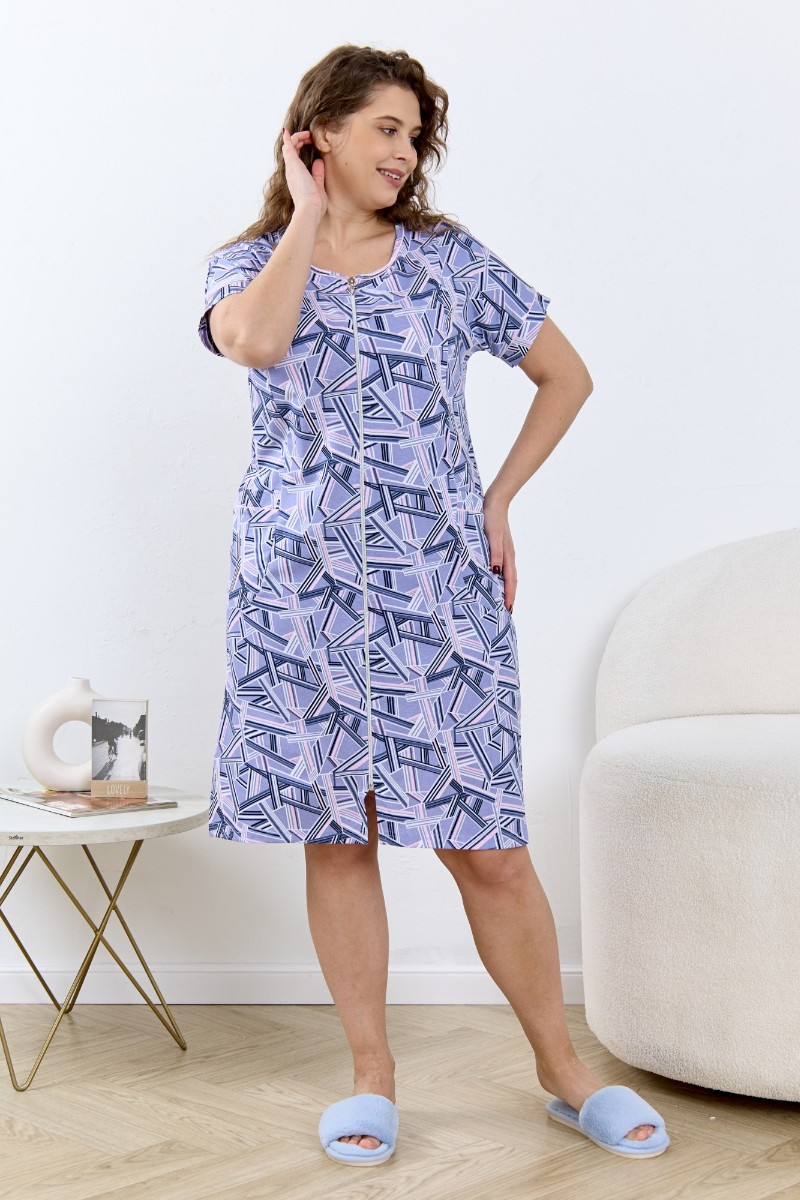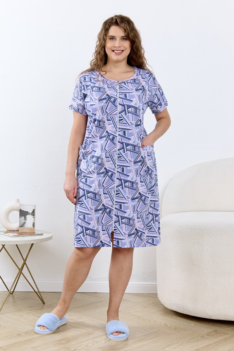 Представляем Вашему вниманию халат женский из трикотажного полотна «кулирка» с набивным рисунком, свободного покроя, расширенный к низу, с короткими цельнокроеными рукавами, горловиной овальной формы, окантованной двойным кантом и разрезами в боковых швах, центральной бортовой застежкой на тесьму « молния». Рукава с притачными манжетами и кантом, полочки с отрезными бочками в нижней части и боковыми карманами на уровне бедер. Верхние срезы карманов обработаны притачными планками с кантом.