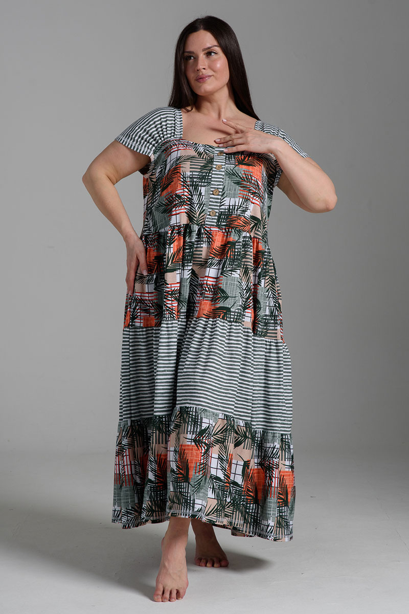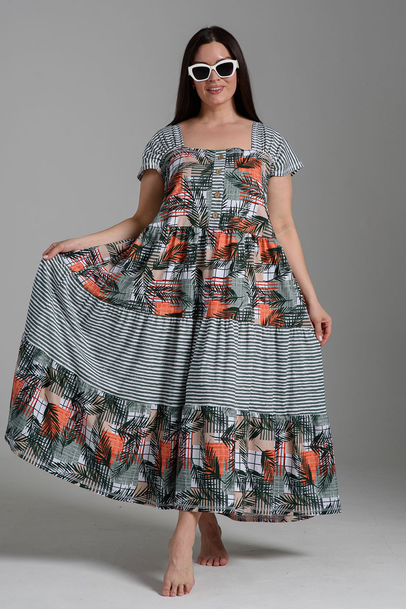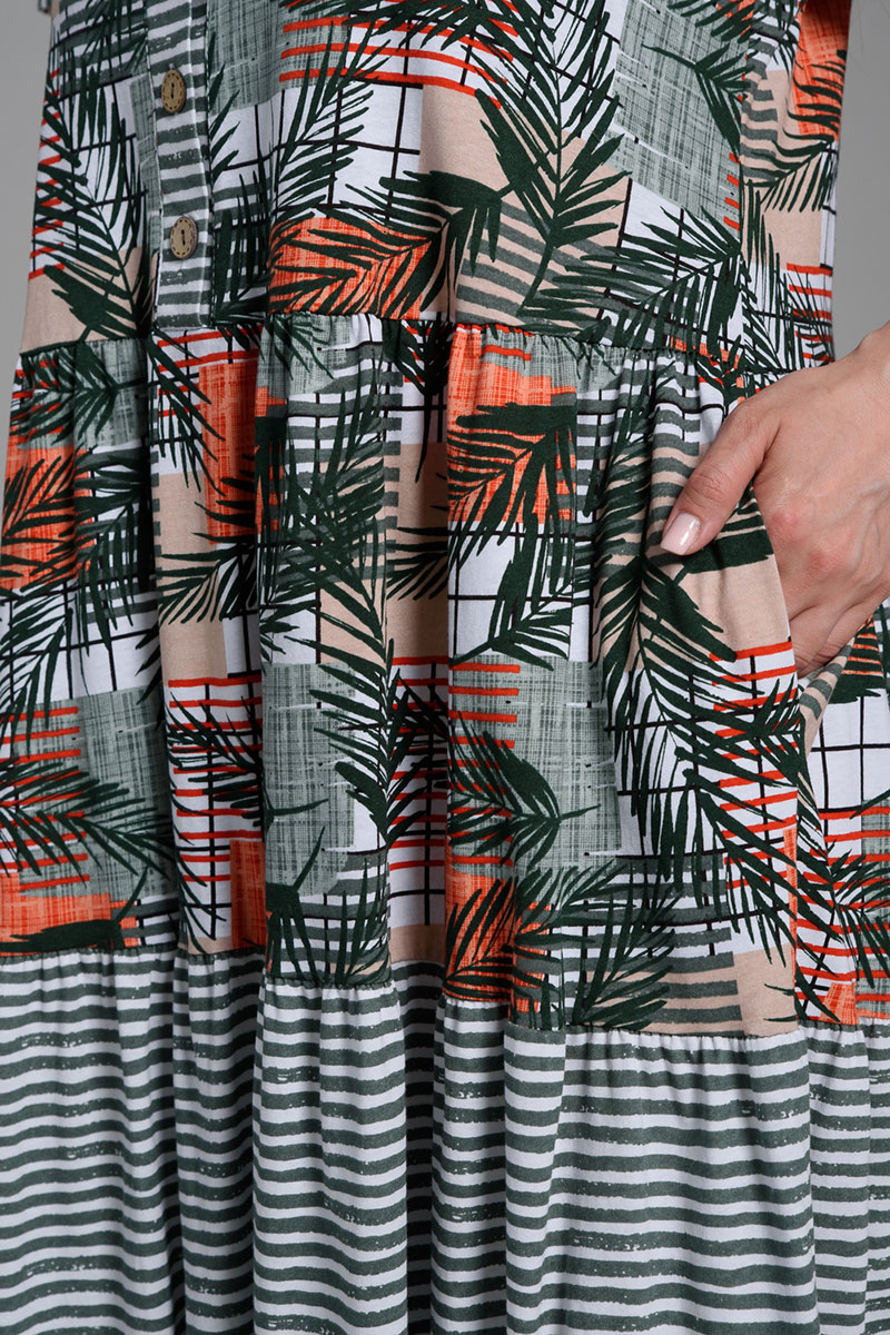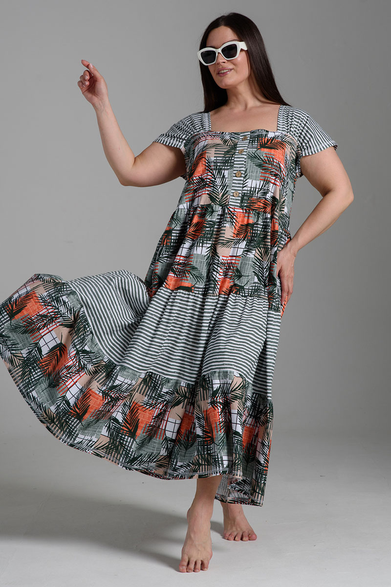 Платье женское №9257 кулирка (последний размер) тропические листья+хаки полоса 58,60