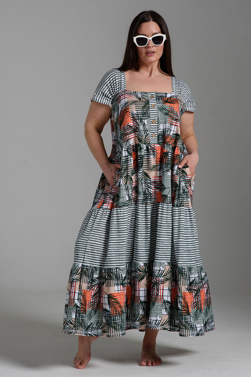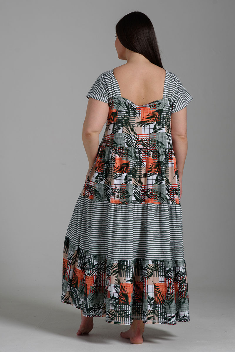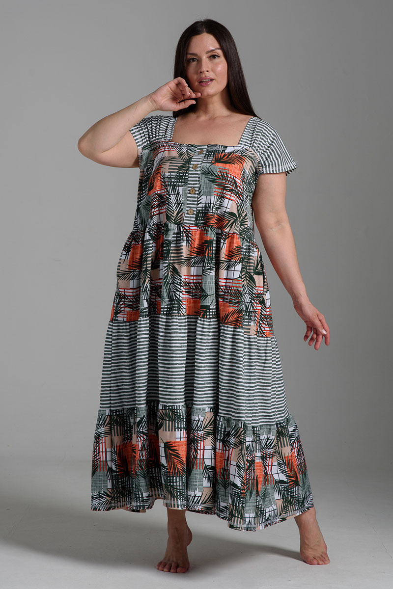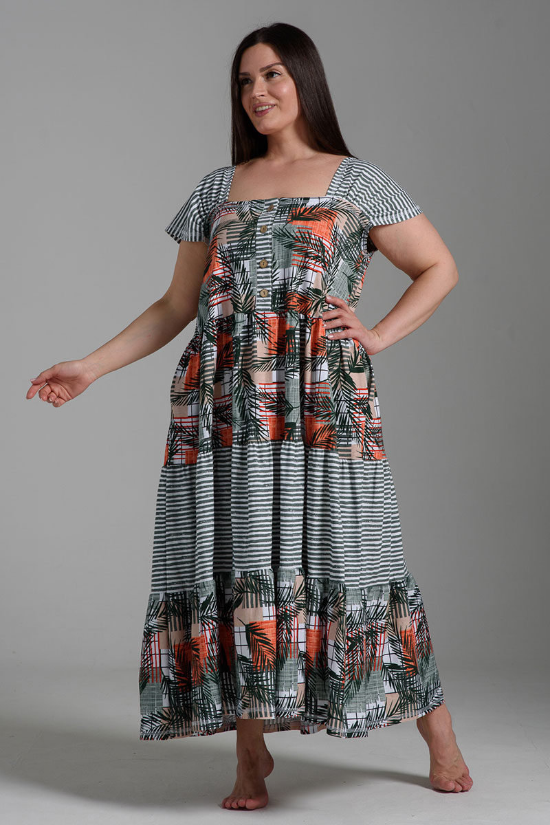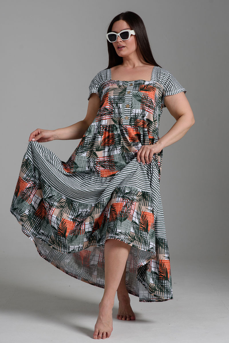 Платье женское №9257 кулирка (последний размер) тропические листья+хаки полоса 58,60