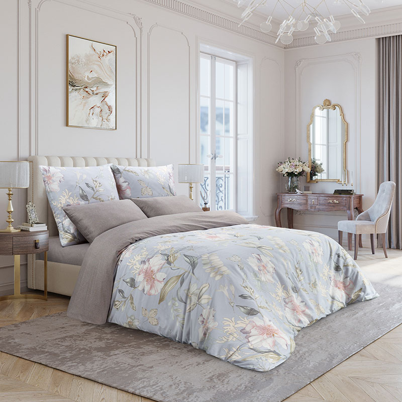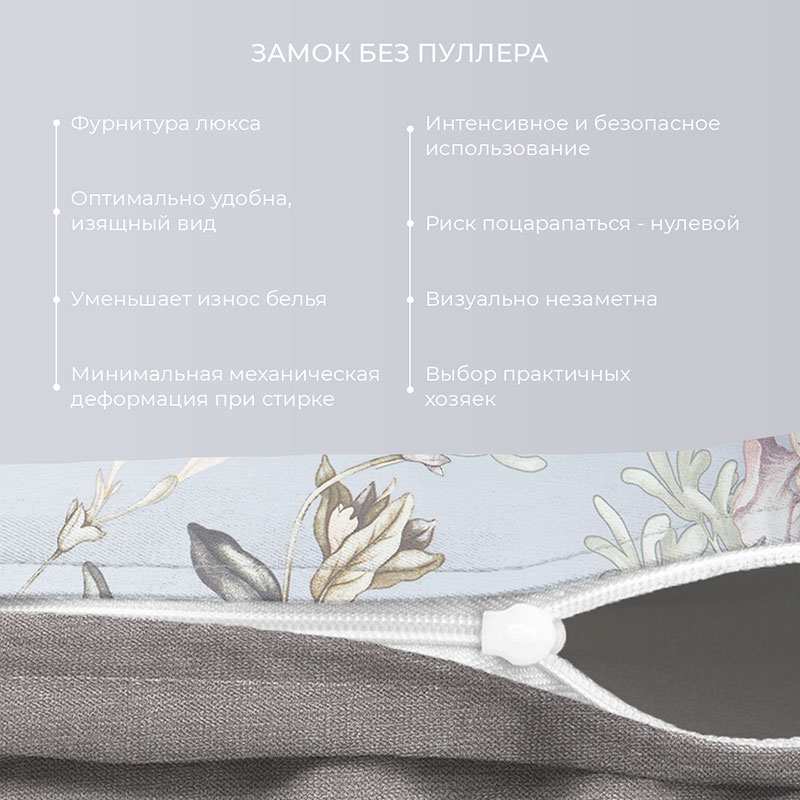 Особенности: простыня на резинке, наволочки с клапаном, пододеяльник с вшивной молнией