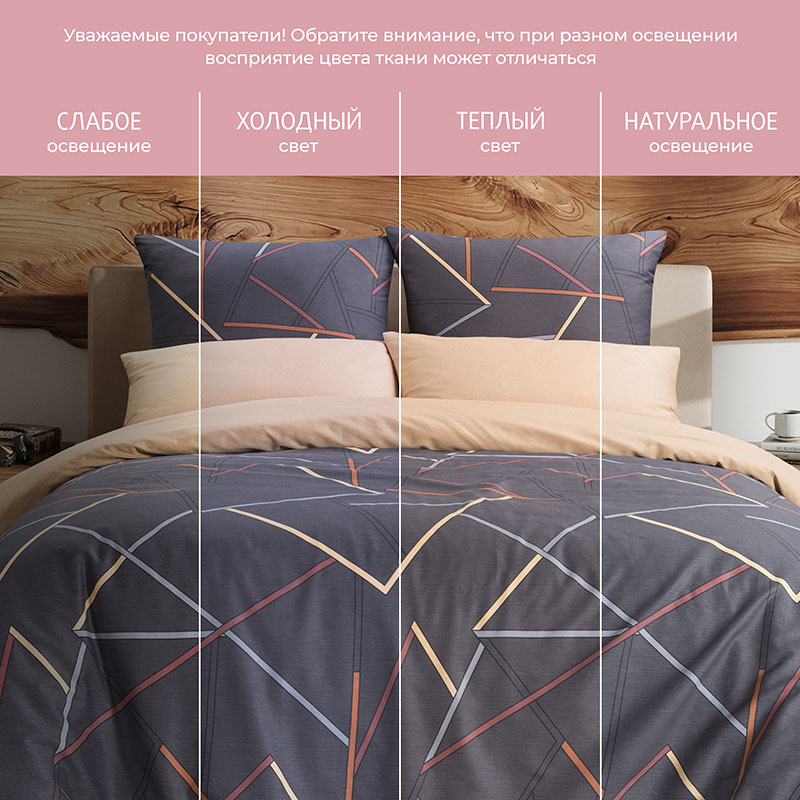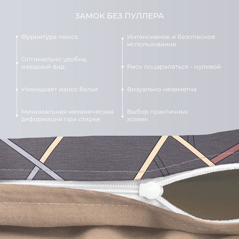 Особенности: простыня на резинке, наволочки с клапаном, пододеяльник с вшивной молнией