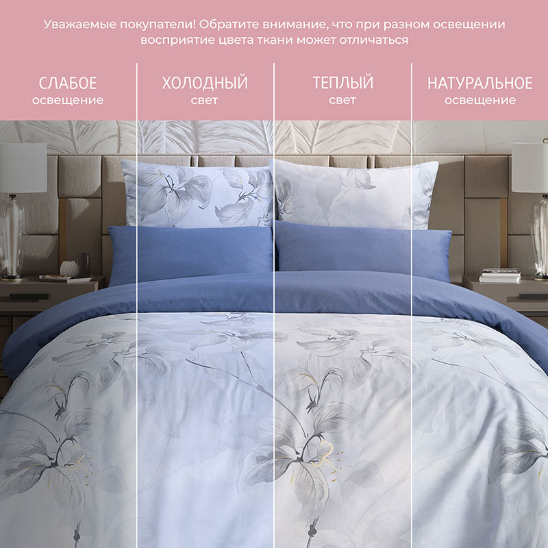 Особенности: простыня на резинке, наволочки с клапаном, пододеяльник с вшивной молнией