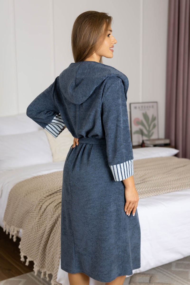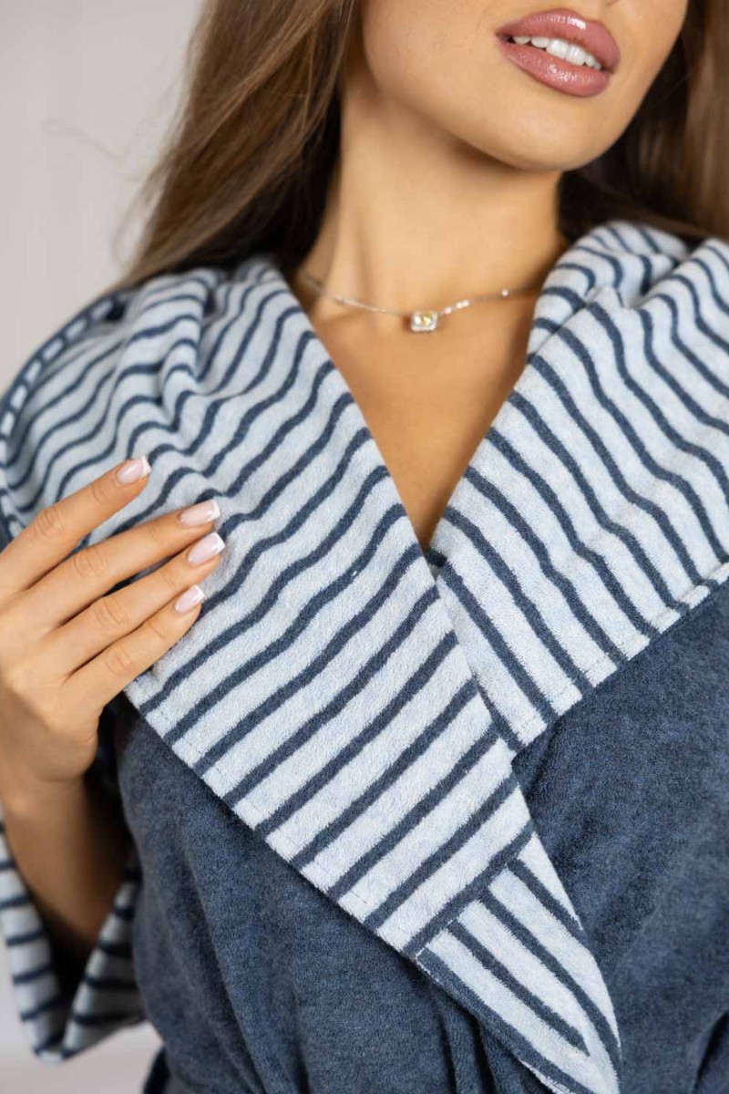 Представляем Вашему вниманию халат женский на запах из турецкой махры с капюшоном шалью, рукавом 3/4, карманами в боковых швах, длиной ниже колена, внутренними завязками и поясом-кушаком. Внутренний капюшон, подборт и манжеты, скроены из ткани компаньона.