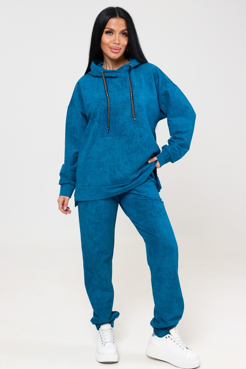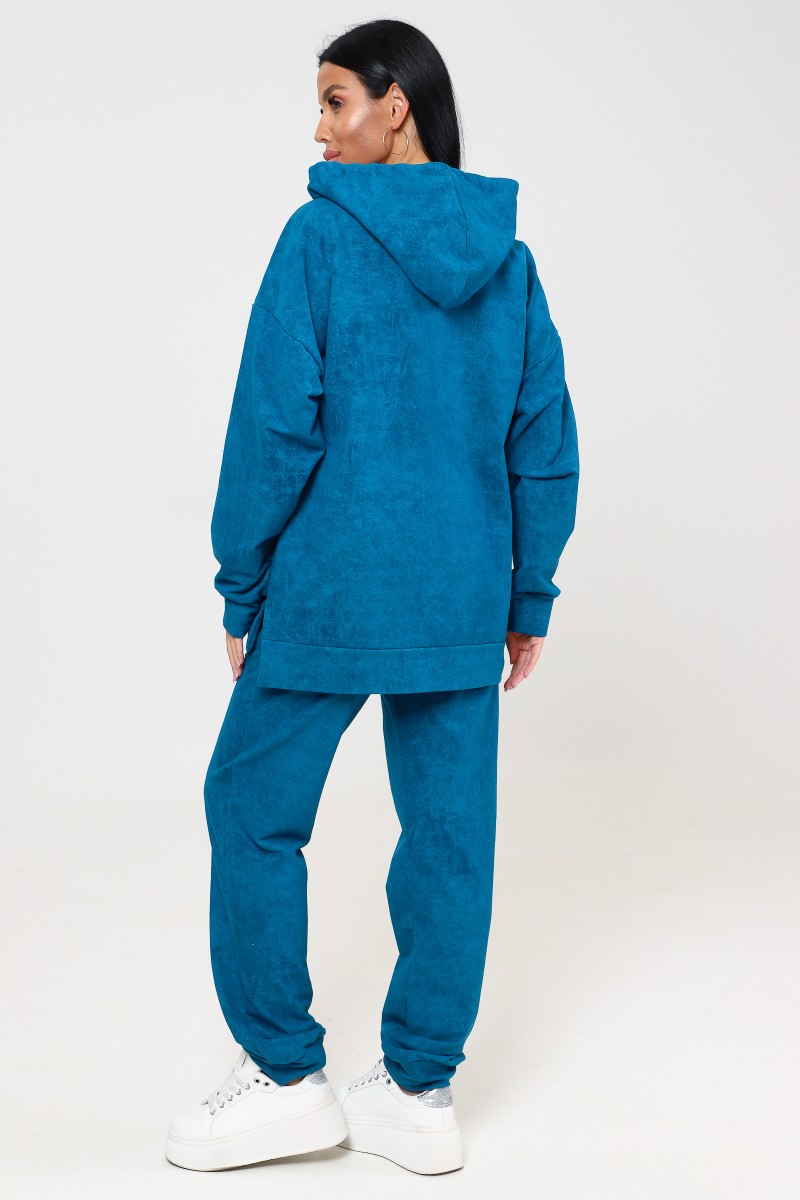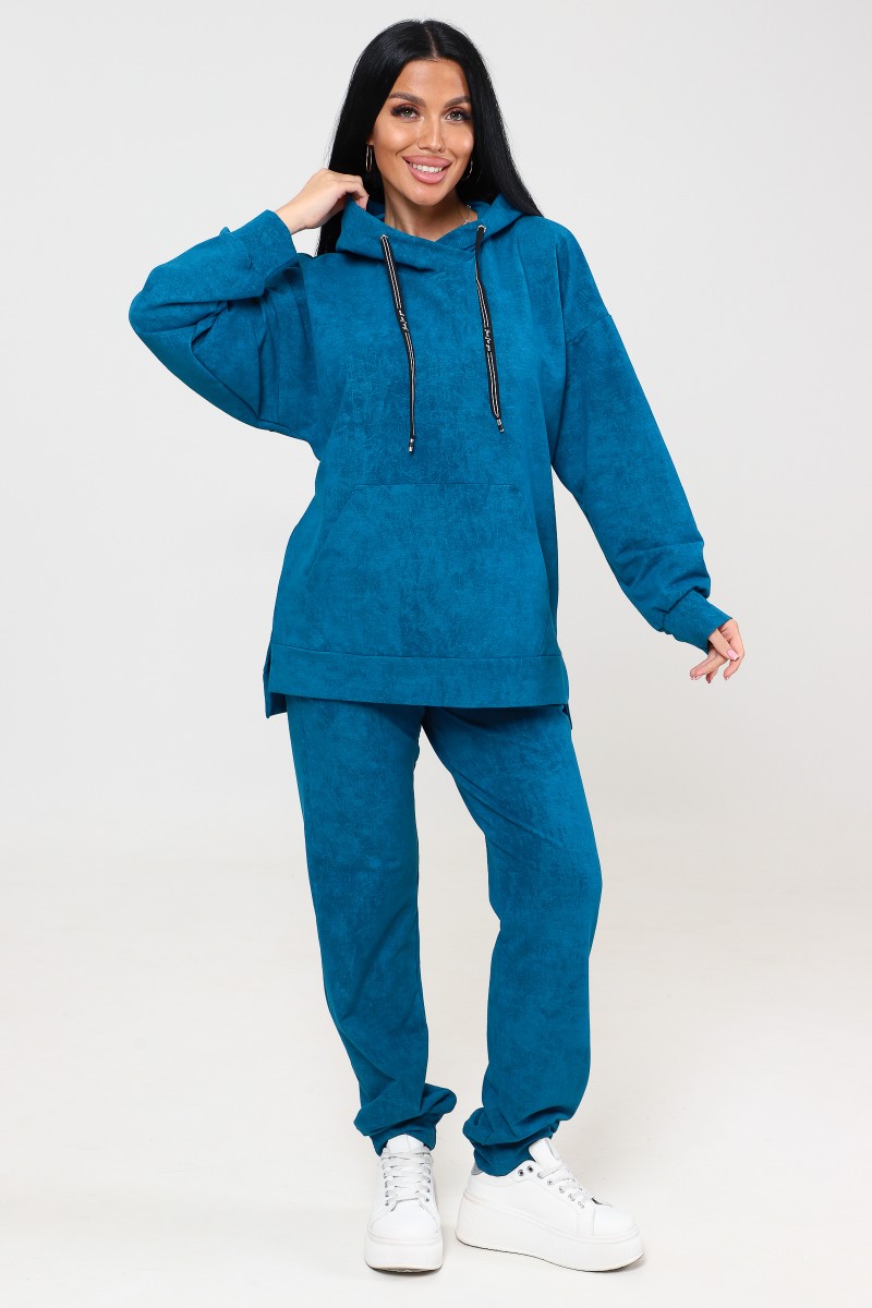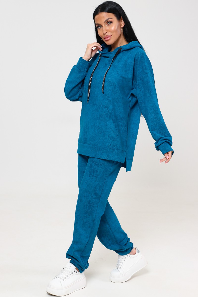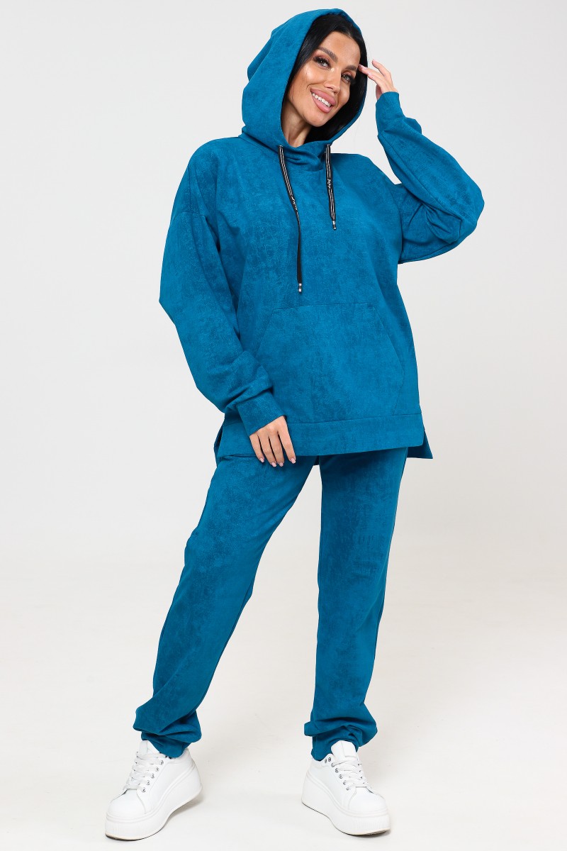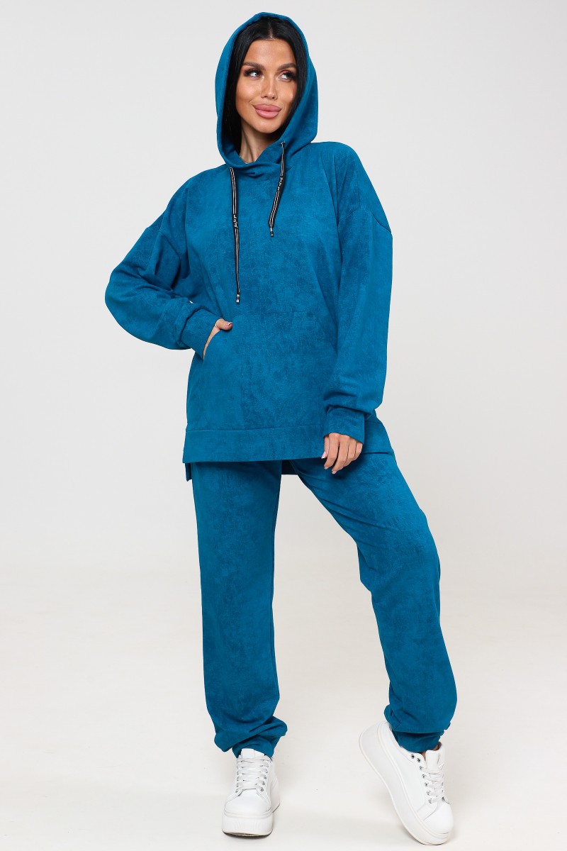 Представляем Вашему вниманию женский спортивный костюм - идеальный выбор для активных женщин, ценящих комфорт и стиль. Двойка, состоящая из худи с несъемным капюшоном и джоггеров, выполнена из мягкого футера без начеса, который приятен к телу и не сковывает движений. Модель с оригинальным вареным эффектом и стильным рисунком в цвете петрол или синий станет ярким акцентом в вашем образе. Свободный покрой и высокая посадка брюк обеспечивают максимальный комфорт в течение всего дня, а удобные карманы типа "кенгуру" и в шве позволят удобно хранить необходимые мелочи. Костюм подходит для повседневной носки, занятий спортом и активного отдыха. Благодаря универсальному дизайну и качественным материалам, этот костюм станет незаменимым элементом вашего гардероба.