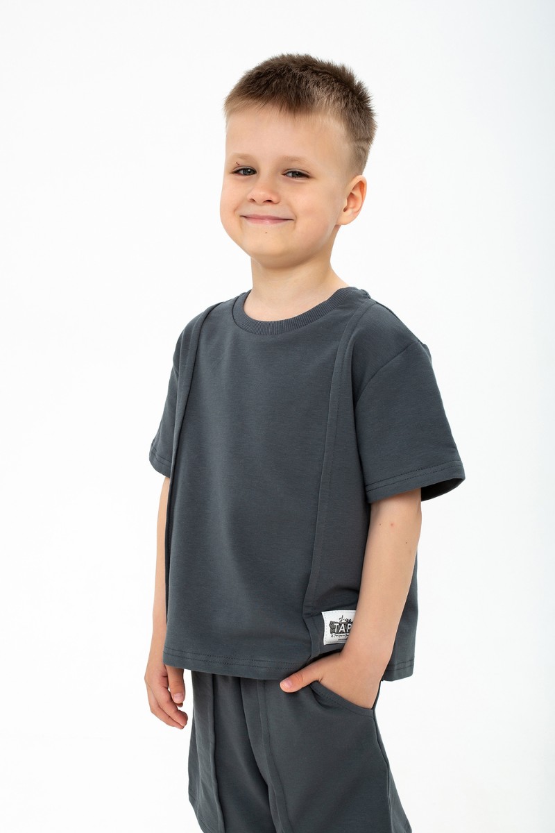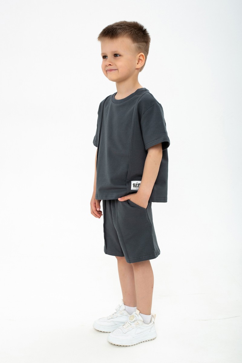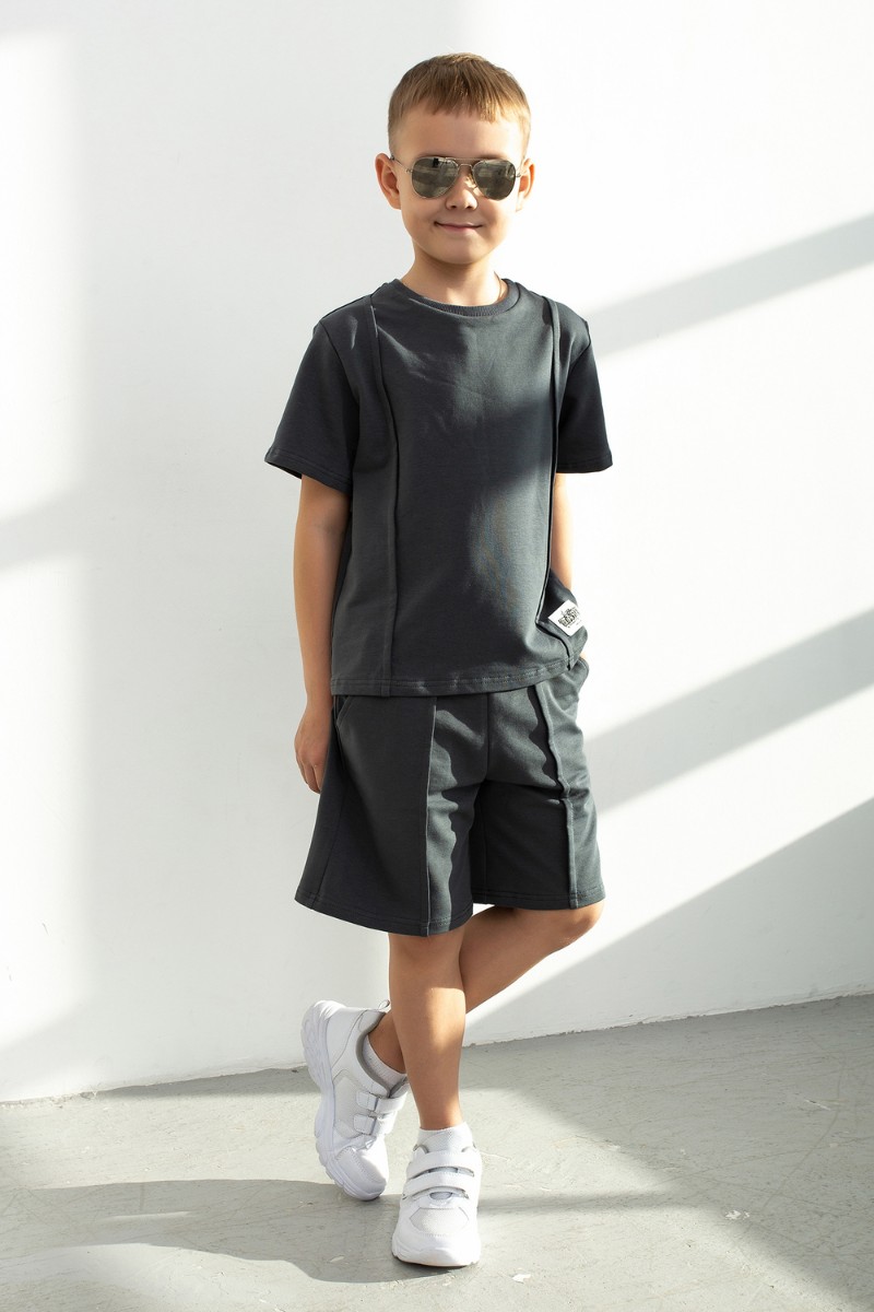 Представляем Вашему вниманию стильный детский костюм для мальчиков, который подарит малышу максимум удобства и удовольствия от каждого дня! Набор состоит из уютной футболки и удобных шорт, выполненных из натурального петельчатого футера приятной фактуры. Главной особенностью комплекта является оригинальный декор: футболка и шорты украшены элегантными строчками-стрелками на передней части, подчёркивая спортивный характер образа и придавая комплекту свежий, динамичный вид. Футболка оснащена короткими рукавами и свободно сидит на теле, позволяя ребенку активно двигаться и играть без ограничений. А шорты с мягким поясом на резинке обеспечивают идеальный комфорт и дополнительную свободу действий, а вместительные боковые карманы удобно разместят мелкие игрушки и необходимые мелочи. Благодаря сдержанной и универсальной расцветке костюм подойдет как мальчикам, так и девочкам, становясь незаменимым элементом гардероба на прогулках, отдыхе, занятиях спортом и домашней обстановке. Приобретите этот универсальный и модный детский костюм — пусть ваш малыш чувствует себя уверенно и счастливо каждый день!