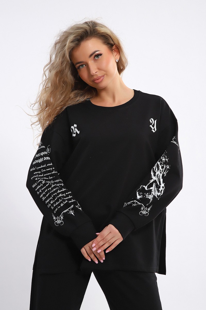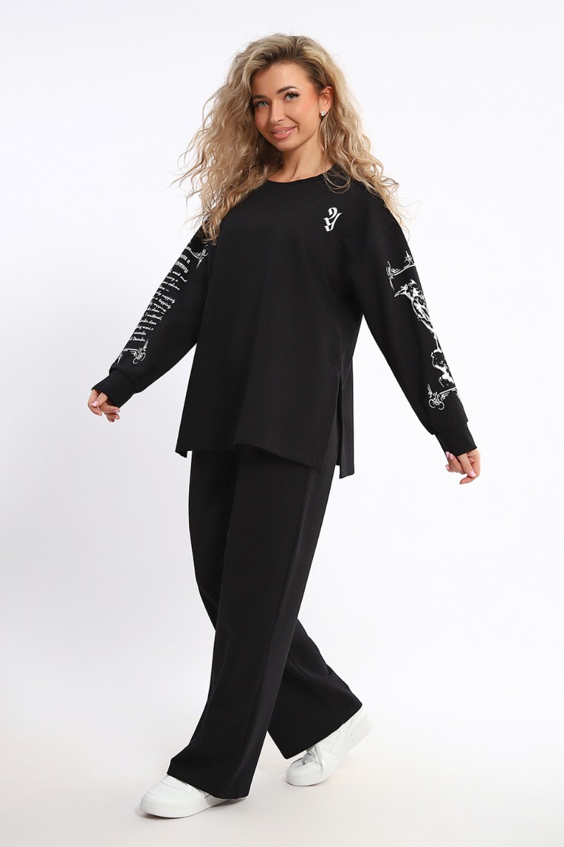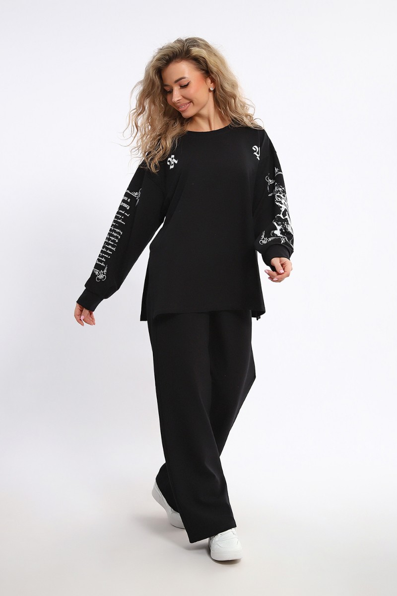 Представляем Вашему вниманию женский костюм двойку, который состоит из кофты и брюк. Кофта свободная, по боковым швам разрез. Рукав длинный со складочками на манжете. Оригинальная печать на спинке, полочке и рукавах. Брюки свободные с карманом, прямого кроя. Пояс брюк обработан на поясной машине. Костюм отлично подойдет как для повседневной носки, так и для спорта и прогулки. В нашем модном костюме вы будете самой красивой!
