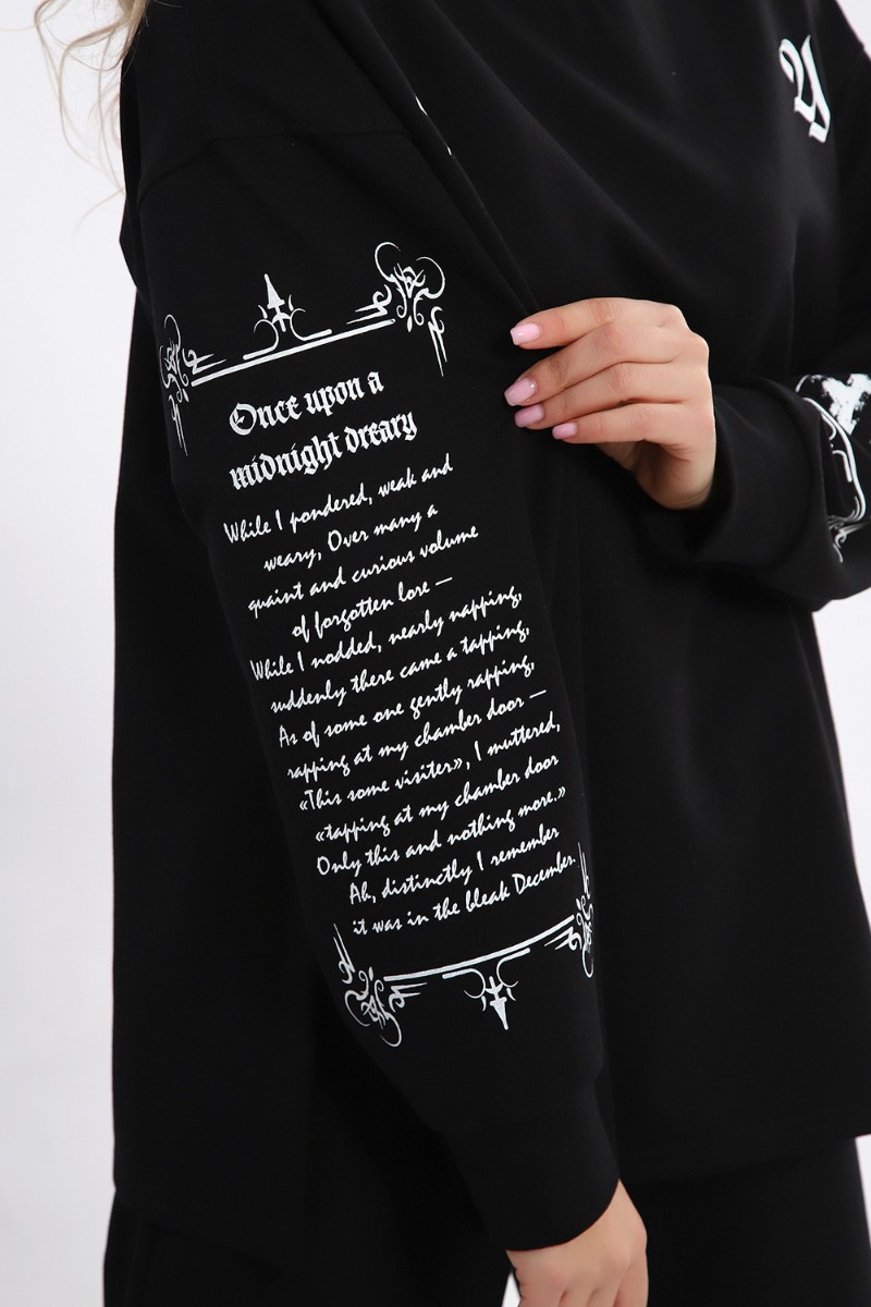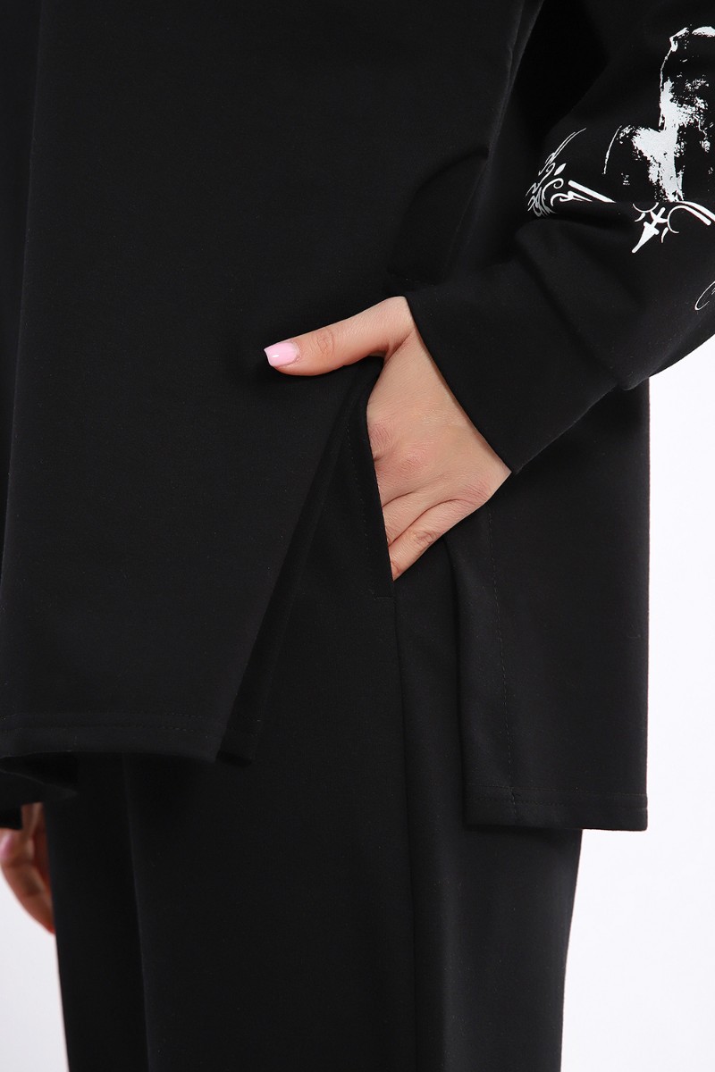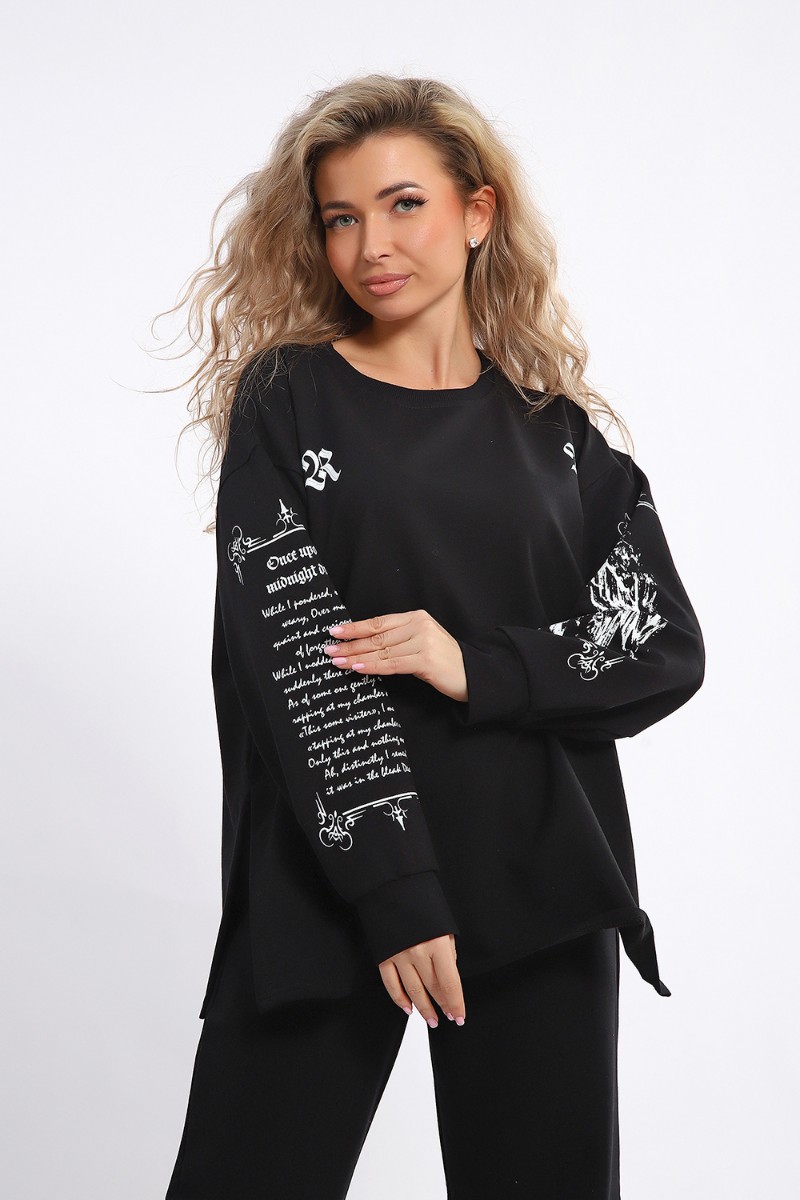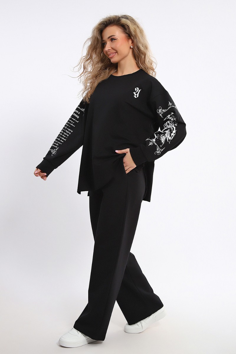Представляем Вашему вниманию женский костюм двойку, который состоит из кофты и брюк. Кофта свободная, по боковым швам разрез. Рукав длинный со складочками на манжете. Оригинальная печать на спинке, полочке и рукавах. Брюки свободные с карманом, прямого кроя. Пояс брюк обработан на поясной машине. Костюм отлично подойдет как для повседневной носки, так и для спорта и прогулки. В нашем модном костюме вы будете самой красивой!