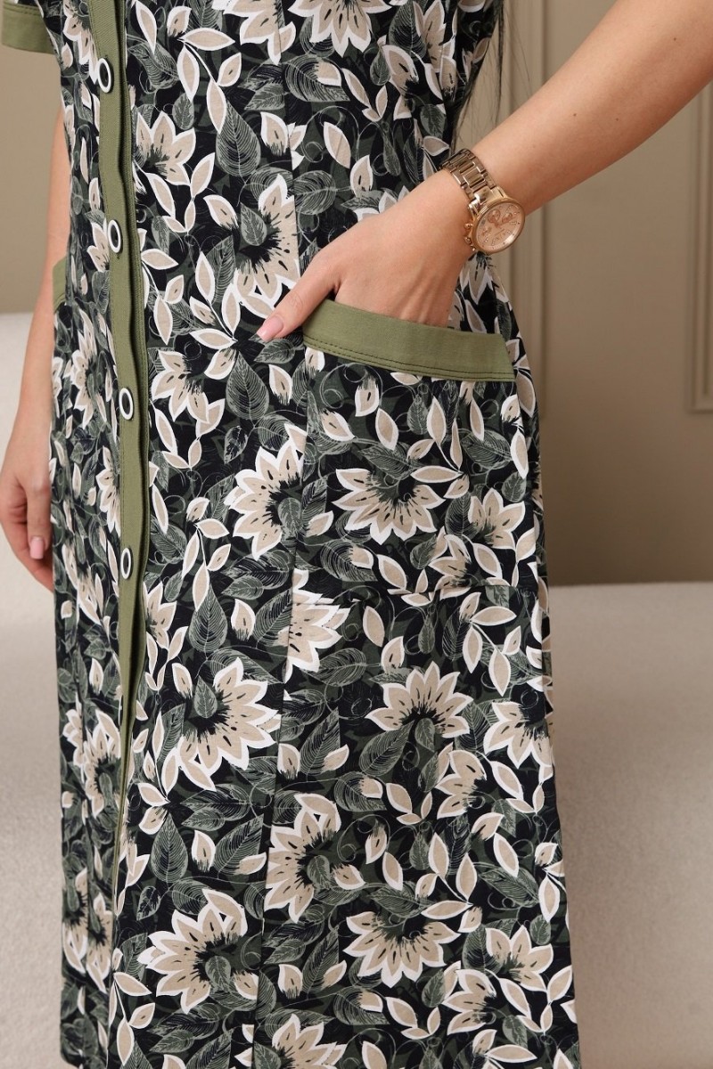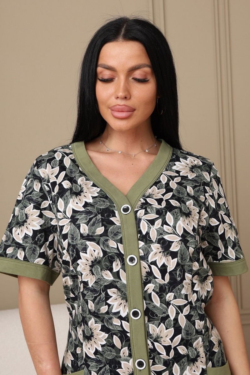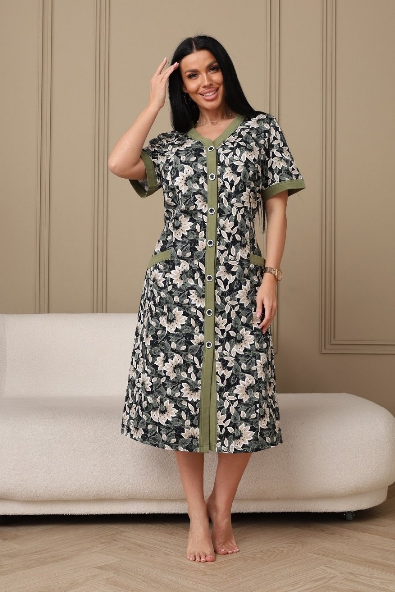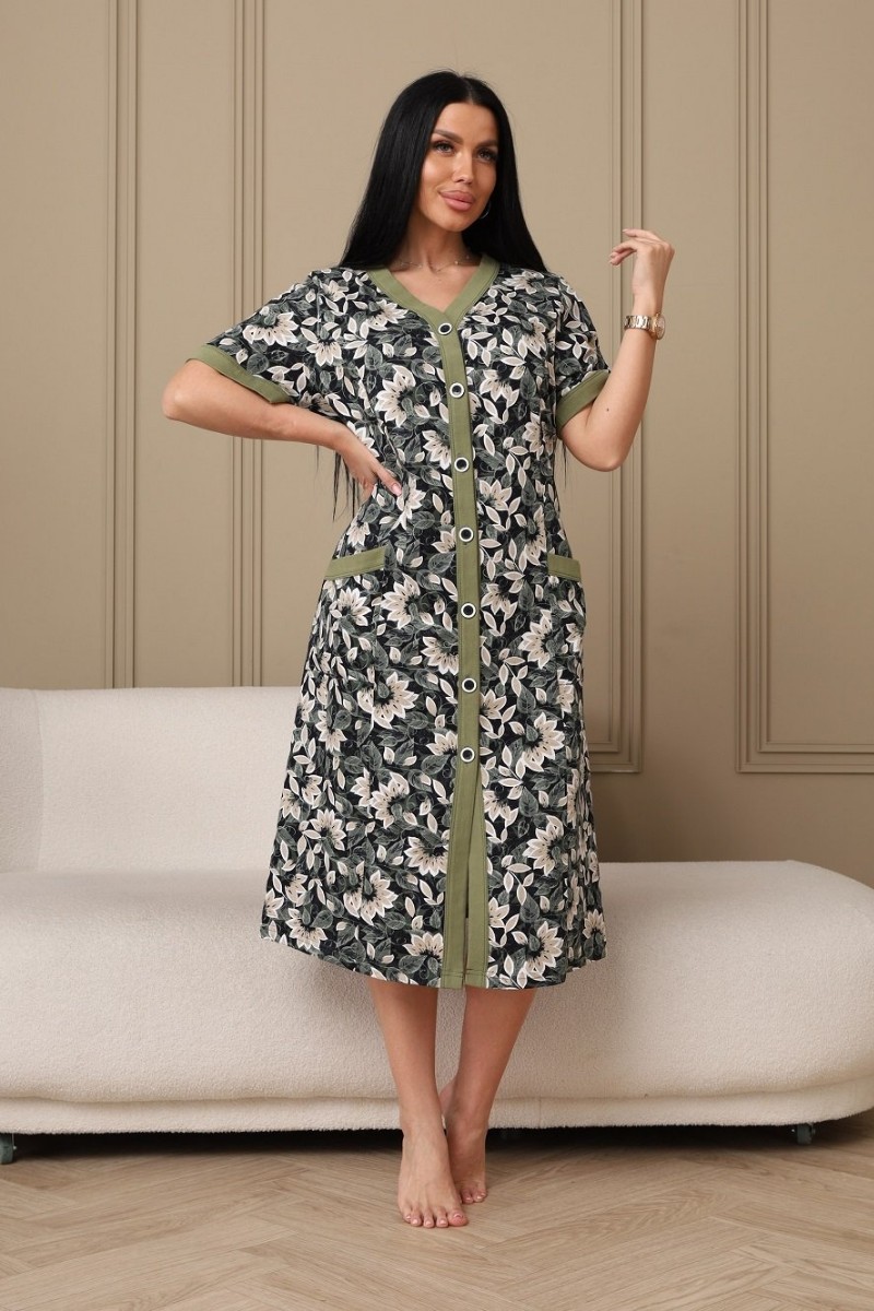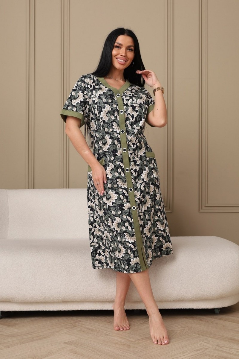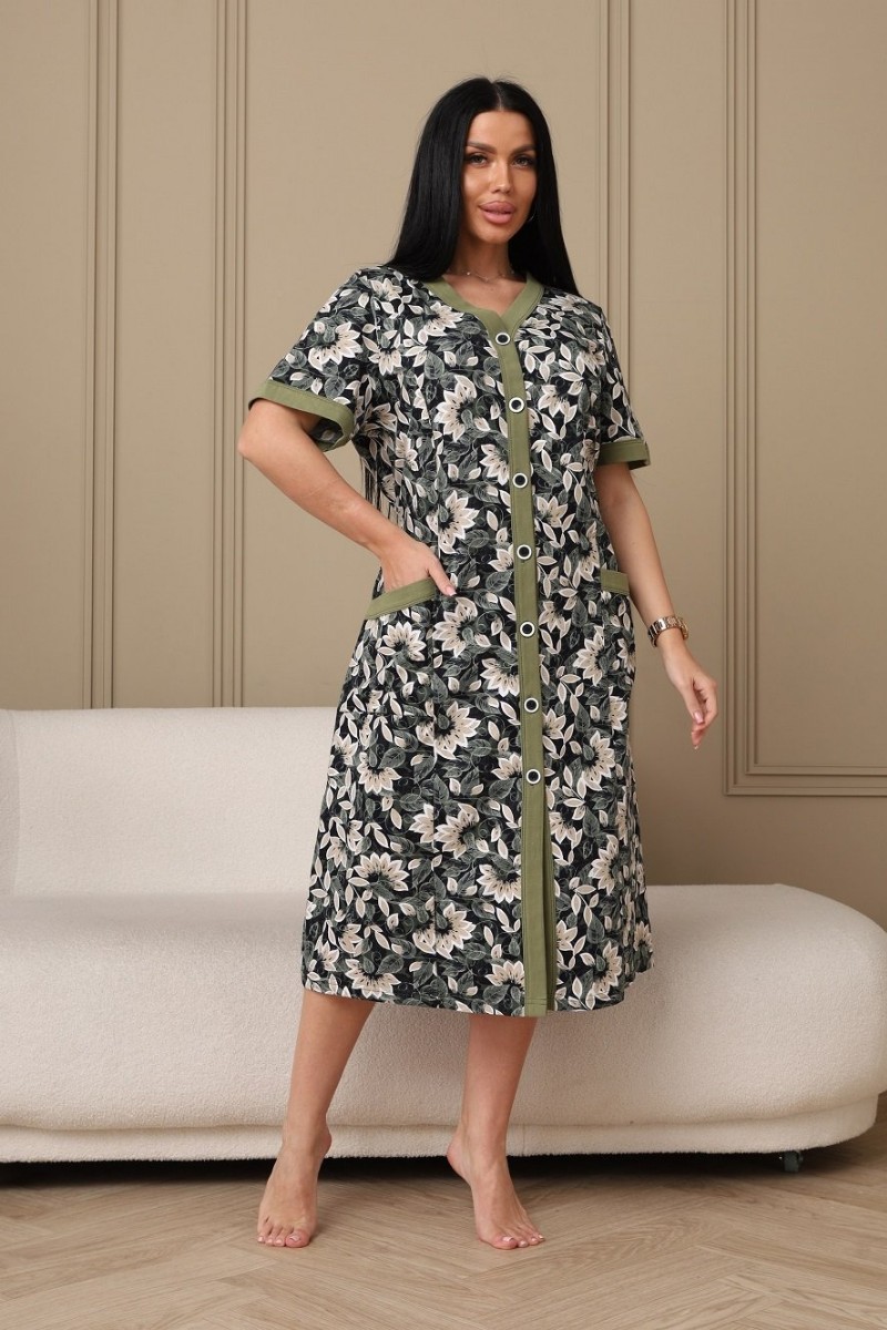 Халат женский 008 кулирка (р-ры: 54-74) зеленый-цветы