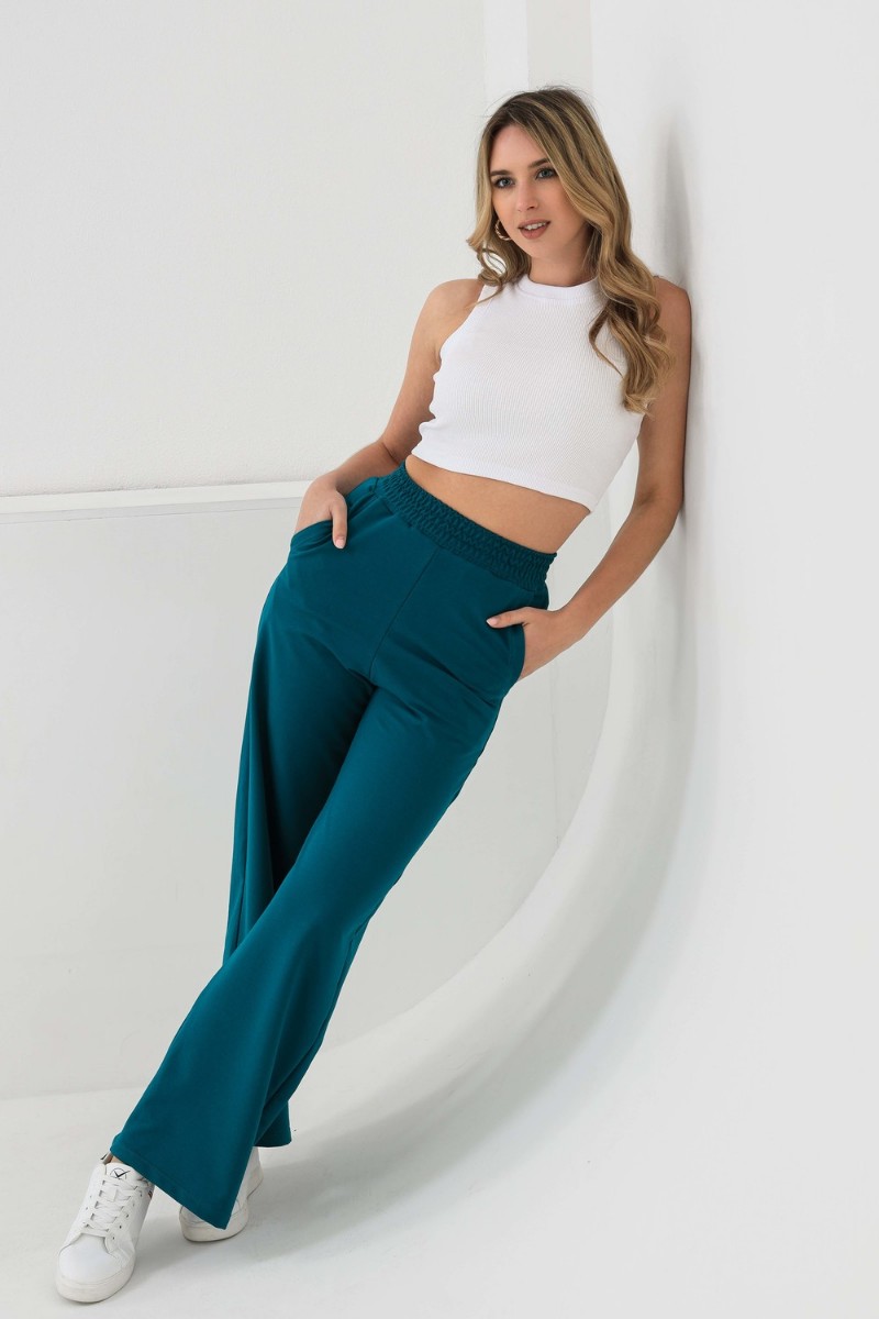 Представляем Вашему вниманию модные брюки палаццо с высокой посадкой, которые помогут Вам создать стильный образ на каждый день. Мягкая эластичная широкая резинка делает брюки очень удобными. Она не деформируется в процессе эксплуатации, так как прошита на поясной машине. Брюки свободного кроя красиво сидят на любой фигуре, такая модель брюк визуально удлиняет ноги. Брюки выполнены из плотной износостойкой ткани, приятной к телу. Широкий размерный ряд позволяет подобрать подходящую модель девушкам, женщинам больших размеров. Брюки хорошо гармонируют с блузками, кроп топами, футболками. На фото модель рост 170см.