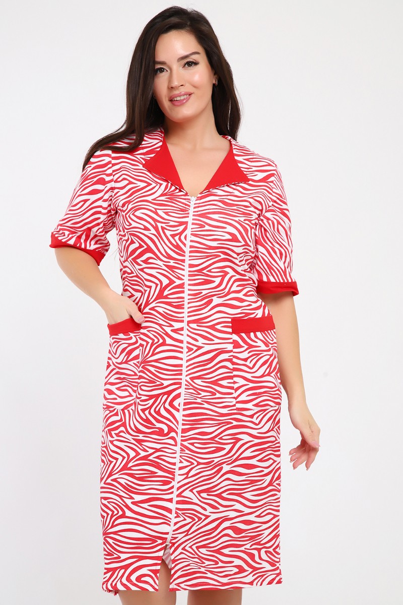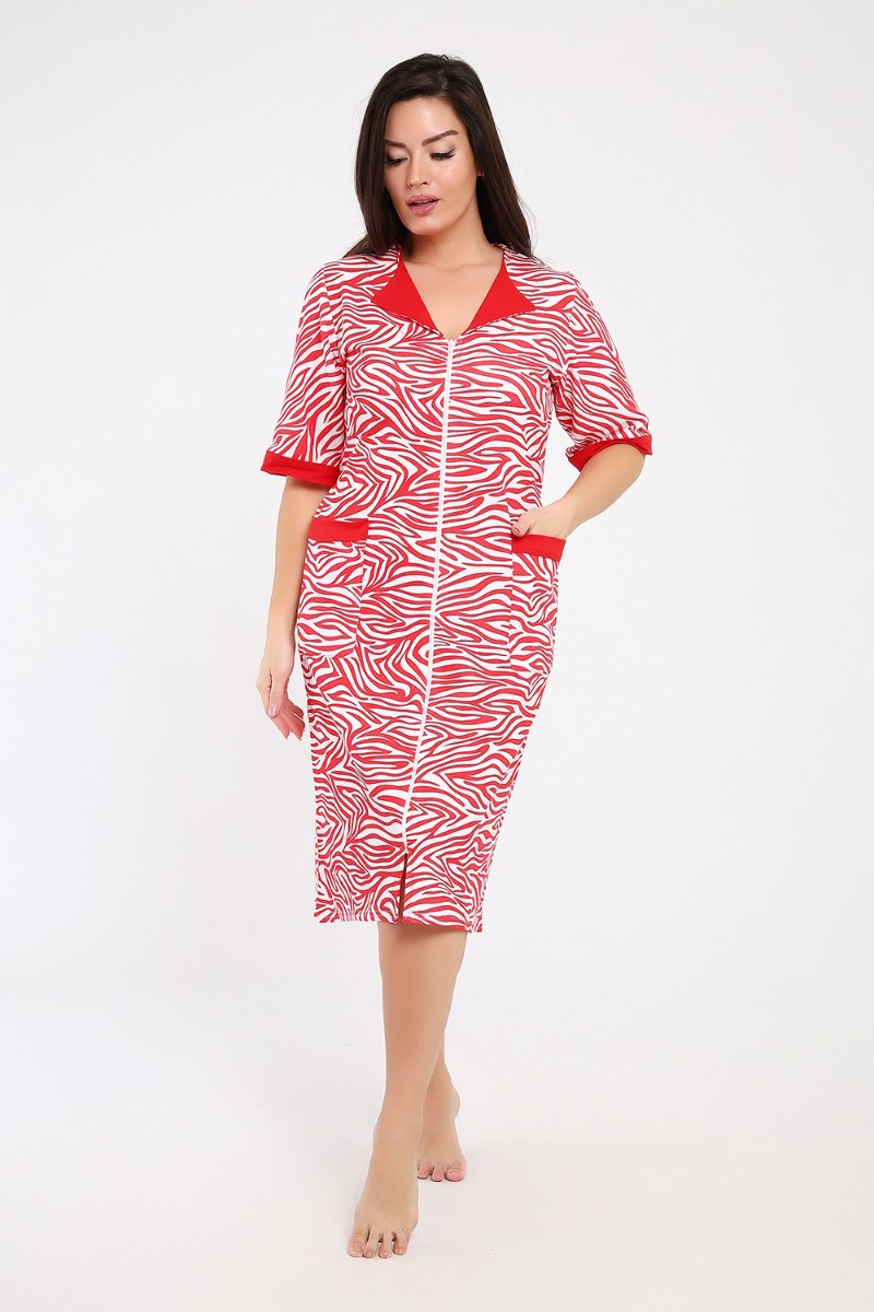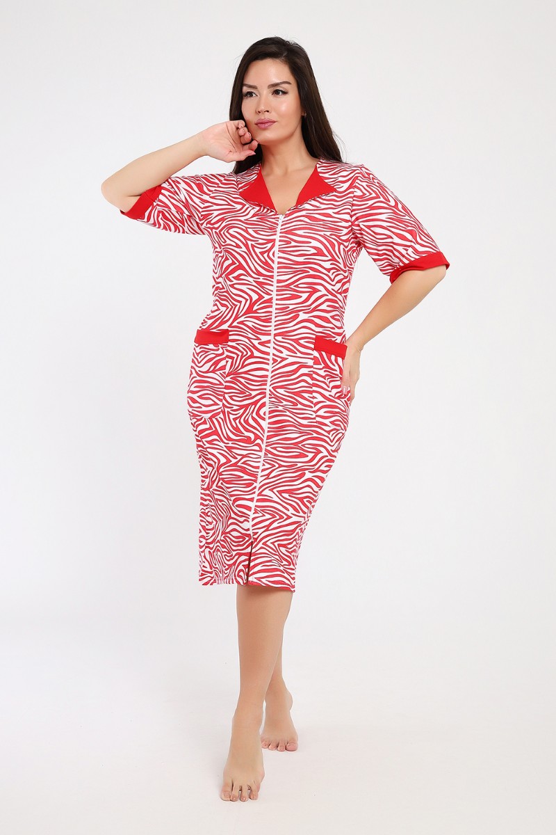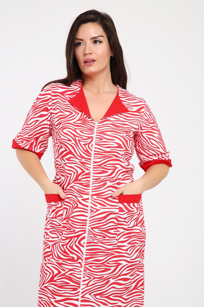 Представляем Вашему вниманию мягкий и уютный женский халат из футера с начёсом, украшенный рисунком зебры в красно-белых тонах. Рукав средний, с накладными карманами, застежка-молния, длина ниже колена, очень приятный к телу.