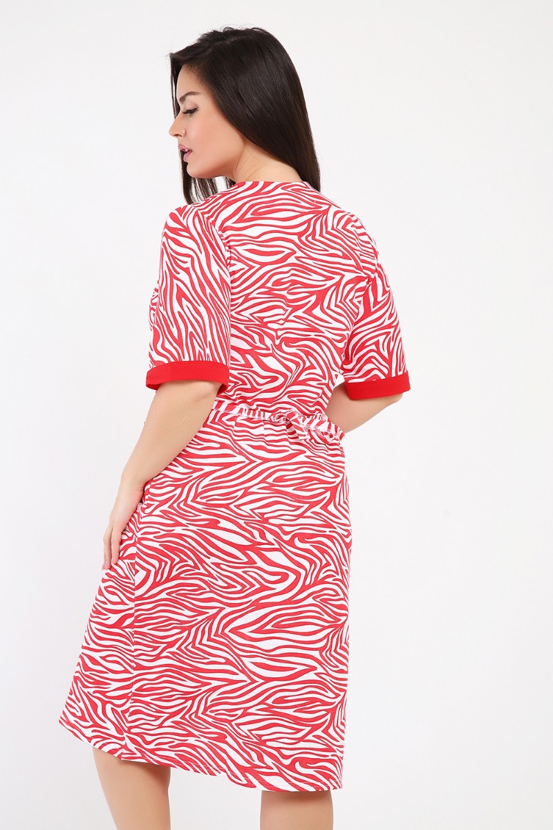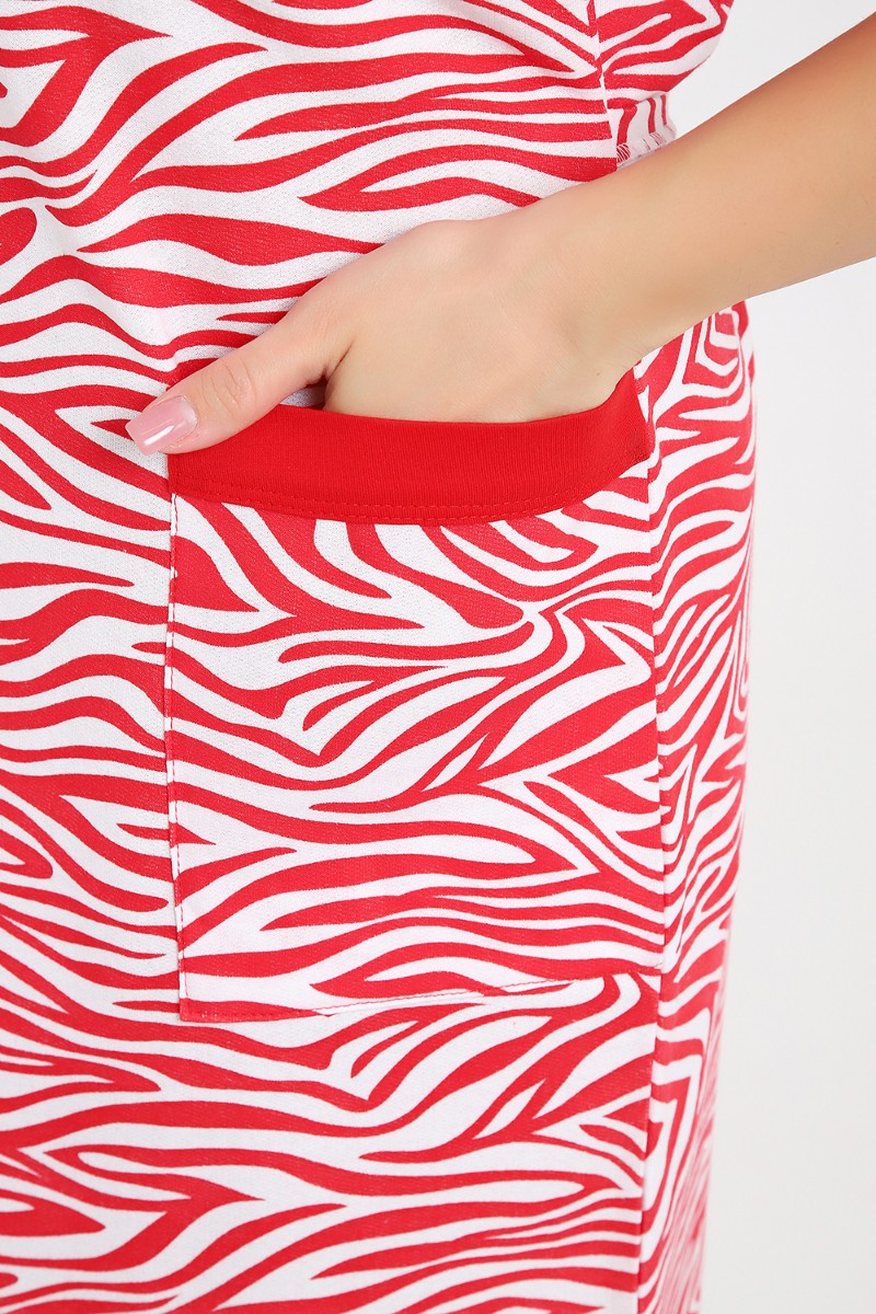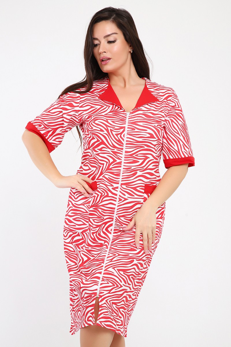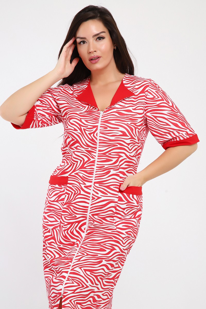 Представляем Вашему вниманию мягкий и уютный женский халат из футера с начёсом, украшенный рисунком зебры в красно-белых тонах. Рукав средний, с накладными карманами, застежка-молния, длина ниже колена, очень приятный к телу.