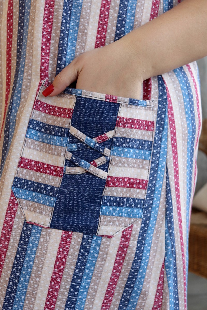 Представляем Вашему вниманию платье женское полуприлегающего силуэта из ткани в полоску. Рукав короткий цельнокроенный с воланом. На полочке накладные карманы. Кокетка полочки и спинки, воланы рукавов, рюша низа изделия из отделочной ткани. На кокетке полочки и карманах декоративная отделка в виде переплетающейся бейки. На модели 52 размер.