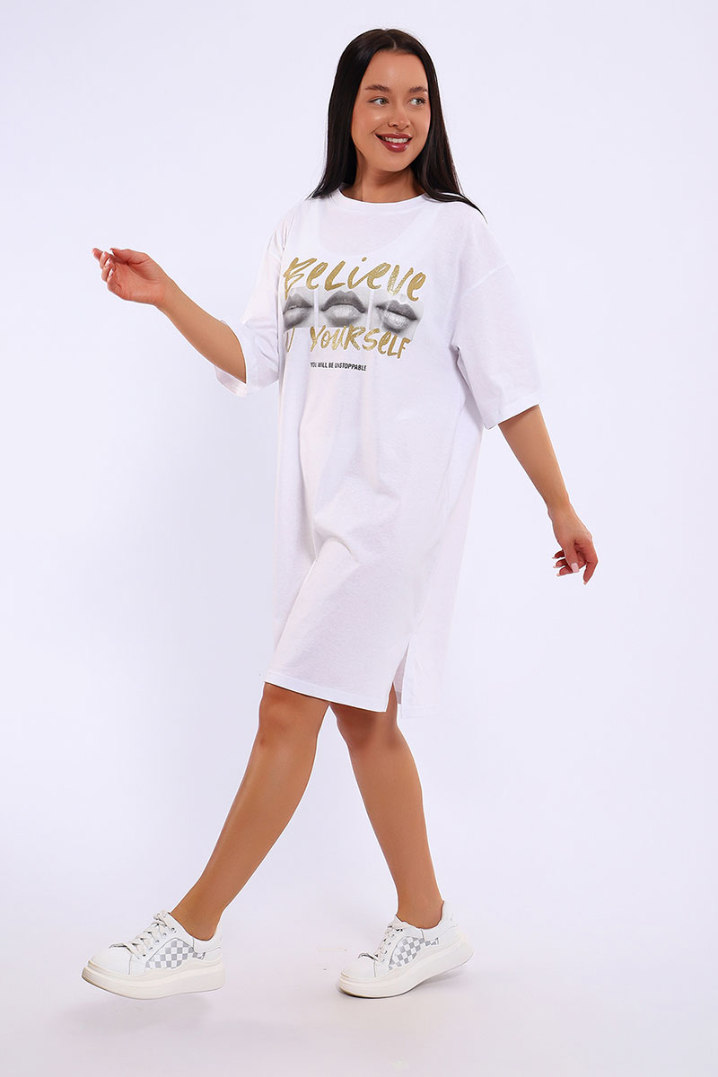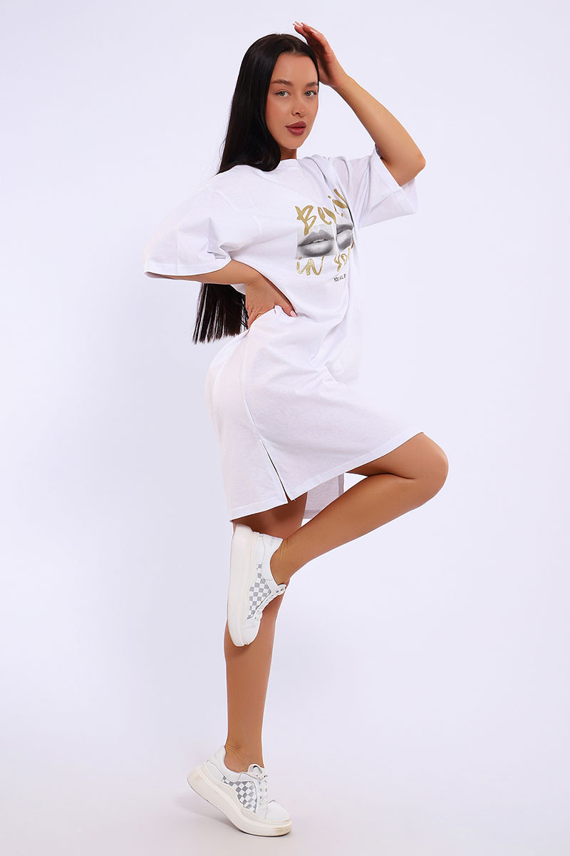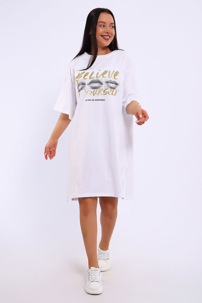 Представляем Вашему вниманию легкое летнее платье. Трикотажное платье-футболка формата Oversize, с забавным принтом на полочке. Платье идеально подойдет для любого летнего мероприятия, оно будет уместно как на пляже, так и на веселой вечеринке, прекрасно сочетается с шортами, велосипедками или лосинами. Трикотаж, из которого изготовлено платье, очень мягкий и нежный к коже и позволит хозяйке ощущать себя комфортно в любой ситуации!