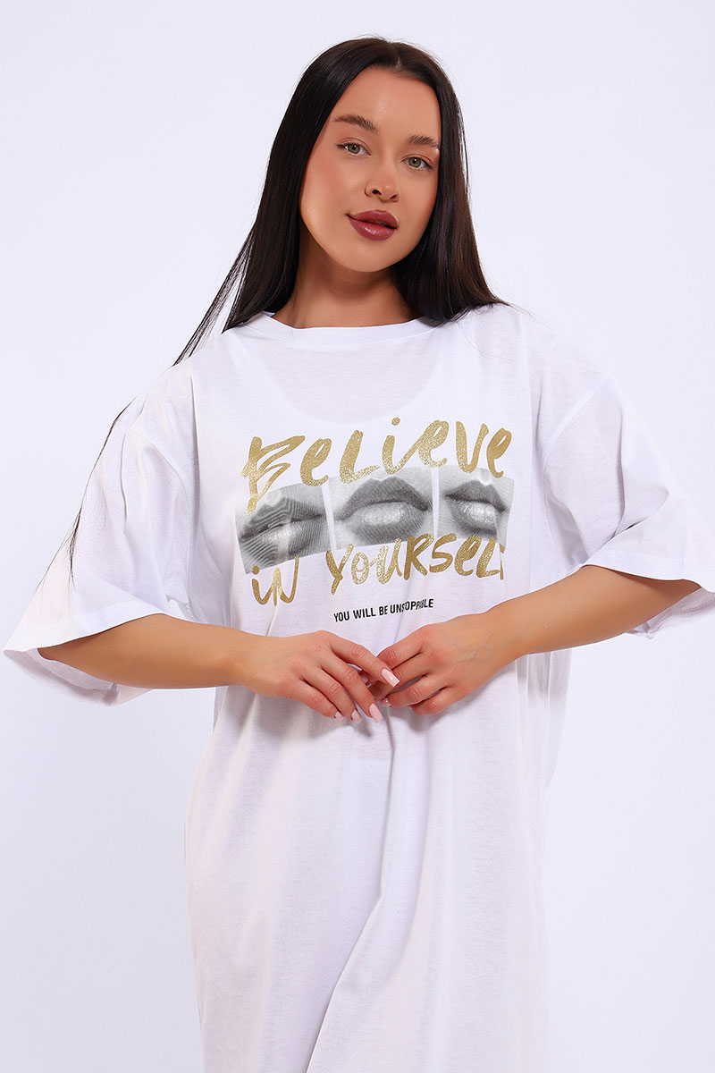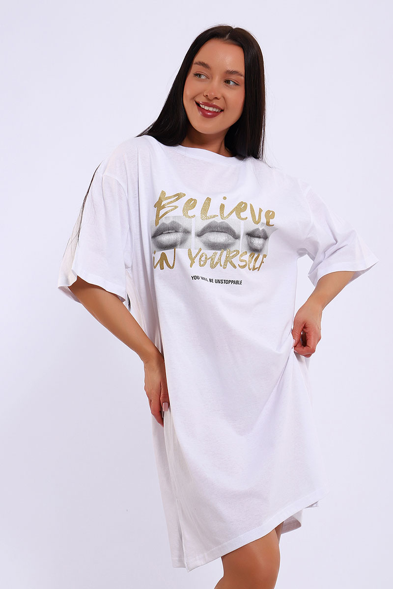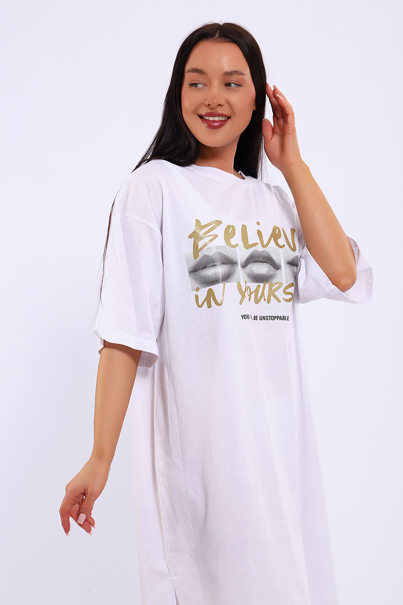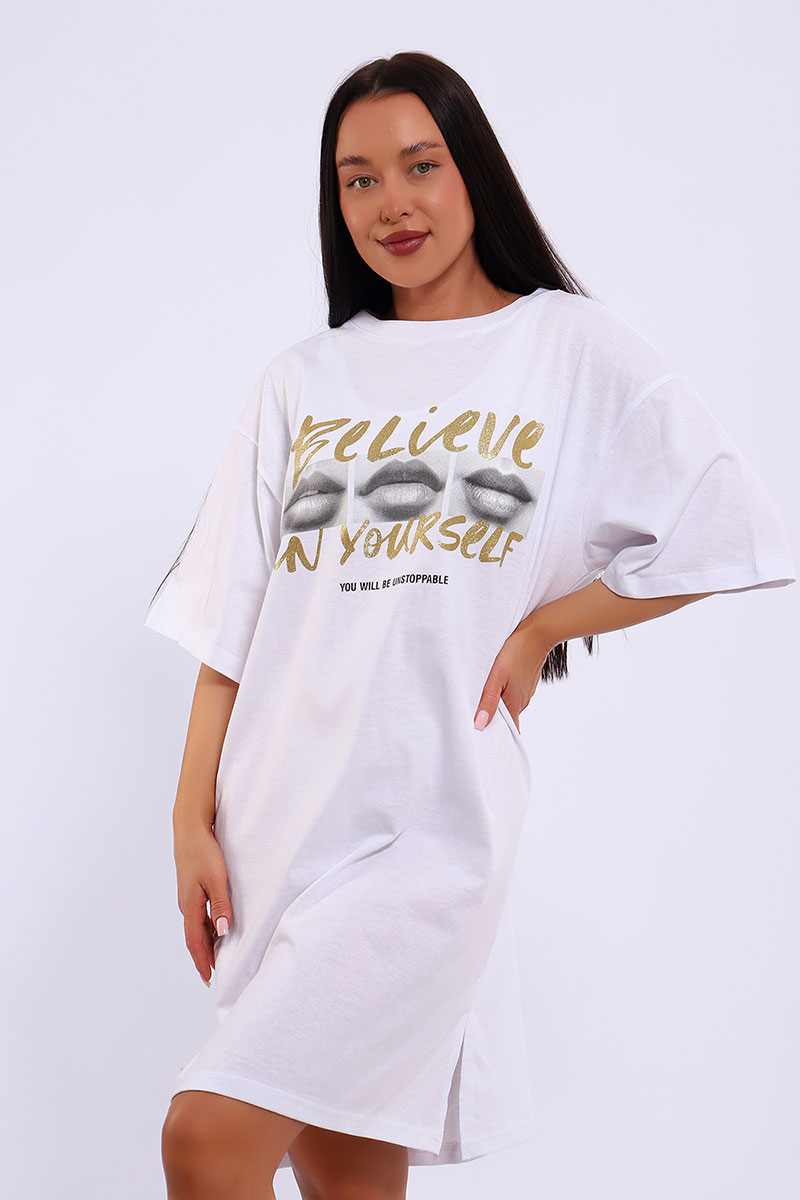 Представляем Вашему вниманию легкое летнее платье. Трикотажное платье-футболка формата Oversize, с забавным принтом на полочке. Платье идеально подойдет для любого летнего мероприятия, оно будет уместно как на пляже, так и на веселой вечеринке, прекрасно сочетается с шортами, велосипедками или лосинами. Трикотаж, из которого изготовлено платье, очень мягкий и нежный к коже и позволит хозяйке ощущать себя комфортно в любой ситуации!