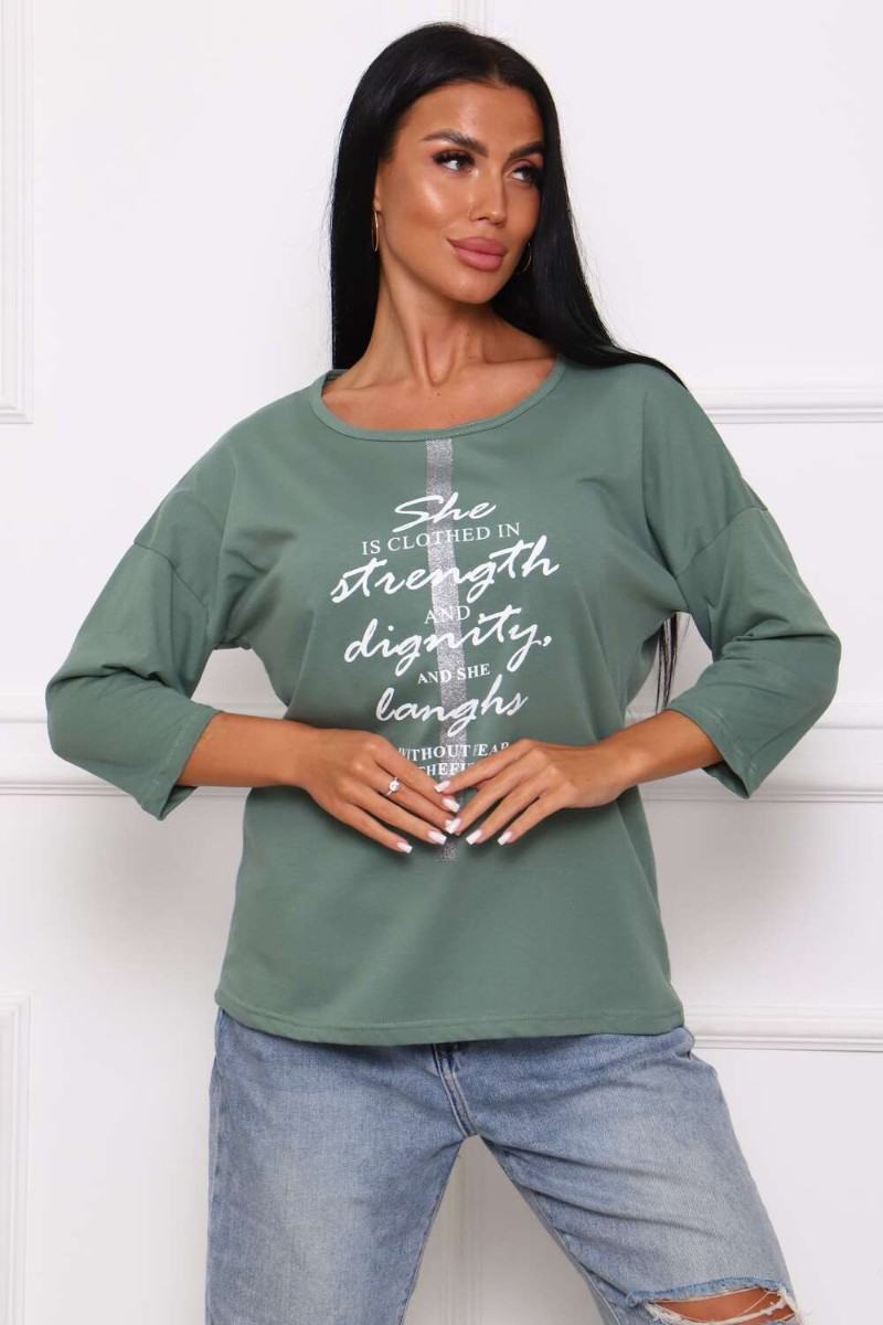 Представляем Вашему вниманию легкую женскую тунику. Ткань кулирка, хлопок 100%. Крой свободный, горловина круглой формы, обработана окантовкой. Линия плеч спущена. Длинна рукава 3/4, со швом по локтю. Низ изделия прямой. На полочке принт, шелкография.