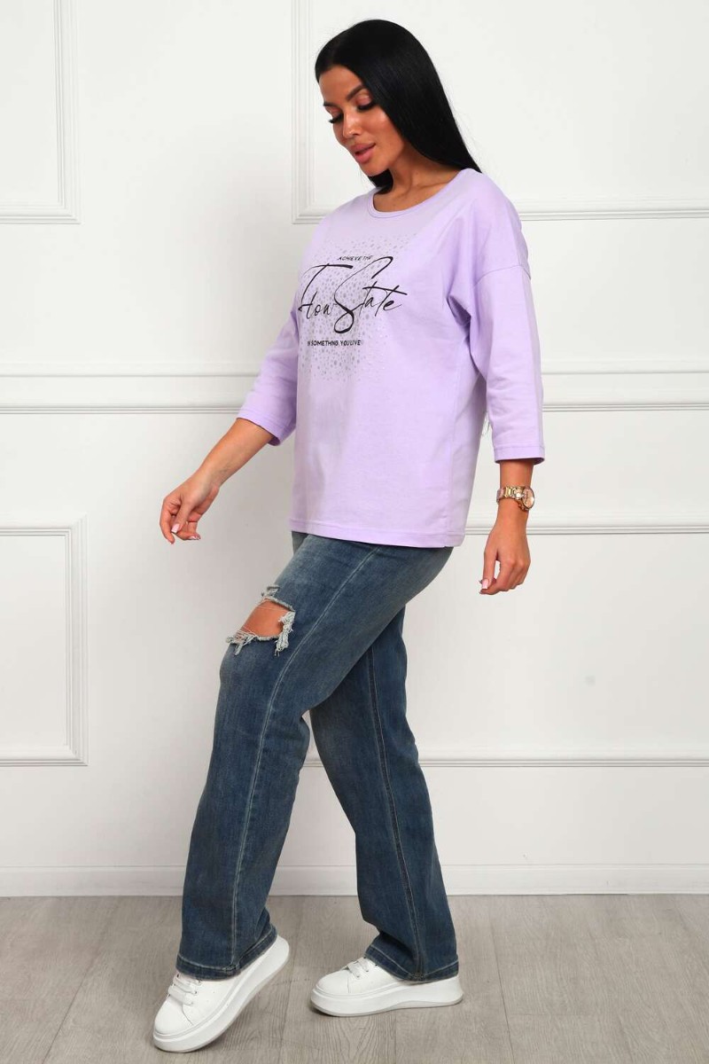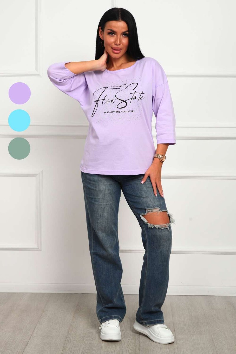 Представляем Вашему вниманию женскую тунику. Ткань кулирка, хлопок 100%. Крой свободный. горловина круглой формы, обработана окантовкой. Линия плеч спущена. Длинна рукава 3/4, со швом по локтю. Низ изделия прямой. На полочке принт, шелкография.