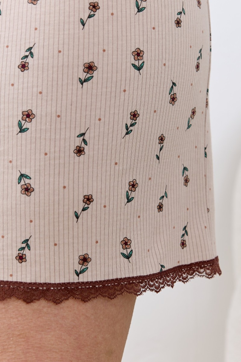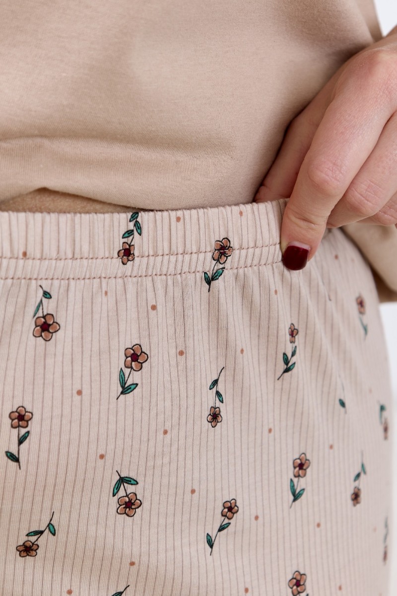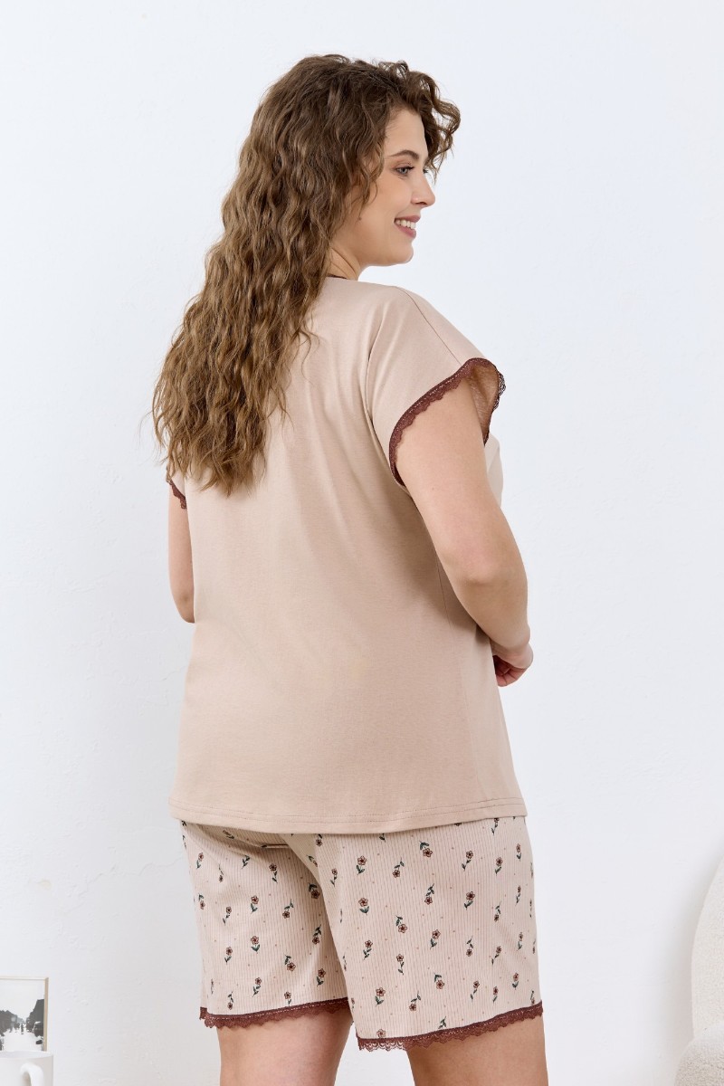 Представляем Вашему вниманию женскую пижаму из трикотажного полотна «кулирка» в комбинации двух видов: гладкокрашеного и с набивным рисунком, состоящая из футболки и шорт. Футболка – из гладкокрашеного полотна, с короткими цельнокроеными рукавами и горловиной овальной формы. Срезы горловины и рукавов обработаны узким кружевом контрастного цвета. На полочке выполнена печать в технике «шелкографии».Шорты – из полотна с набивным рисунком, свободные, классического покроя, средней длины, с эластичной тесьмой по талии и отделкой узким кружевом контрастного цвета по нижним срезам.
