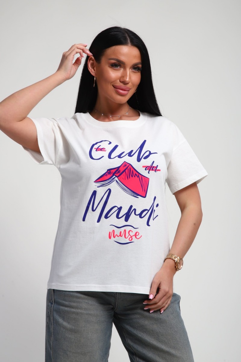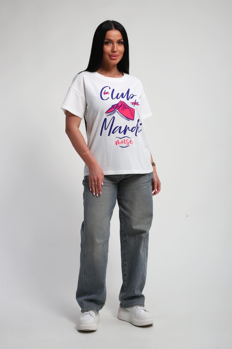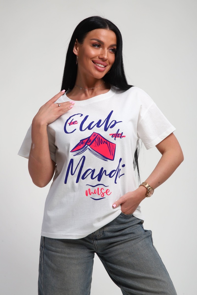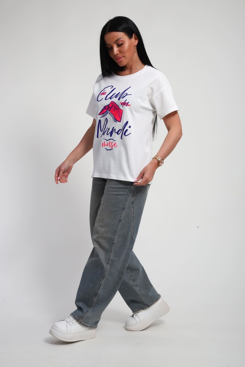 Представляем Вашему вниманию изящную женскую футболку из гладкокрашенного трикотажа, хлопок 100%. Прямого силуэта, свободного облегания. горловина круглой формы. Рукав короткий. Низ изделия прямой. На полочке объемный принт, шелкография.