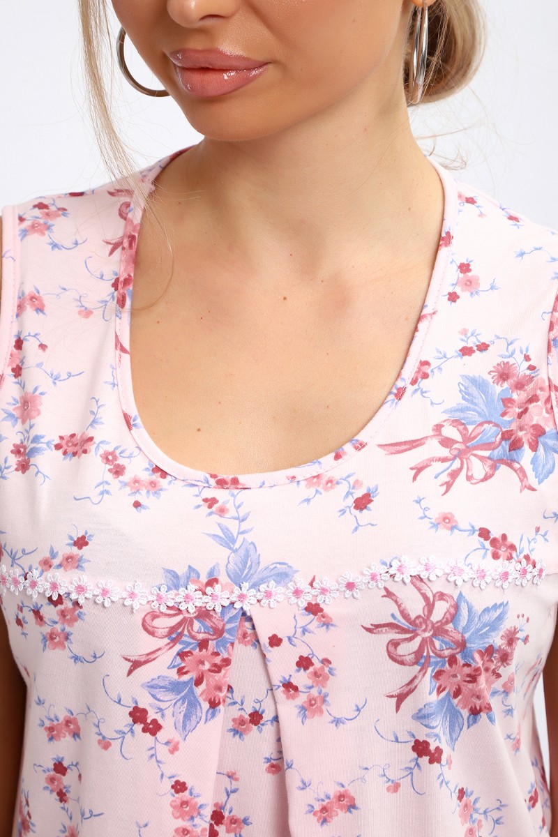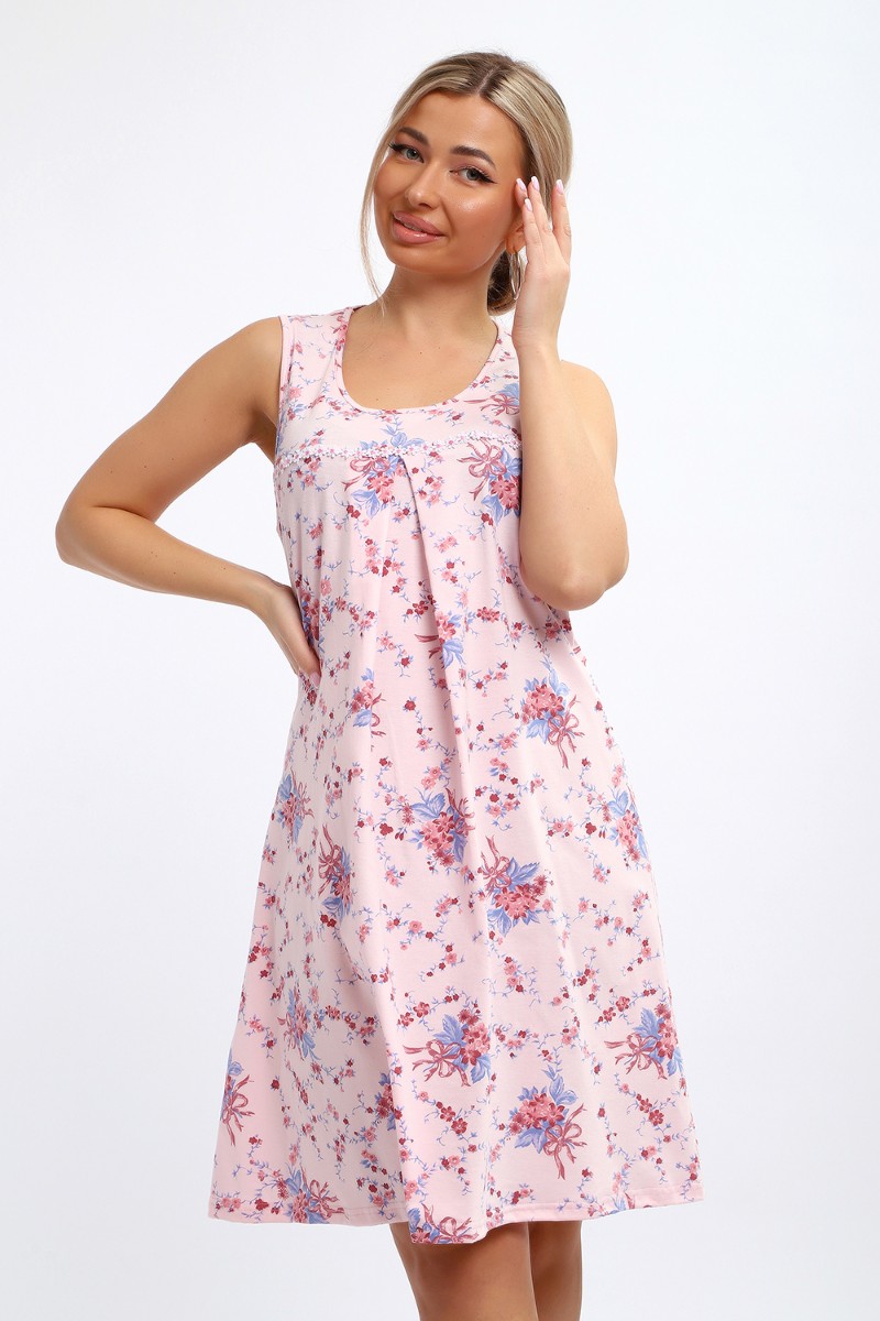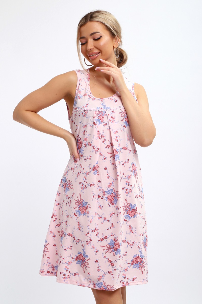 Представляем Вашему вниманию лёгкую женскую сорочку свободного покроя. Модель маечного типа, с кокеткой, без рукава. По кокетке нашиты декоративные ромашки. Под кокеткой на юбке встречная складка. Подходит для беременных.