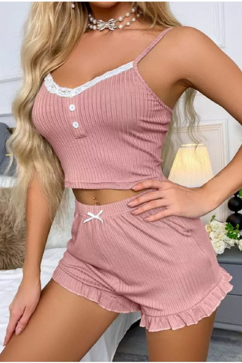 Представляем Вашему вниманию женскую пижаму из топа и шорт, которая позволит вам чувствовать себя дома красивой, современной, ухоженной и свободной. Сшита из эластичной ткани, которая отлично тянется и идеально ложится по фигуре,не стесняет движений! Эта пижама женская с шортами идеальна для дома, для дачи, а так же она подойдет для пижамной вечеринки. Этот стильный милый приятный комплект дополнит гардероб любой модницы.