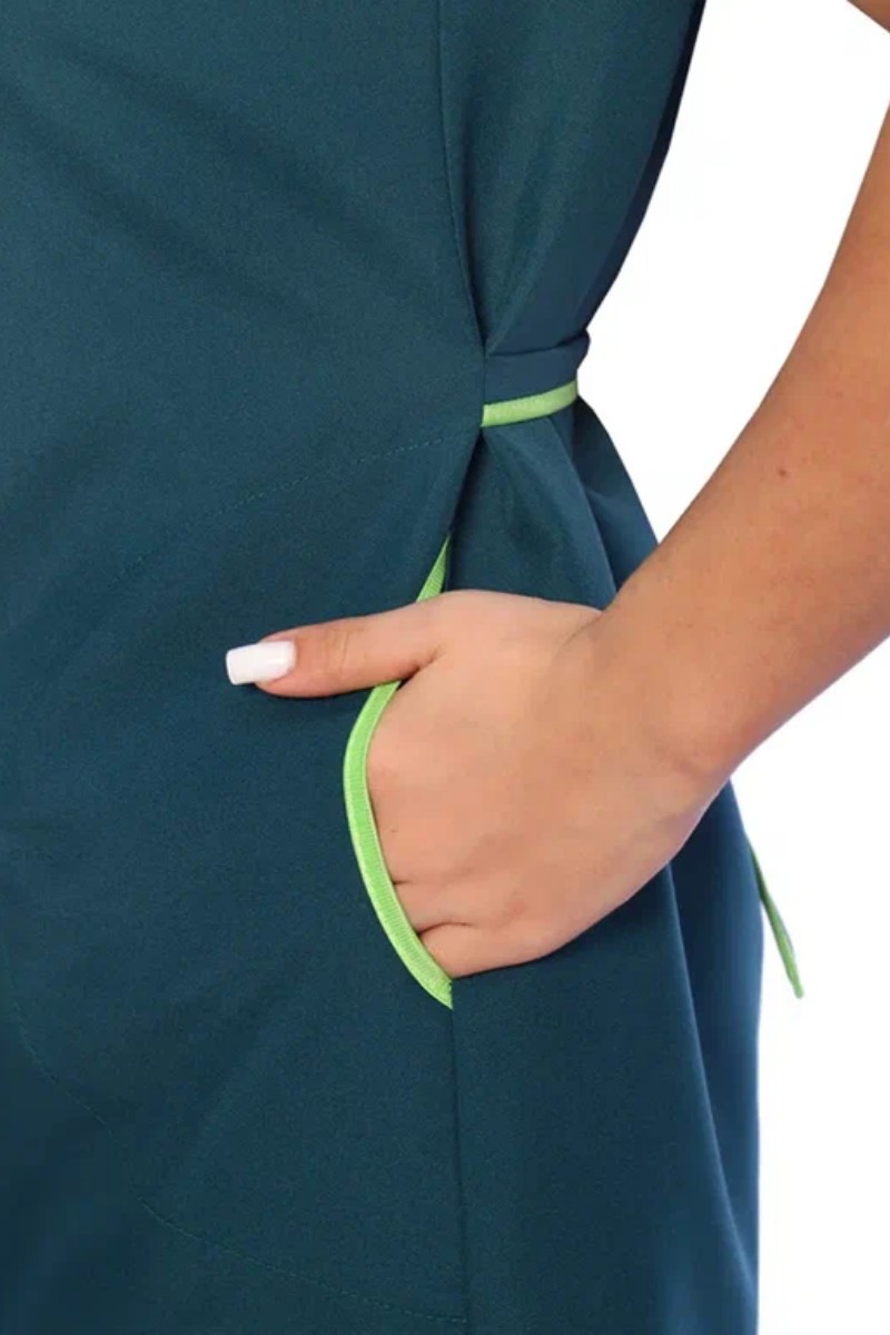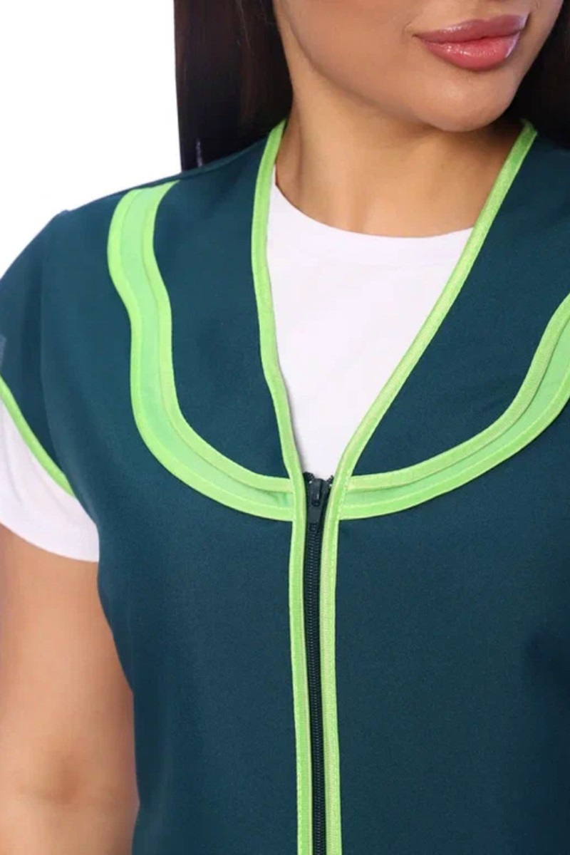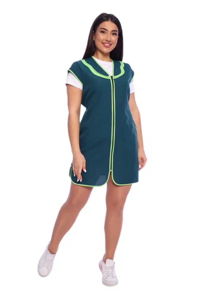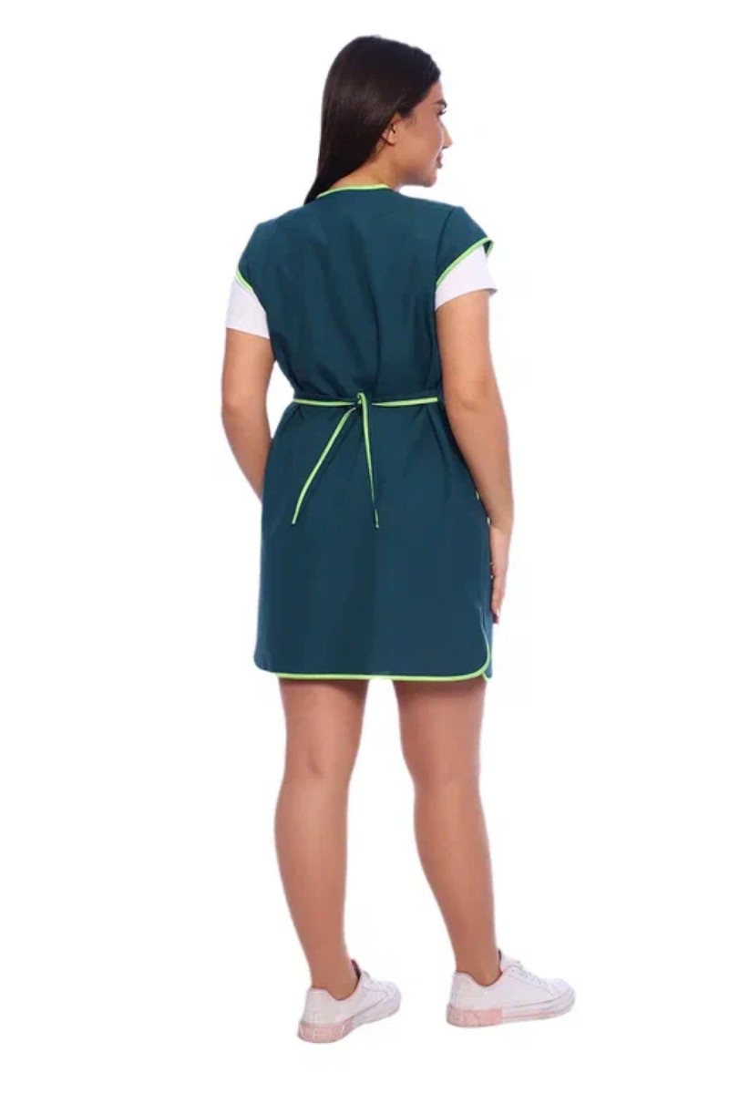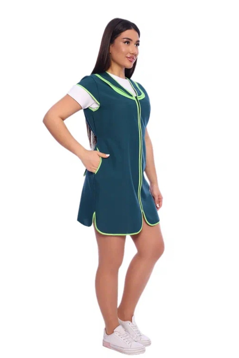 Представляем Вашему вниманию сарафан женский укороченный прямого силуэта с центральной застежкой на молнию и V-образным вырезом горловины. На полочках в боковых швах расположены вместительные карманы фигурной формы. Горловину подчеркивает двойной фигурный воротник с отделкой из контрастного материала. Спинка без отделки с двумя завязывающими полупоясами для регулировки объема по линии талии. Все срезы сарафана обработаны контрастным прочным нейлоновым кантом, предохраняющим срезы от осыпания. Сарафан предназначен для защиты от общепроизводственных загрязнений.