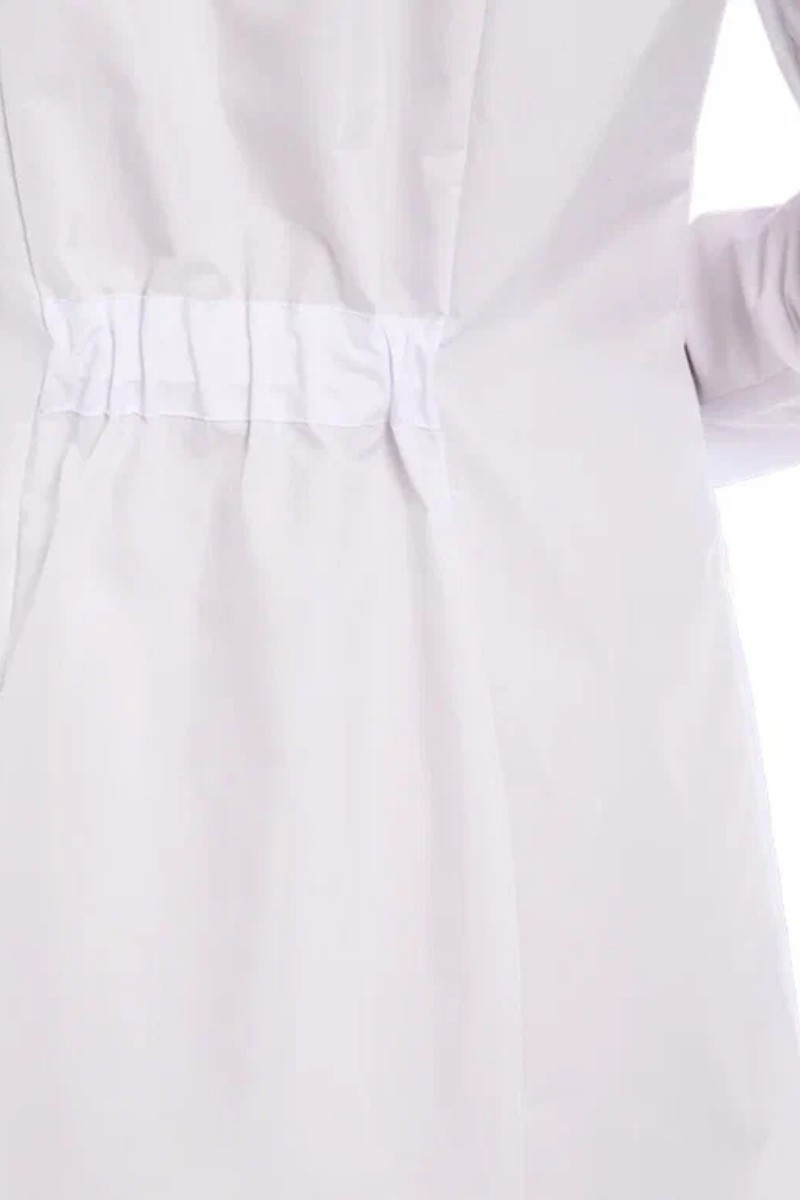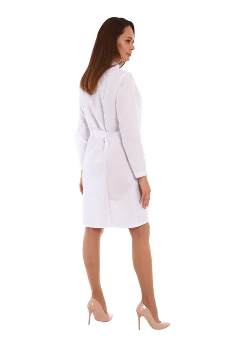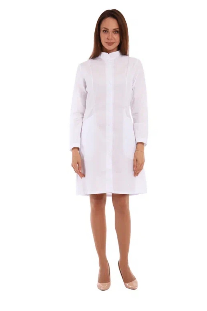 Представляем Вашему вниманию халат медицинский женский средней длины, прилегающего силуэта с центральной бортовой застежкой на кнопки. Комфортная посадка на фигуре обеспечивается за счет рельефов, выходящих из плечевых швов на полочке и спинке. Аккуратный воротник-стойка, внутренние карманы в рельефном шве придают изделию простоту и элегантность. Линию талии в центральной части спинки эффектно подчеркивает эластичный пояс. Рукав втачной, длинный. Халат прекрасно подойдет для тех, кто ценит простоту, практичность и комфорт.