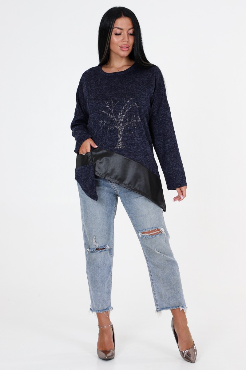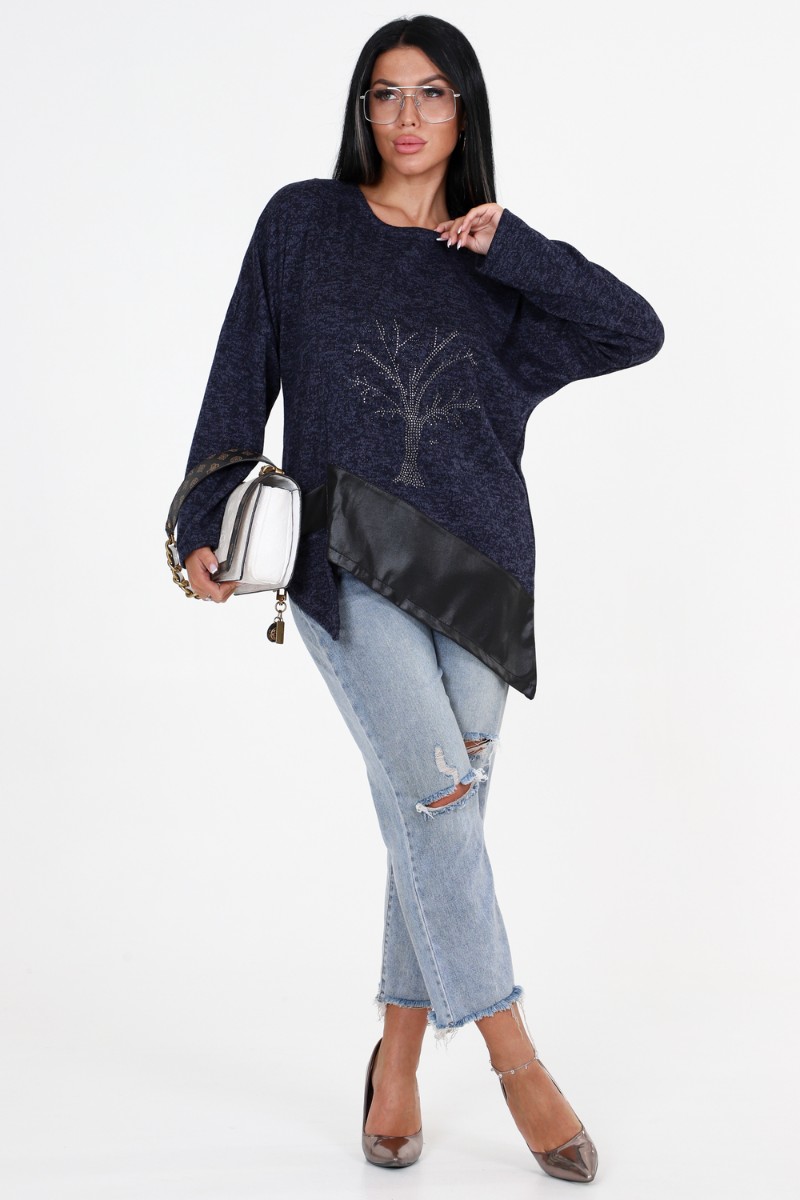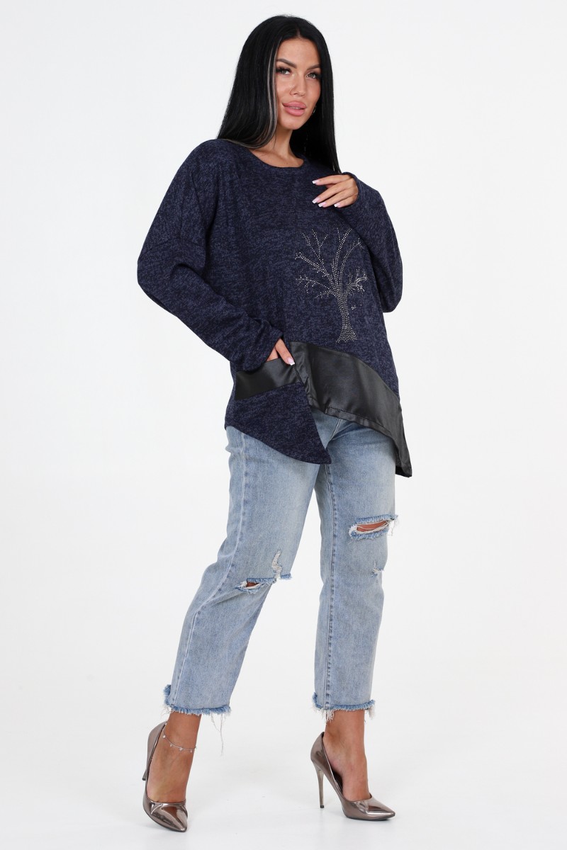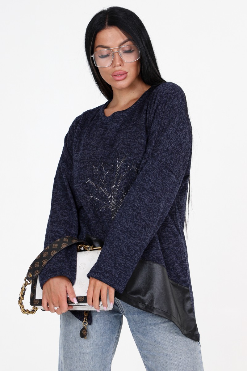 Представляем Вашему вниманию женскую тунику свободного кроя с впечатляющими деталями! Наша уникальная туника имеет прекрасно украшенную полочку со стразами и вставками из стретч-кожи, которые придают ей особый шарм. Низ изделия имеет фигурную отделку, добавляющую дополнительный элемент стиля. Спущенные длинные рукава прекрасно дополняют общий образ.