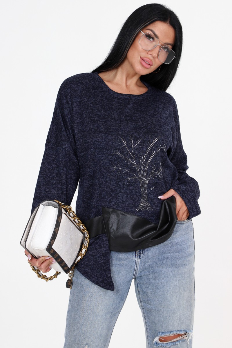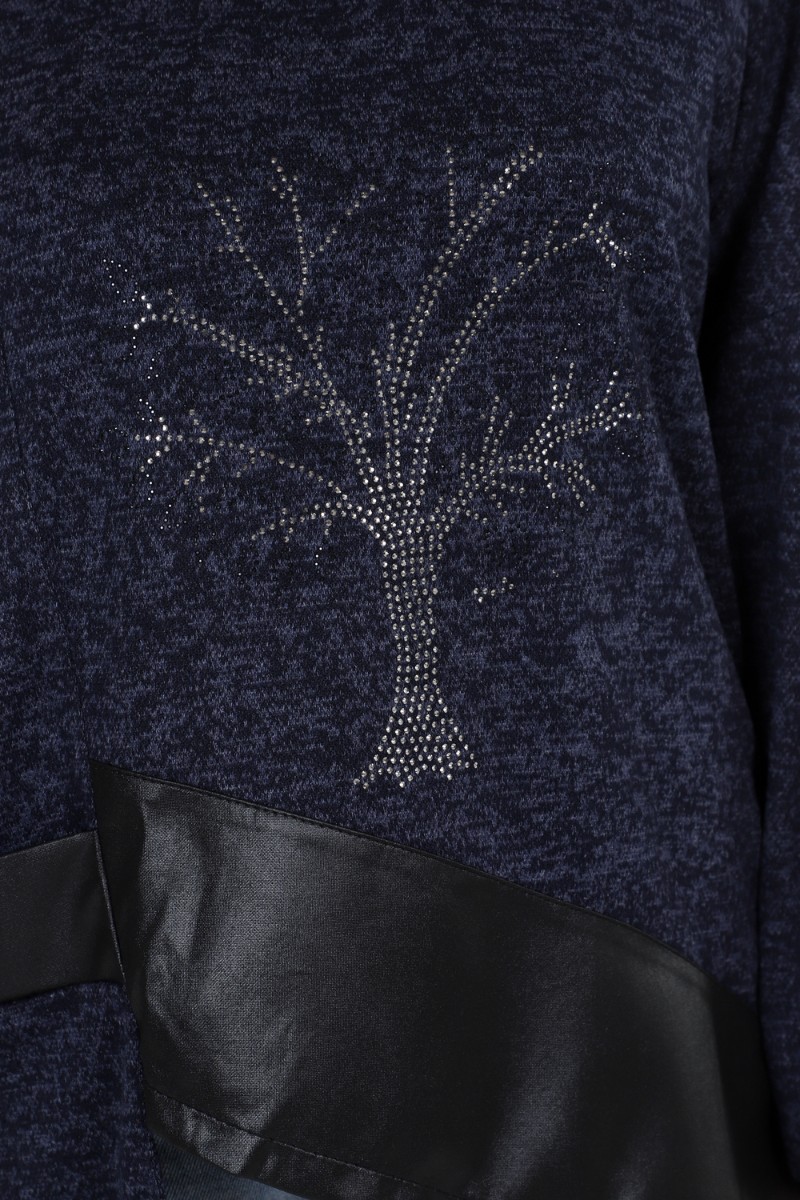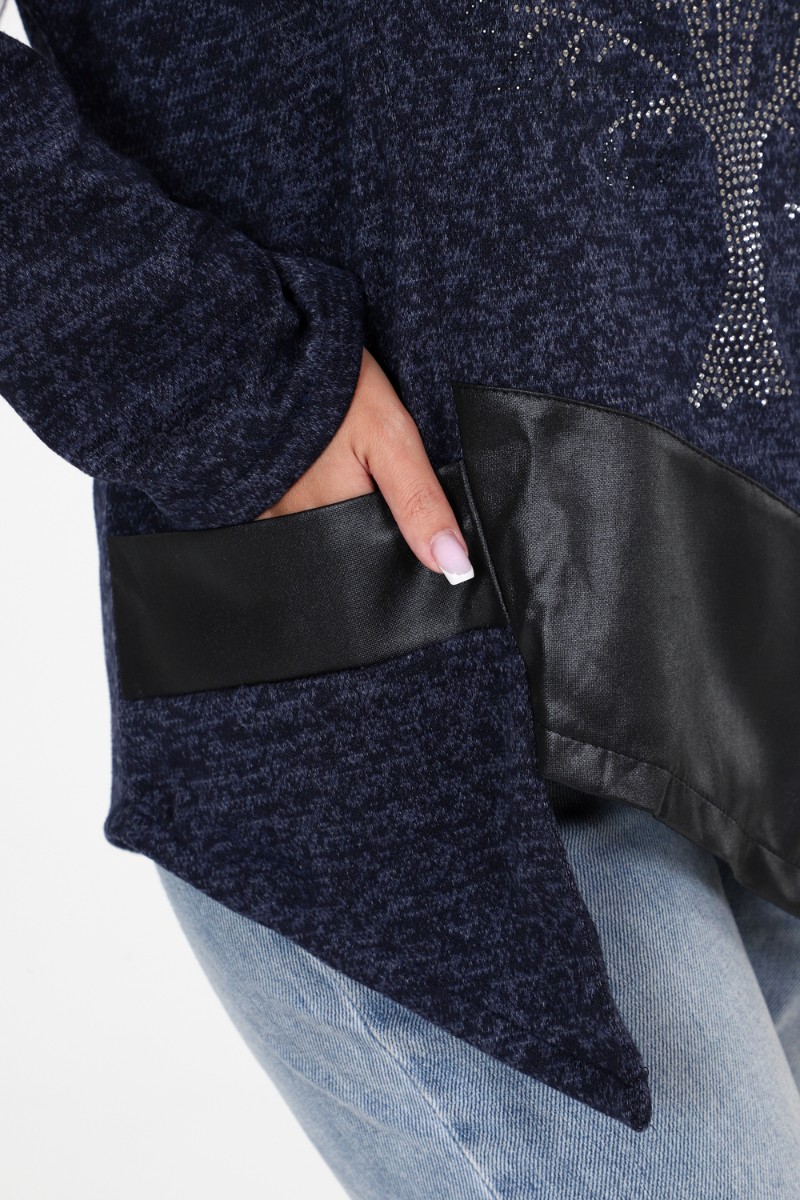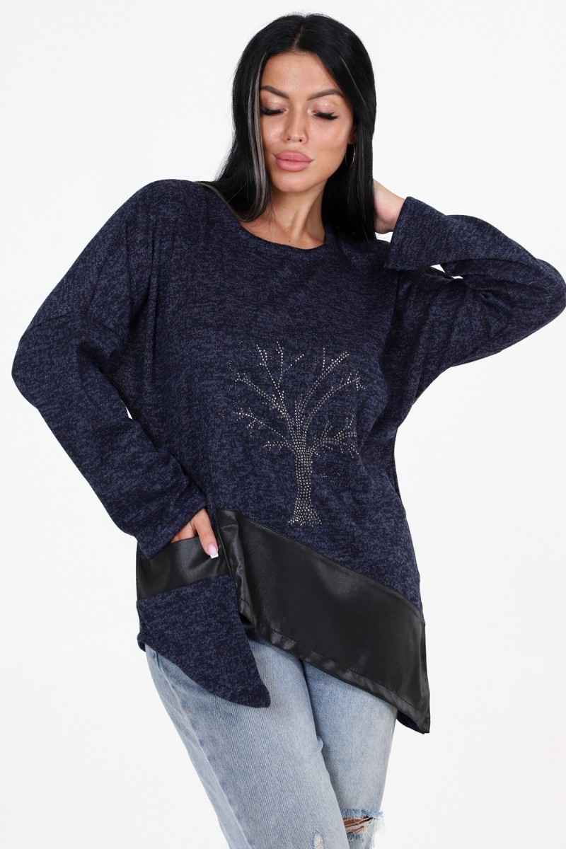 Представляем Вашему вниманию женскую тунику свободного кроя с впечатляющими деталями! Наша уникальная туника имеет прекрасно украшенную полочку со стразами и вставками из стретч-кожи, которые придают ей особый шарм. Низ изделия имеет фигурную отделку, добавляющую дополнительный элемент стиля. Спущенные длинные рукава прекрасно дополняют общий образ.
