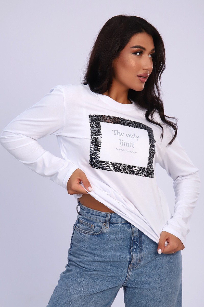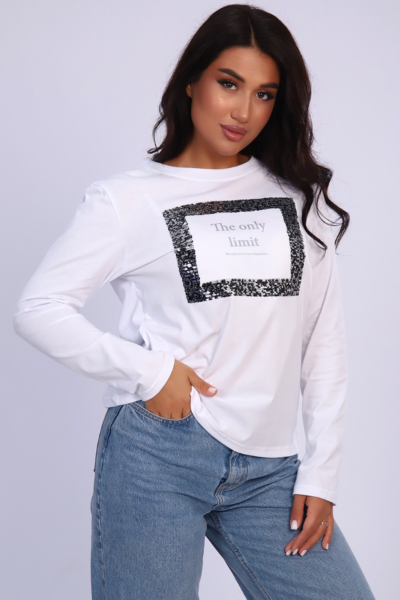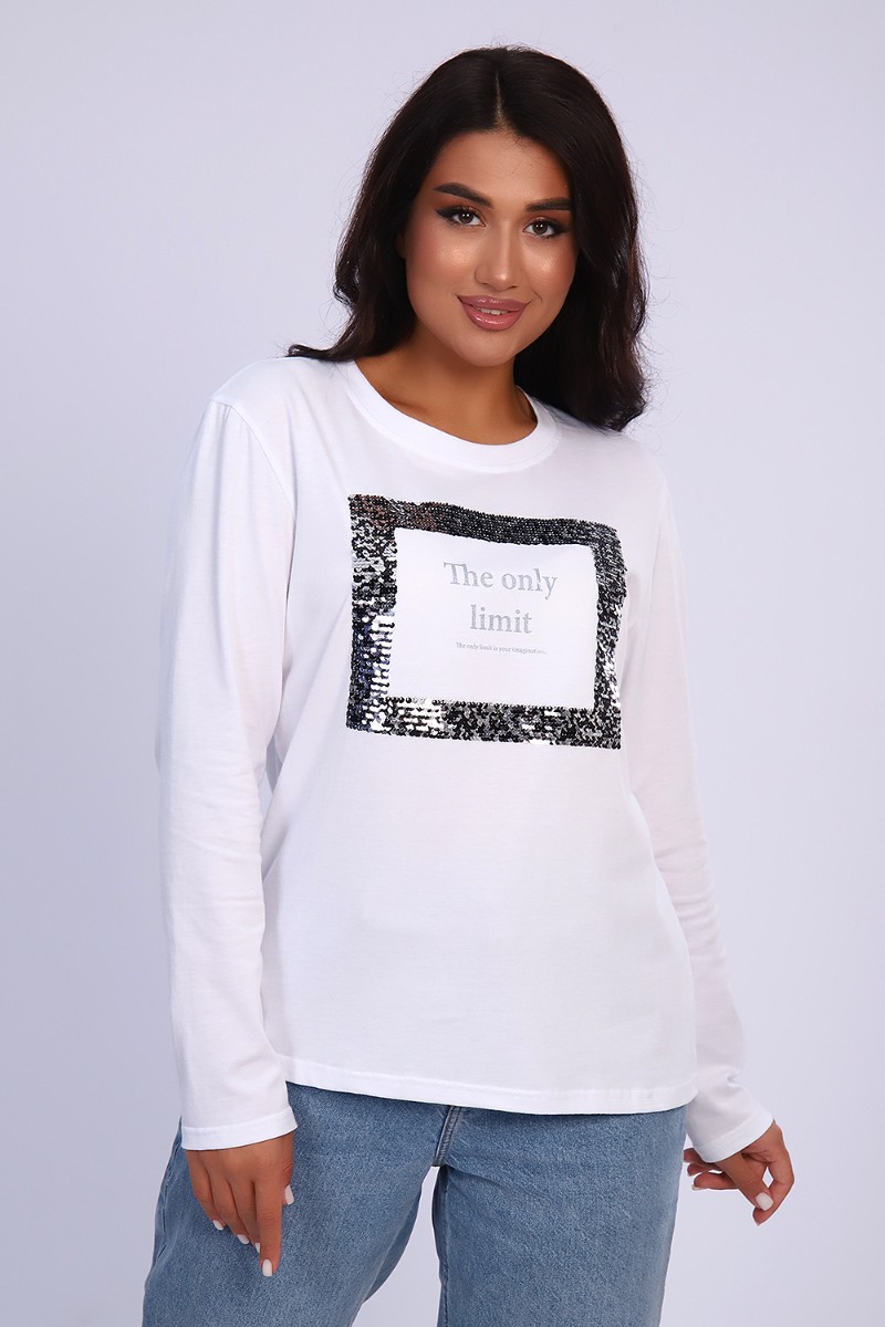Представляем Вашему вниманию изящную женскую футболку с длинным рукавом, полуприлегающего силуэта, с качественным принтом из пайеток. Можно удачно совместить с джинсами, юбками, брюками, хорошо смотрится с пиджаком или кардиганом. Модный, современный дизайн не стесняет движений, кожа дышит.