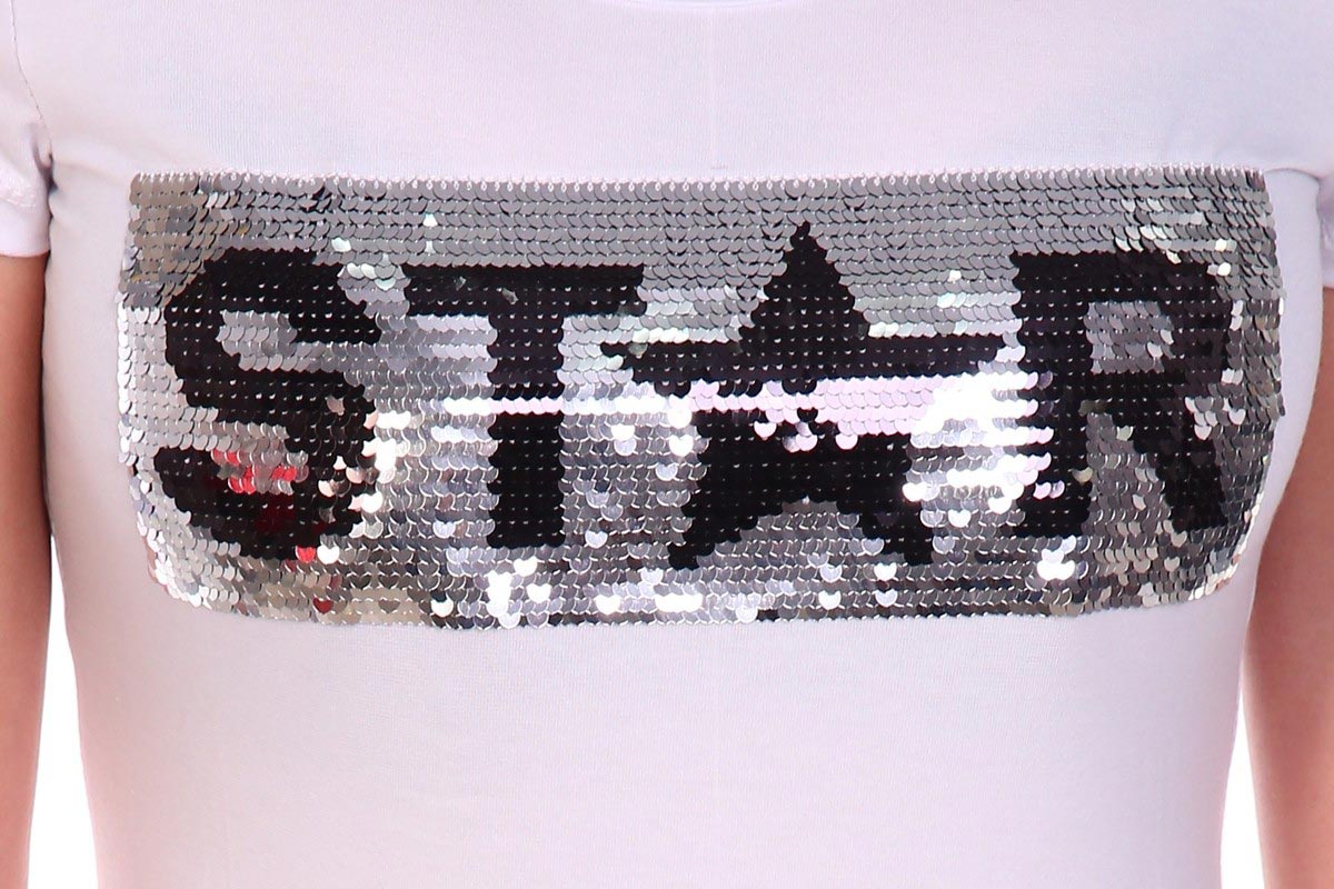 Представляем Вашему вниманию оригинальную женскую футболку. Футболка полуприлегающего силуэта, с округлой горловиной, длиной до середины бедра. Рукав втачной короткий. Горловина обработана бейкой из основного полотна. Пайетки двусторонние. Изделие удобное и комфортное для повседневной носки.