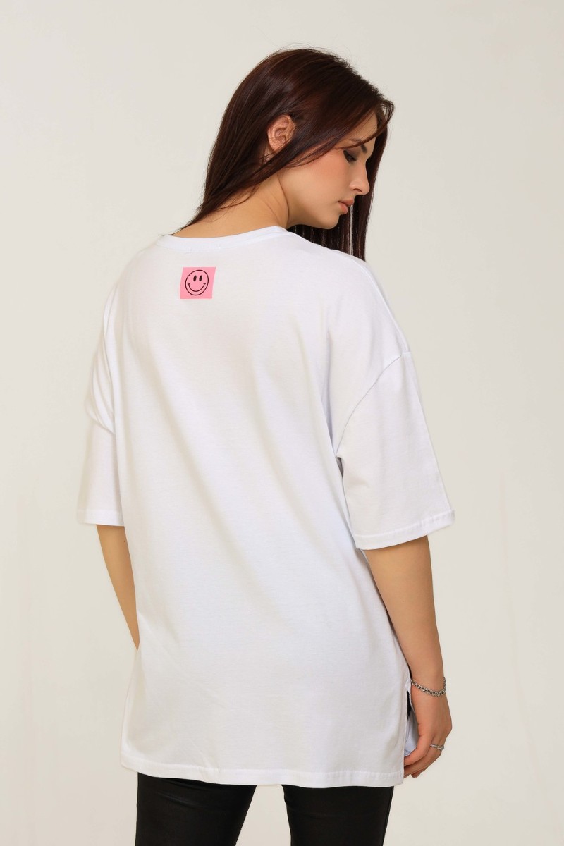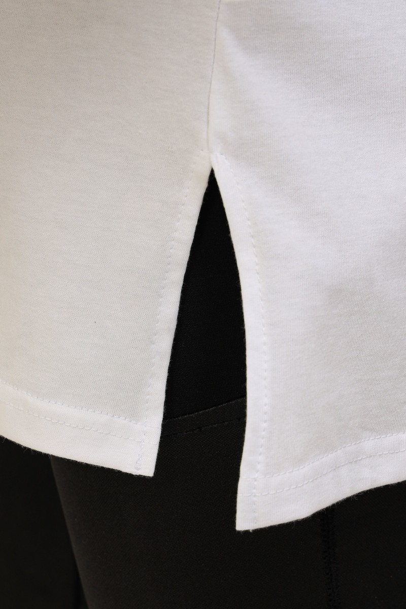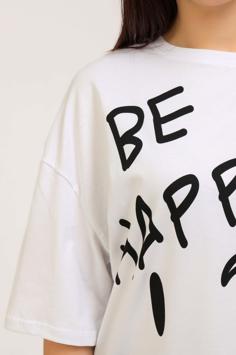 Представляем Вашему вниманию удлиненную женскую футболку длиной до середины бедра. Модели такой длины прекрасно смотрятся с брюками-дудочками, велосипедками или облегающими джинсами. В прохладную погоду хорошо будет смотреться в паре с утепленной жилеткой или курткой. На модели черного цвета нанесена печать глитером, который сверкает на солнце как алмазы, на остальных цветах печать в черном цвете, которая прекрасно контрастирует со светлыми тонами изделия.