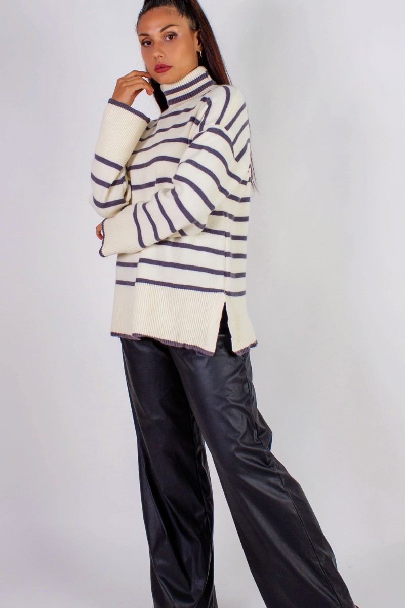 Представляем Вашему вниманию стильный и уютный джемпер в полоску станет идеальным дополнением вашего гардероба. Изготовлен из качественной акриловой плотной пряжи, джемпер отличается не только своим актуальным дизайном, но и приятными тактильными ощущениями. Он мягкий на ощупь и абсолютно не колется, что сделает его идеальным вариантом для повседневной носки, а также для создания стильных образов в прохладную погоду. Высокое горло джемпера аккуратно смотрится, обеспечивая дополнительный комфорт и защиту от холода. Свободный крой оверсайз и длина обеспечивают максимальный комфорт и свободу движений, скроет возможные недостатки фигуры делая ее более утонченной. Разрезы по бокам добавляют оригинальности и подчеркивают внимание к деталям. Низ, манжеты и горло выполнены из пряжи с одинаковой вязкой, что создает гармоничный и завершенный образ. Такой джемпер отлично сочетается как с лосинами, джинсами и брюками, так и с юбками, что делает его универсальным решением для разных случаев - от офисных будней до уютных встреч с друзьями. Доступный в актуальном оверсайз-формате, он хорошо подходит для размеров 44-52, обеспечивая модный вид на любой фигуре. Следует отметить что чем больше Ваш размер, тем менее будет выражен эффект оверсайз. При правильном уходе (режим ручная стирка и горизонтальная сушка) вы сможете оценить его износостойкость. Не упустите возможность пополнить свой гардероб этим джемпером, который будет радовать вас своим качеством и стилем не один сезон.