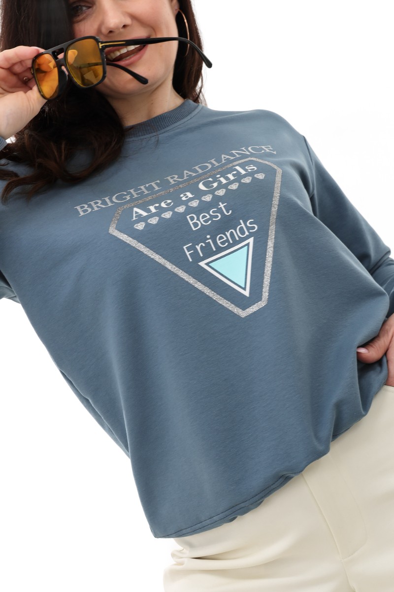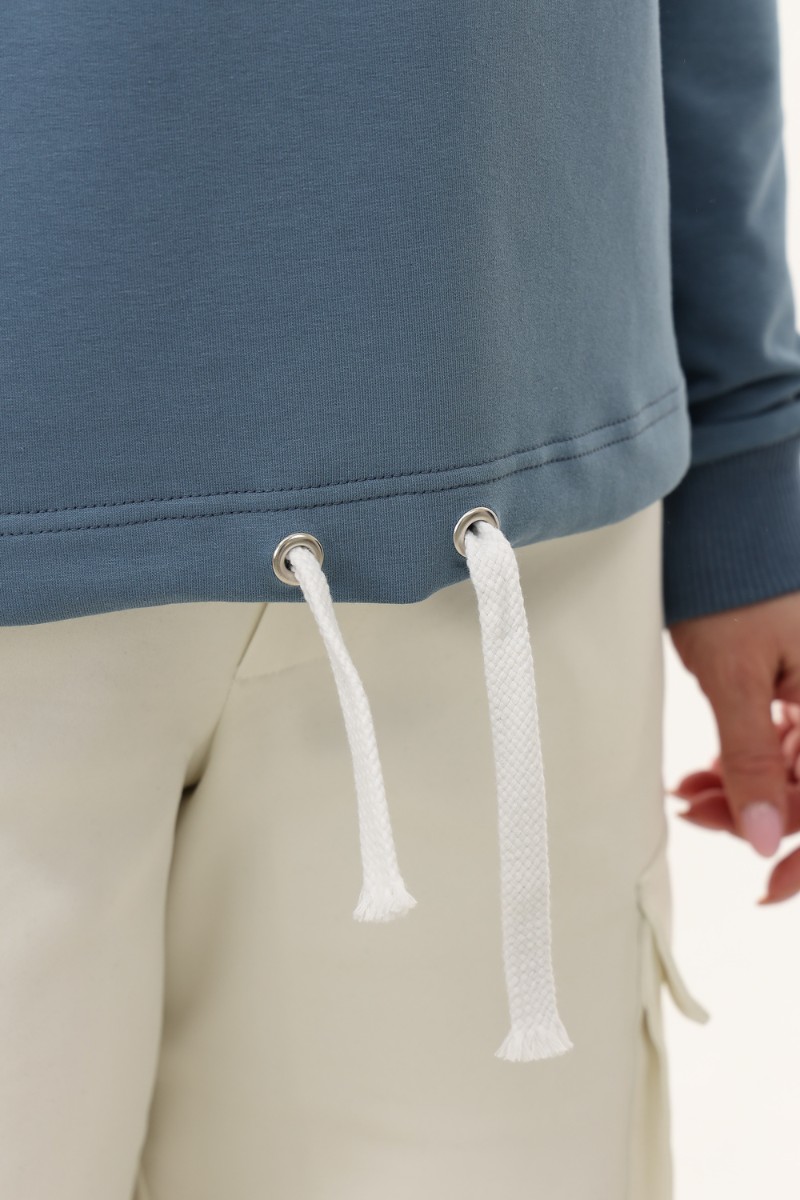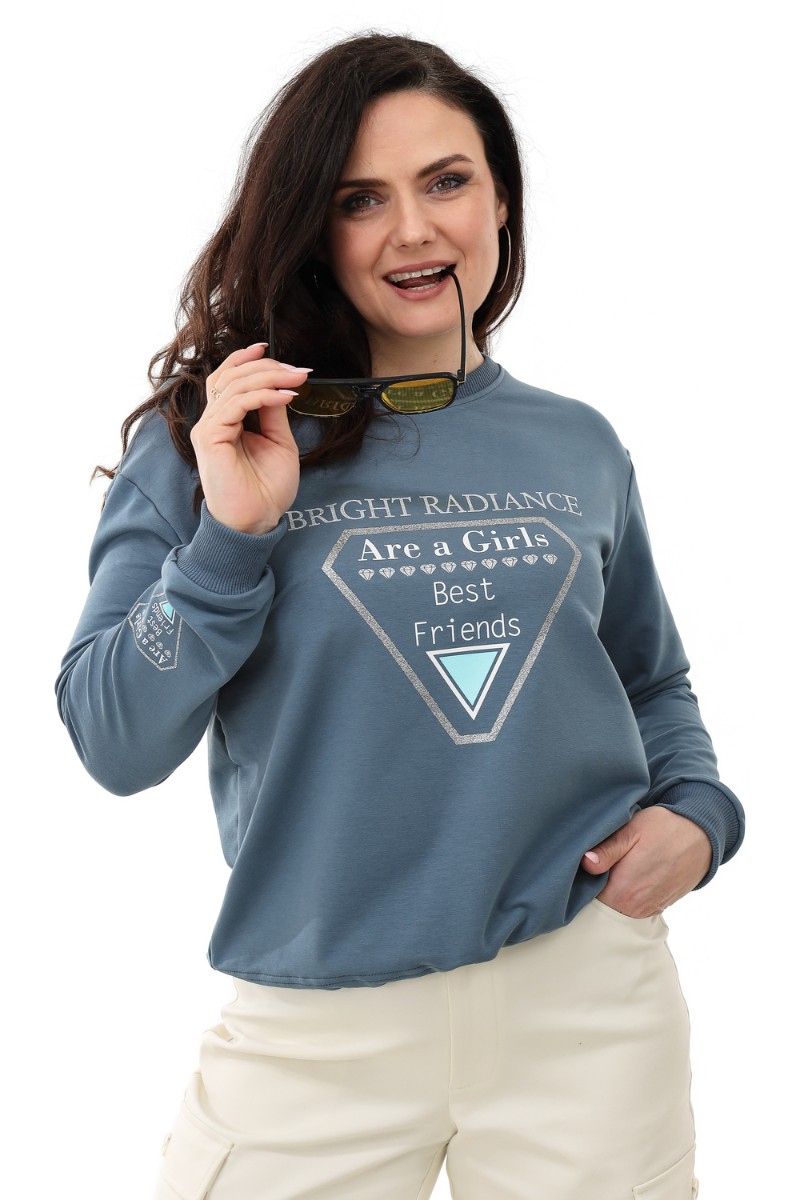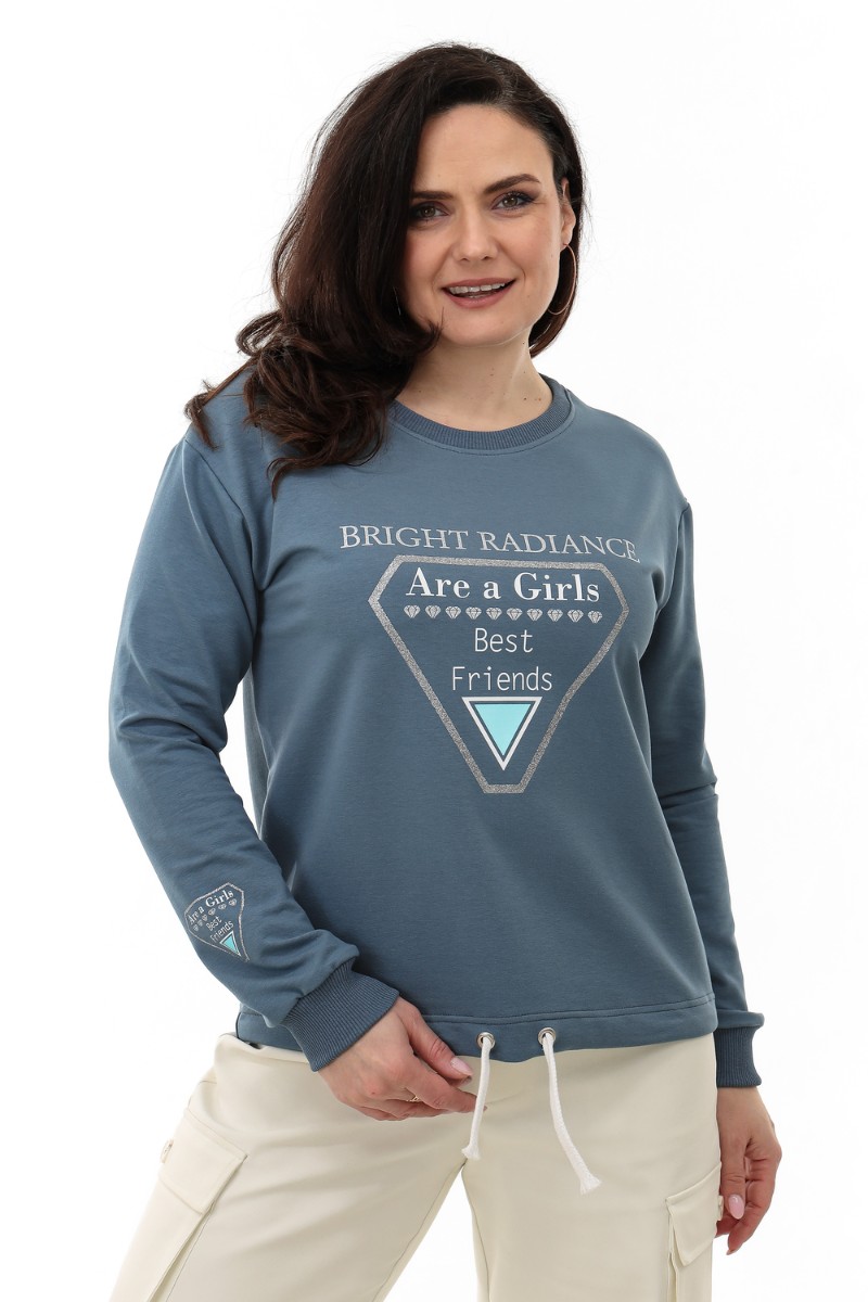 Представляем Вашему вниманию свитшот свободного силуэта, прямого кроя. На переде печать с серебром, которое будет эффектно искриться на солнце. Линия плеча спущена. Манжеты из кашкорсе подобраны в тон ткани. Низ изделия регулируется шнуром.