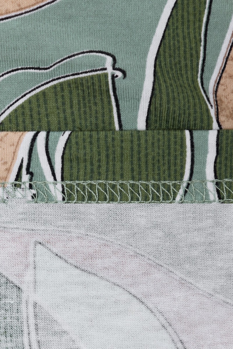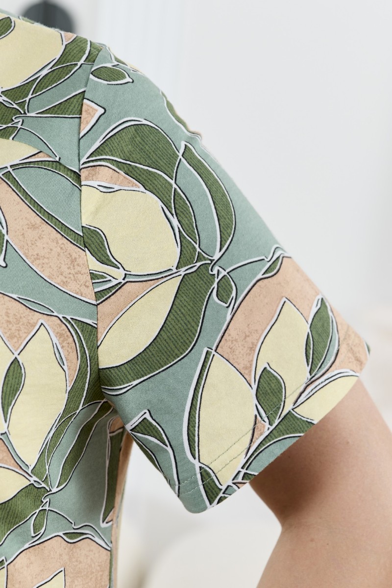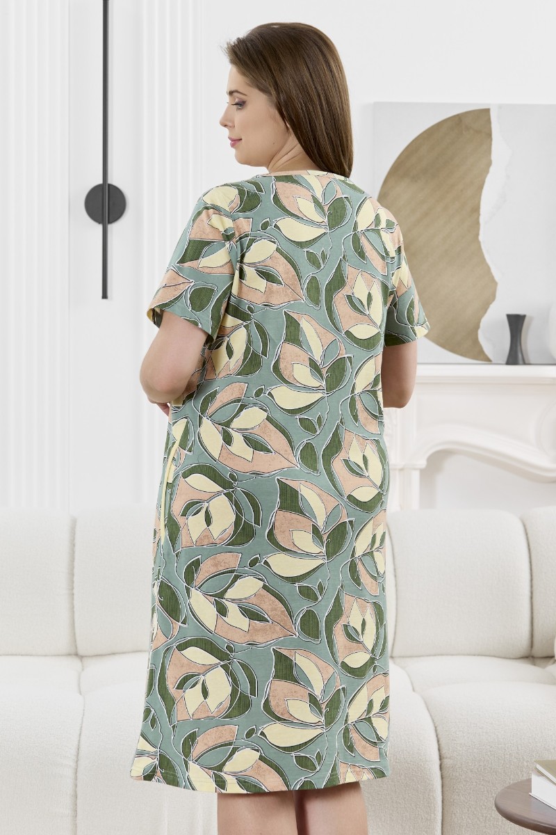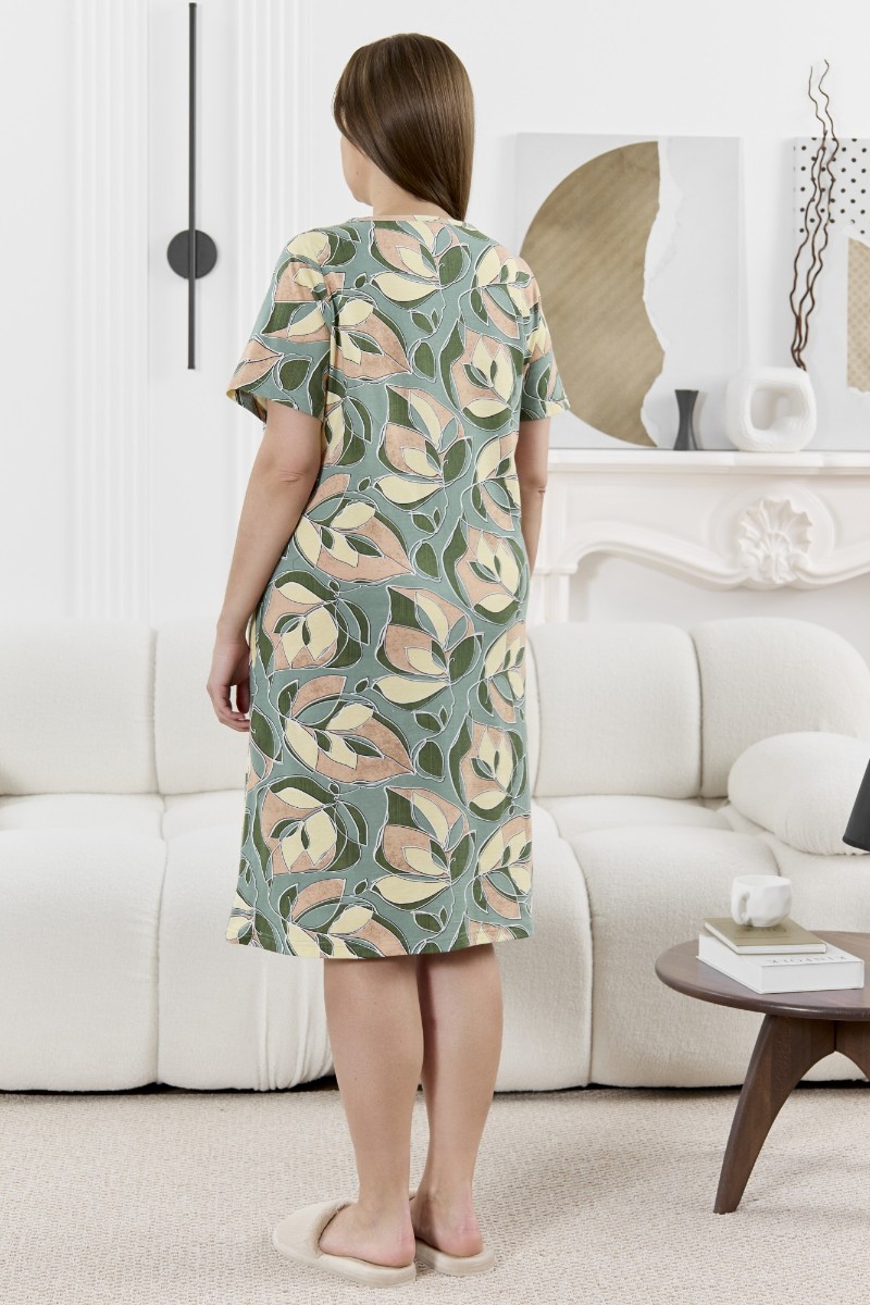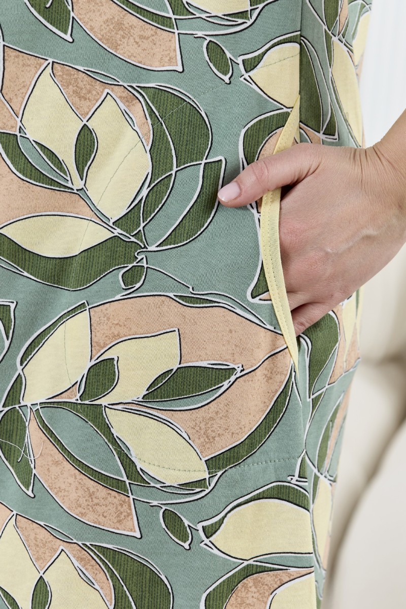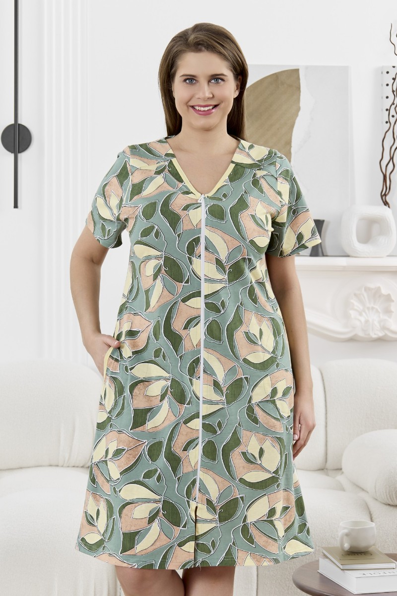 Представляем Вашему вниманию халат женский из трикотажного полотна «кулирка» с набивным рисунком, прямого силуэта, с короткими втачными рукавами, горловиной V- образной формы, карманами в боковых швах и центральной бортовой застежкой на тесьму «молния». Полочка – с двумя небольшими двойными кокетками, выполненными по косой линии. Горловина переда, входы в карманы окантованы контрастным материалом.