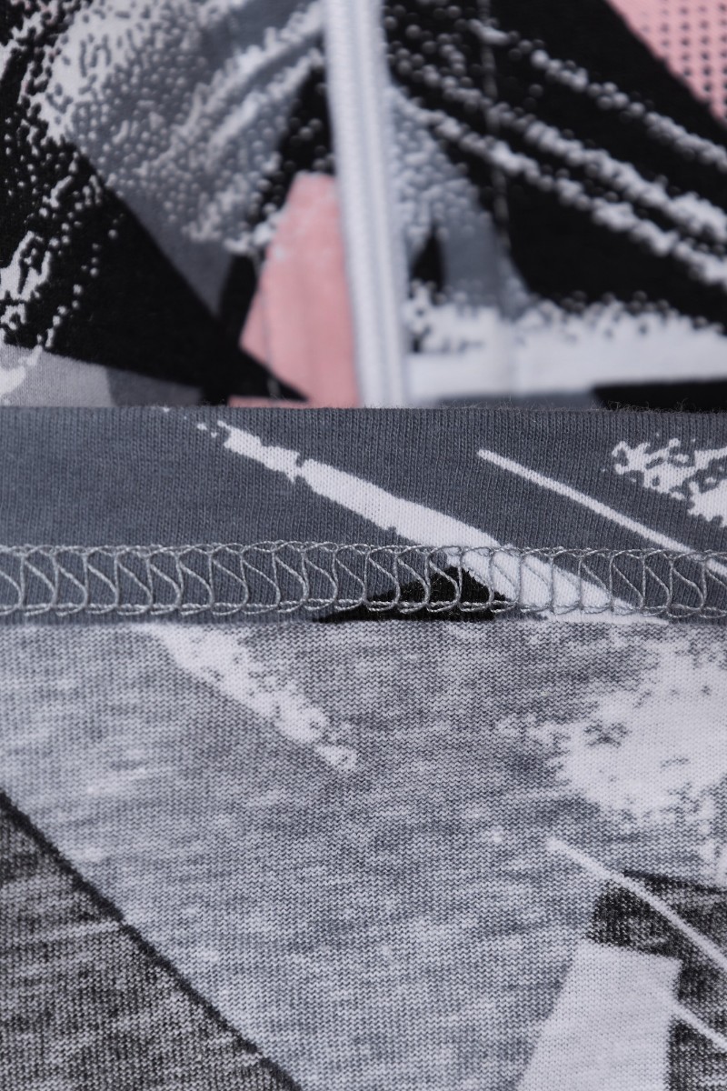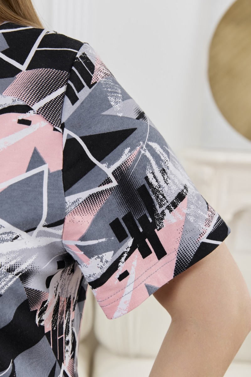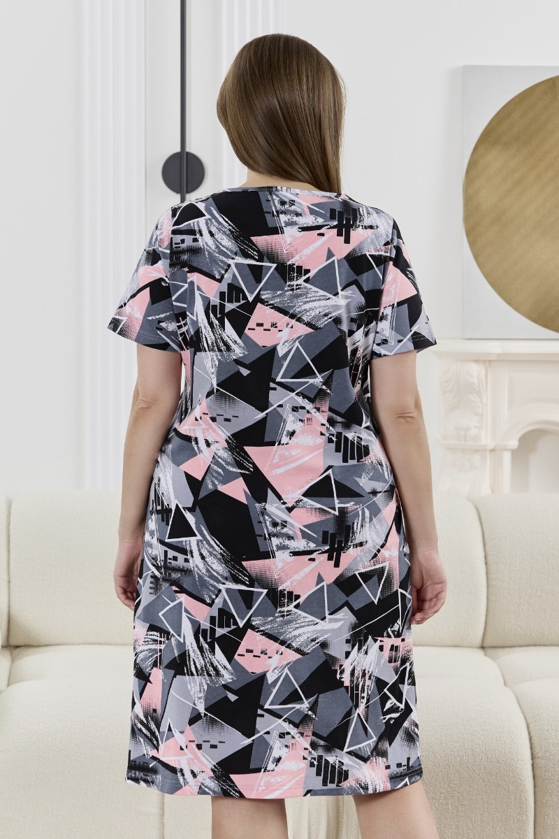 Представляем Вашему вниманию халат женский из трикотажного полотна «кулирка» с набивным рисунком, прямого силуэта, с короткими втачными рукавами, горловиной V- образной формы, карманами в боковых швах и центральной бортовой застежкой на тесьму «молния». Полочка – с двумя небольшими двойными кокетками, выполненными по косой линии. Горловина переда, входы в карманы окантованы контрастным материалом.