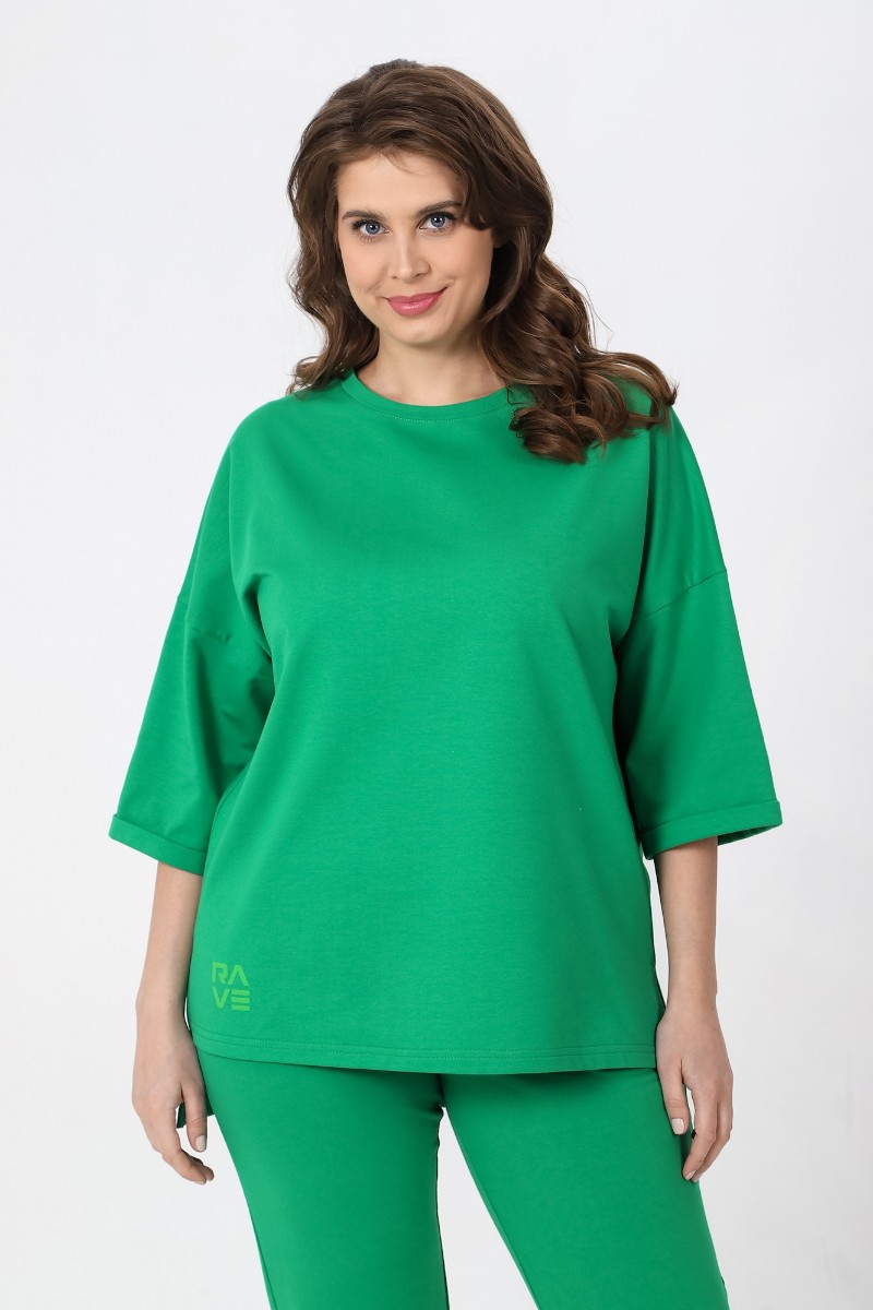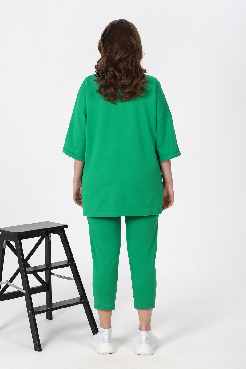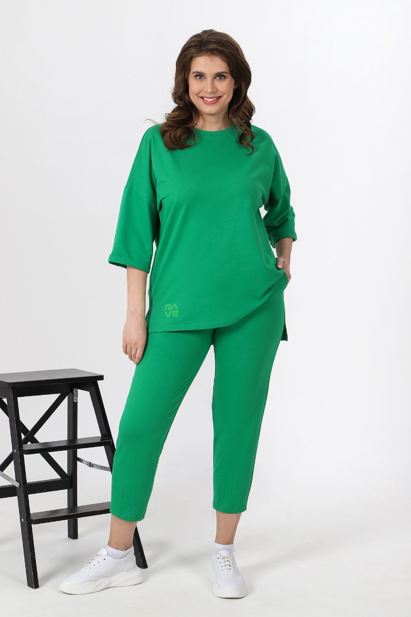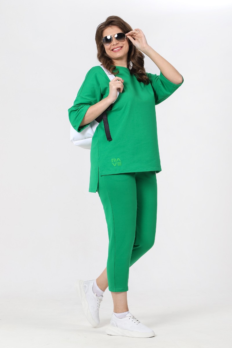 Представляем Вашему вниманию костюм из гладкокрашеного трикотажного полотна «футер-двунитка», состоящий из джемпера и брюк. Джемпер – свободного покроя, с рукавами на основе цельнокроеных длиной до локтя, горловиной овальной формы, обработанной втачной планкой, разрезами в боковых швах и принтом на полочке. Рукава – с цельнокроеными манжетами-отворотами. Модный элемент - разность длины полочки и спинки на 10 см. Брюки – укороченные, на притачном поясе с эластичной тесьмой внутри и карманами в боковых швах. На нижних частях передних и задних половин обработаны по две вертикальные вытачки.