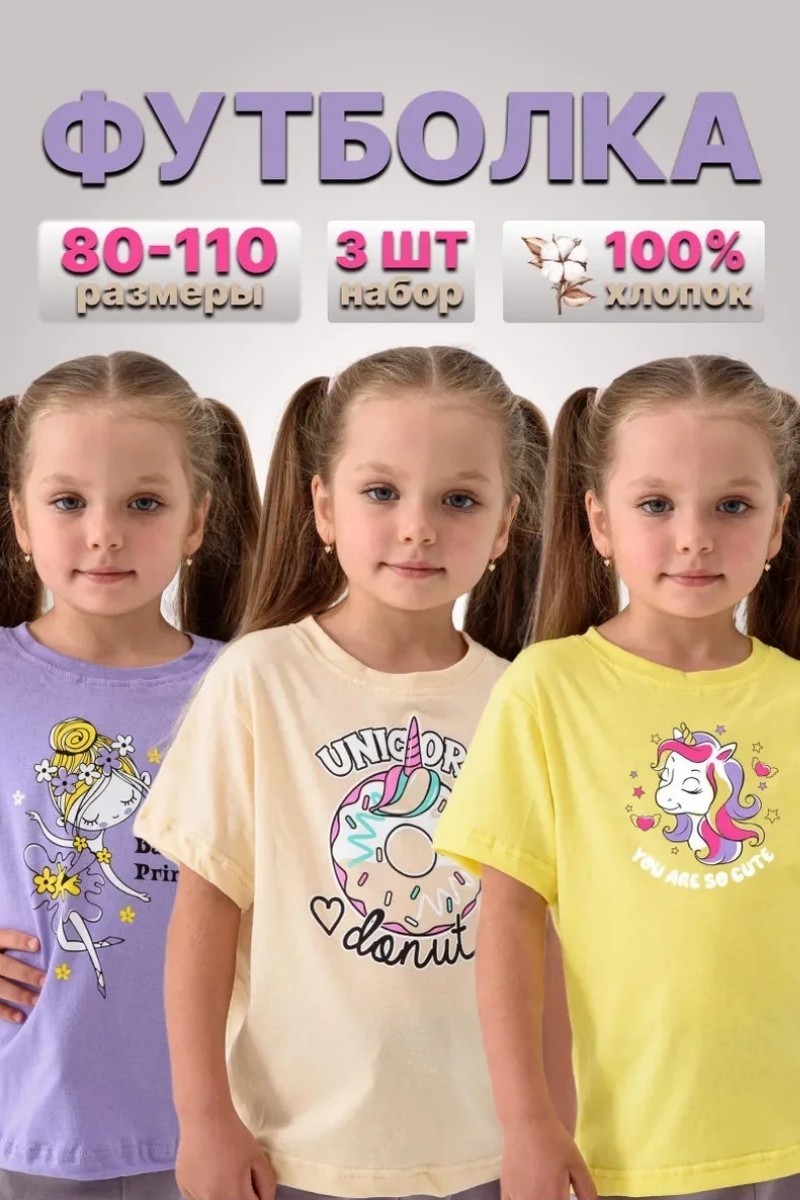 Представляем Вашему вниманию набор из 3-х детских футболок для девочки, сшитых из высококачественной кулирки - 100% хлопок, позволяющий коже дышать. Модель обеспечит Вашему ребёнку максимум комфорта и полную свободу движений в повседневной носке.