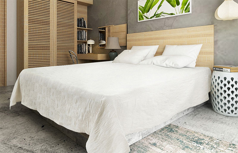 Рельефная поверхность ткани украшена уникальным рисунком утонченных узоров. Края покрывала оверложены, что придает изделию изысканную простоту и красоту. Ткань покрывала смесовая: хлопок и полиэстер, который придает изделию долговечность и несминаемость.