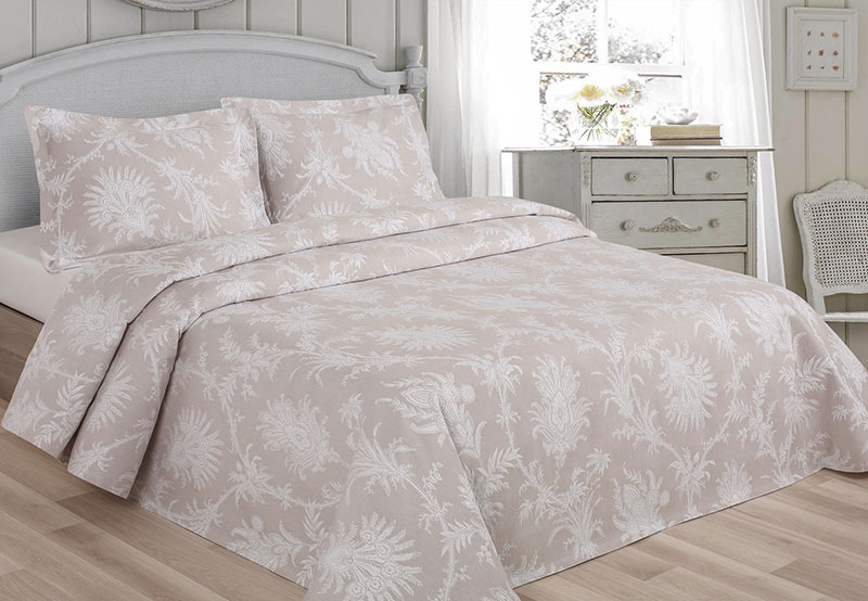 Рельефная поверхность ткани украшена уникальным рисунком утонченных узоров. Края покрывала оверложены, что придает изделию изысканную простоту и красоту. Ткань покрывала смесовая: хлопок и полиэстер, который придает изделию долговечность и несминаемость.