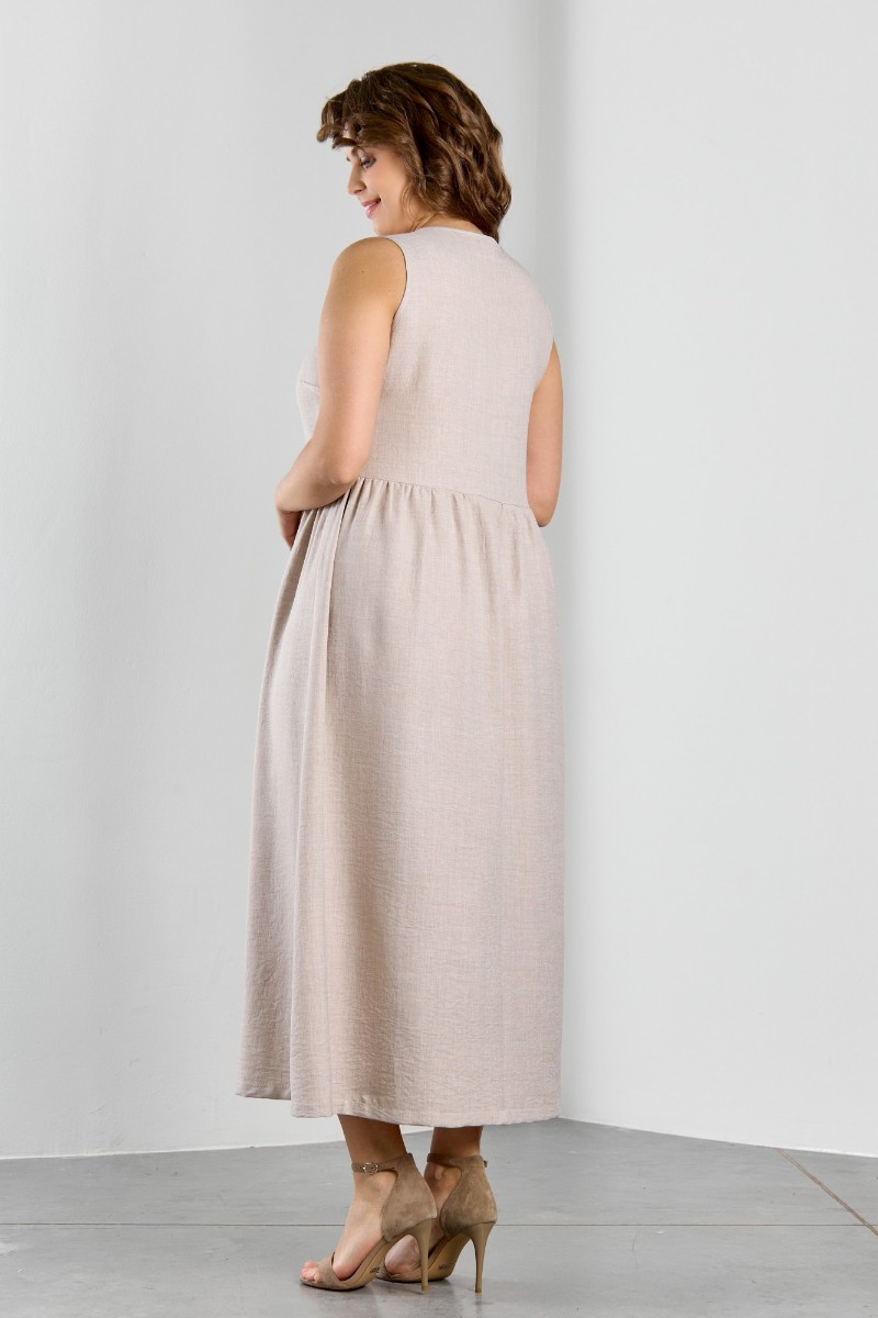 Представляем Вашему вниманию платье женское из гладкокрашеного тканого полотна, отрезное по линии талии, длинное, без рукавов, с горловиной овальной формы и центральной бортовой застежкой по лифу на петли и пуговицы. Юбка присборена по шву стачивания с лифом, горловина и проймы окантованы основным материалом.