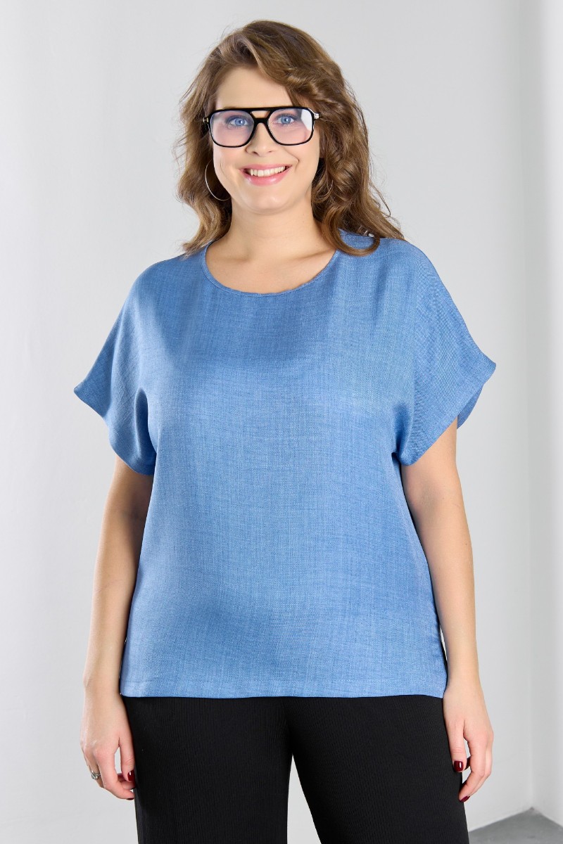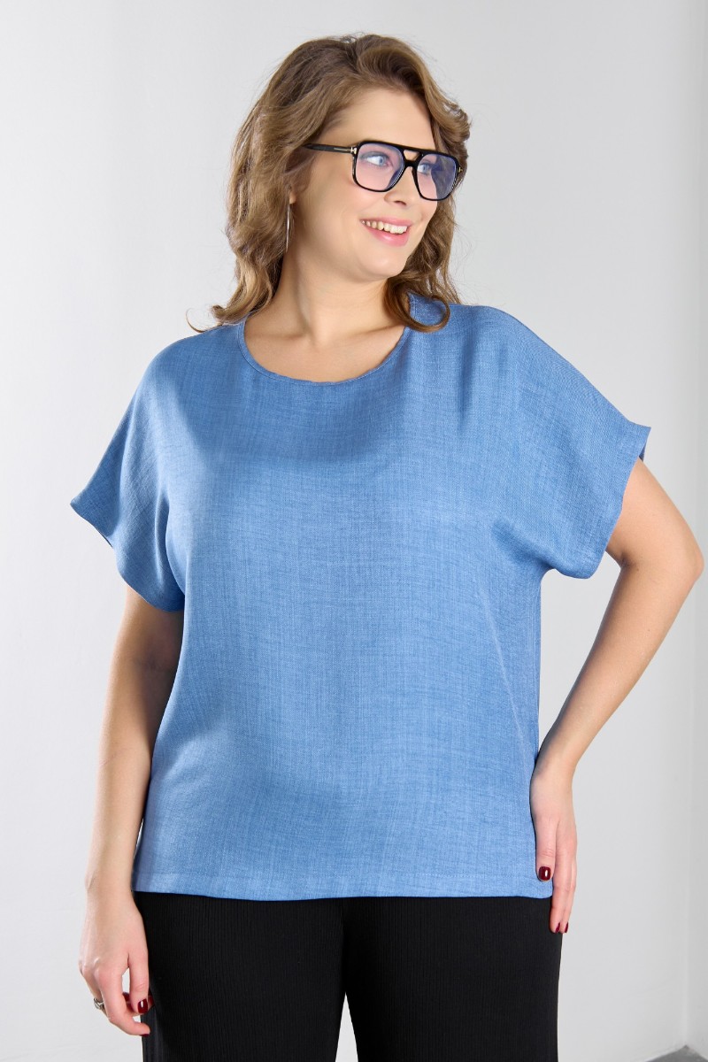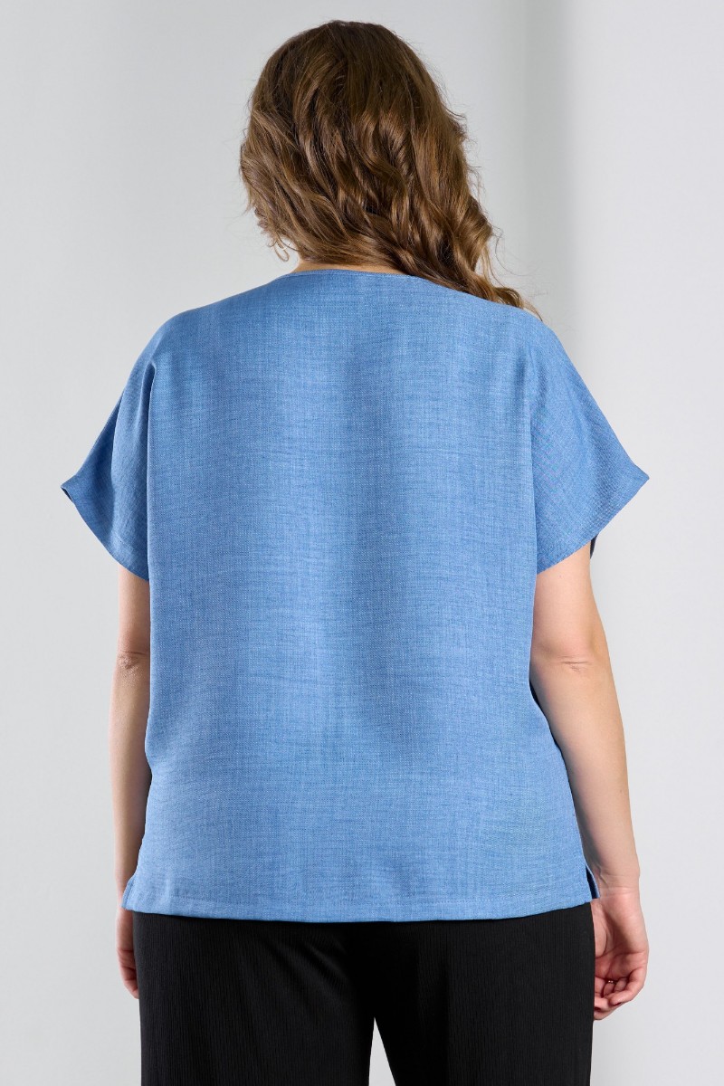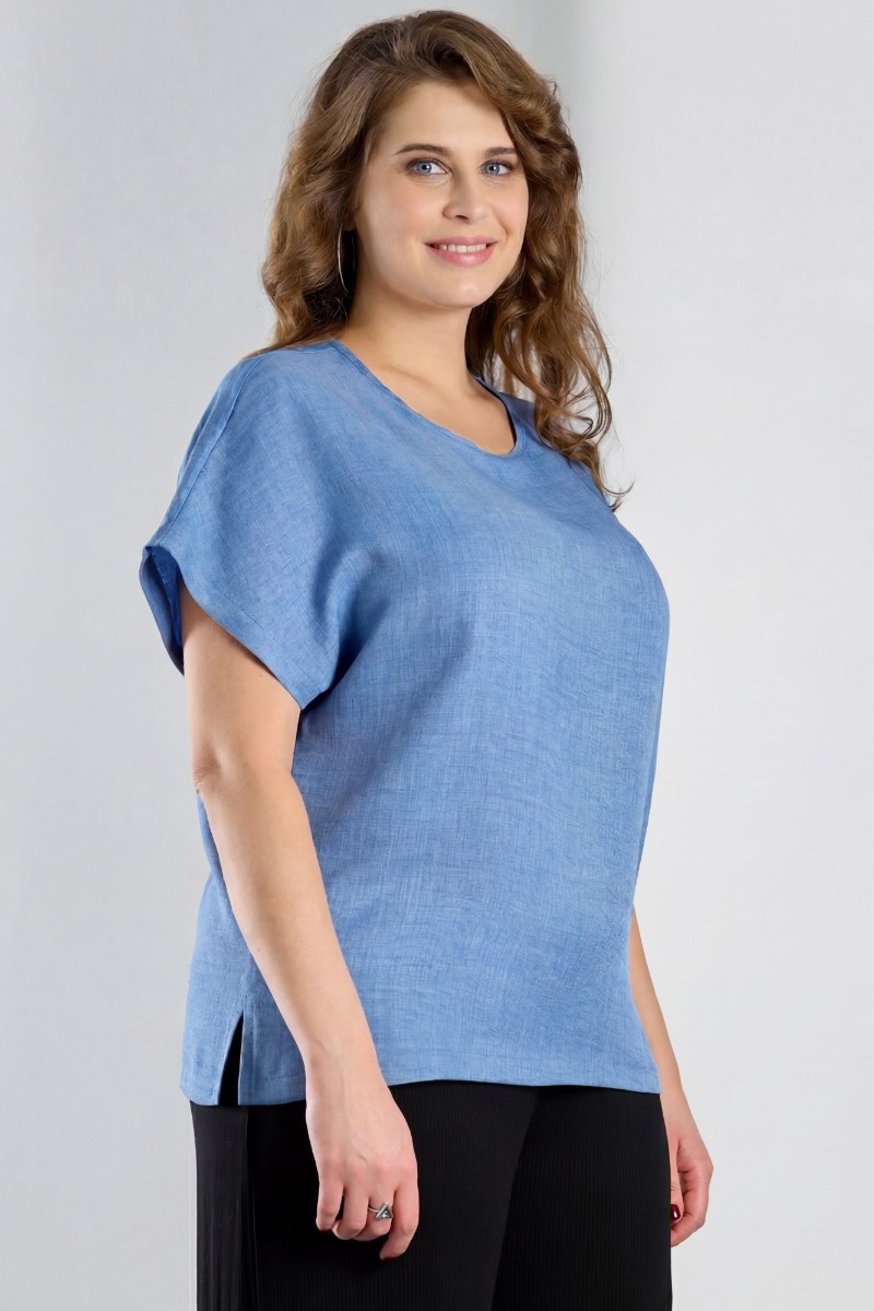 Представляем Вашему вниманию женскую блузку из гладкокрашеного тканого полотна, прямого силуэта, с горловиной овальной формы и цельнокроеными рукавами. Горловина окантована основным материалом, в боковых швах небольшие разрезы.