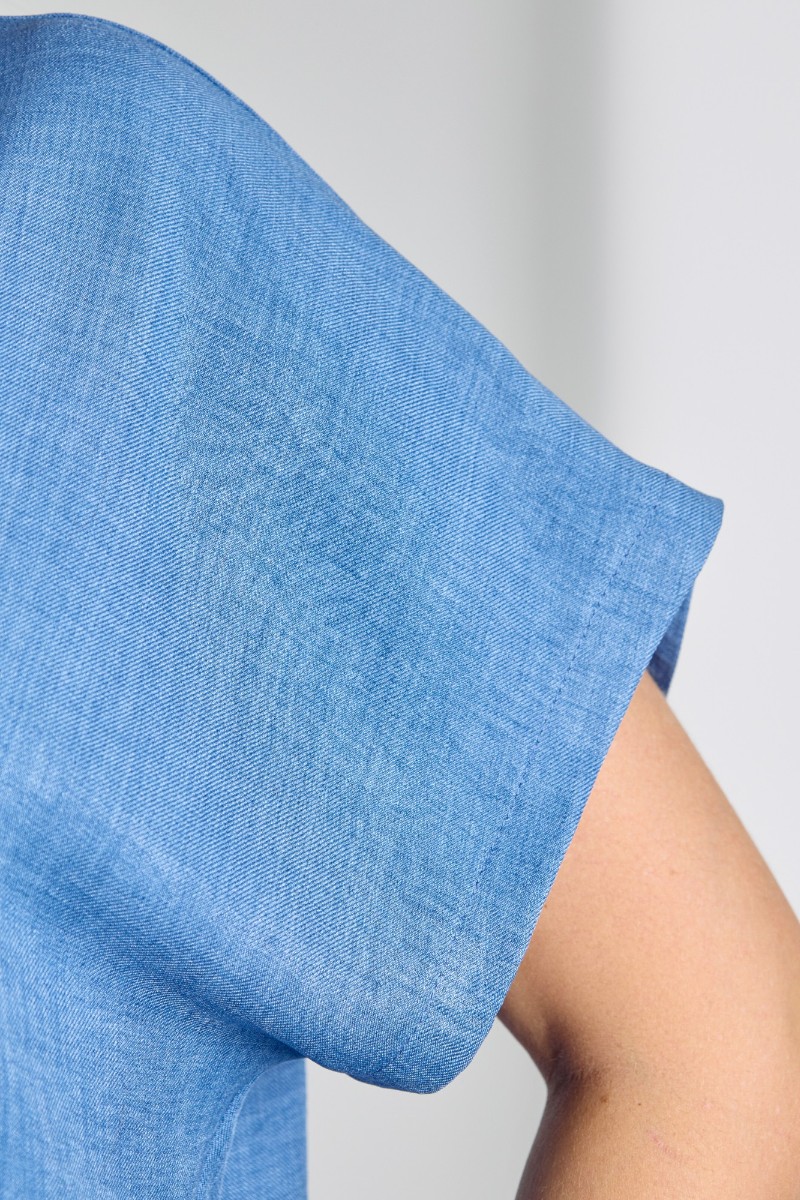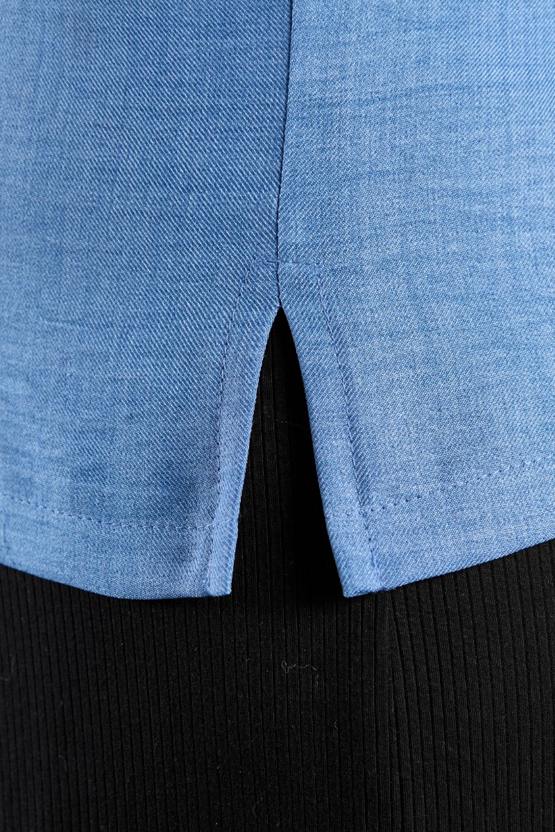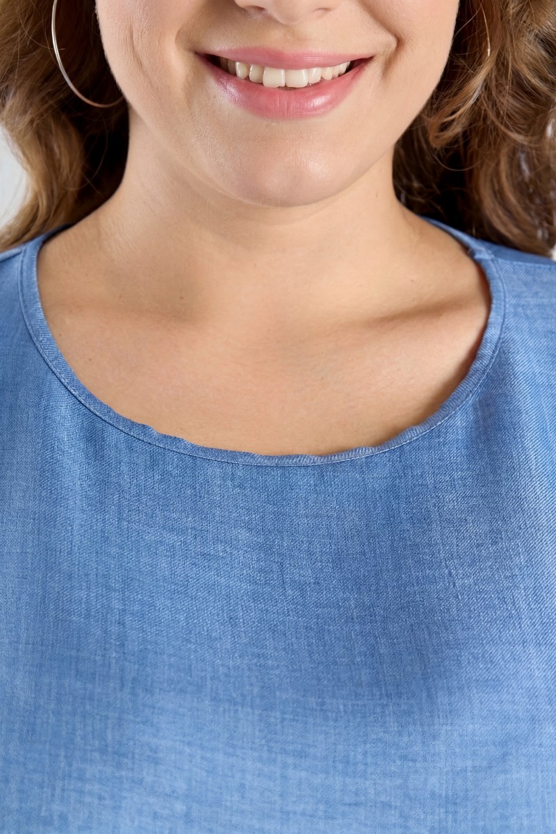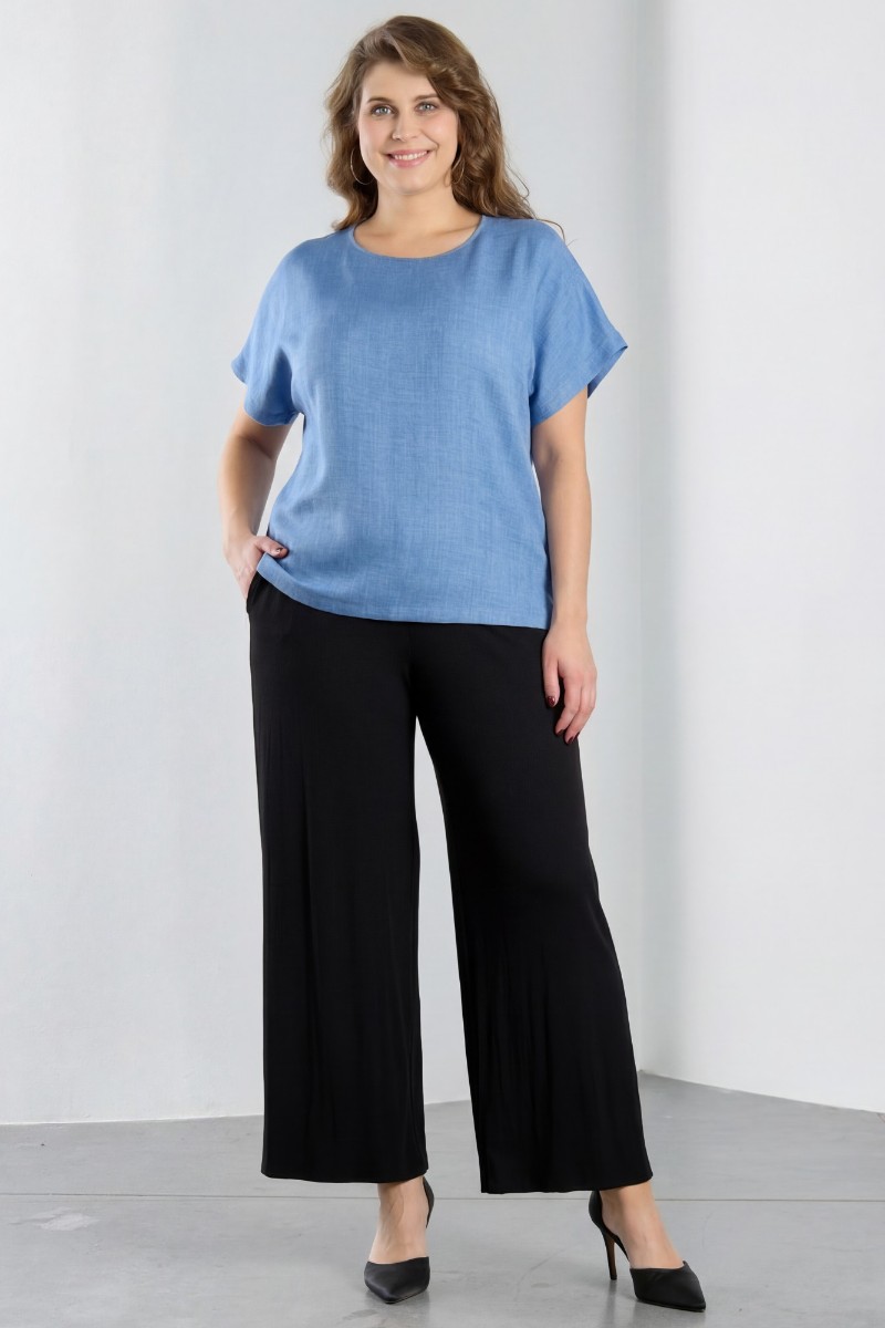 Представляем Вашему вниманию женскую блузку из гладкокрашеного тканого полотна, прямого силуэта, с горловиной овальной формы и цельнокроеными рукавами. Горловина окантована основным материалом, в боковых швах небольшие разрезы.