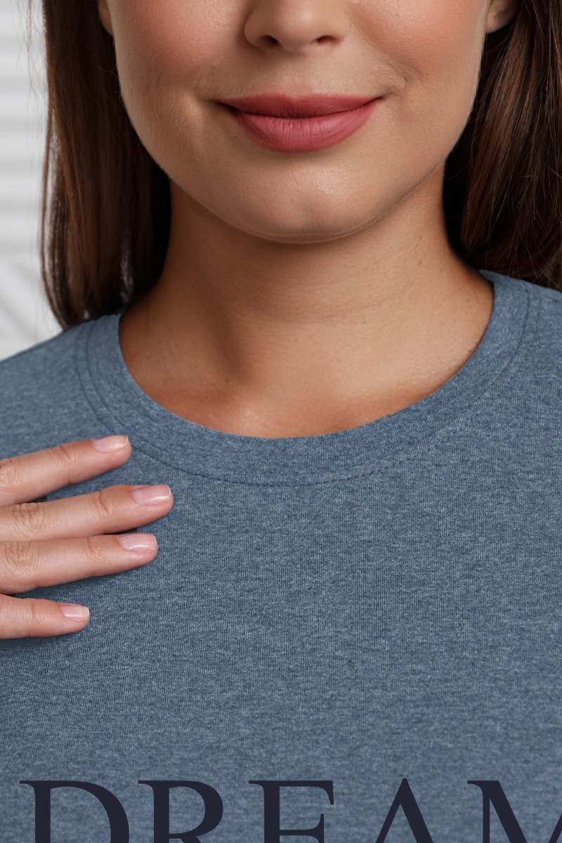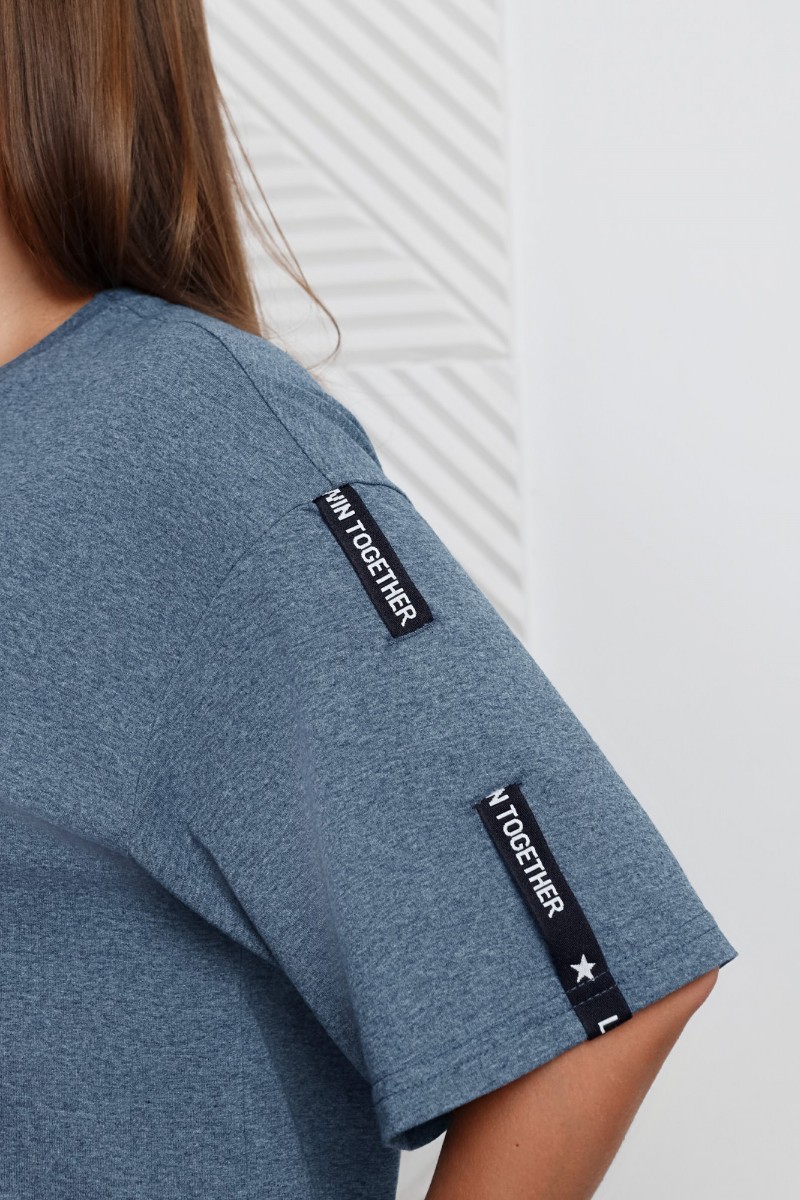 Представляем Вашему вниманию женскую тунику из гладкокрашеного «меланжированного» трикотажного полотна «кулирка» прямого силуэта, горловиной овальной формы, обработанной втачной планкой, короткими втачными рукавами и фигурным низом. На рукавах модным элементом является отделка декоративной лентой, продетой в две обметанные петли. На полочке выполнен принт в технике «шелкографии».