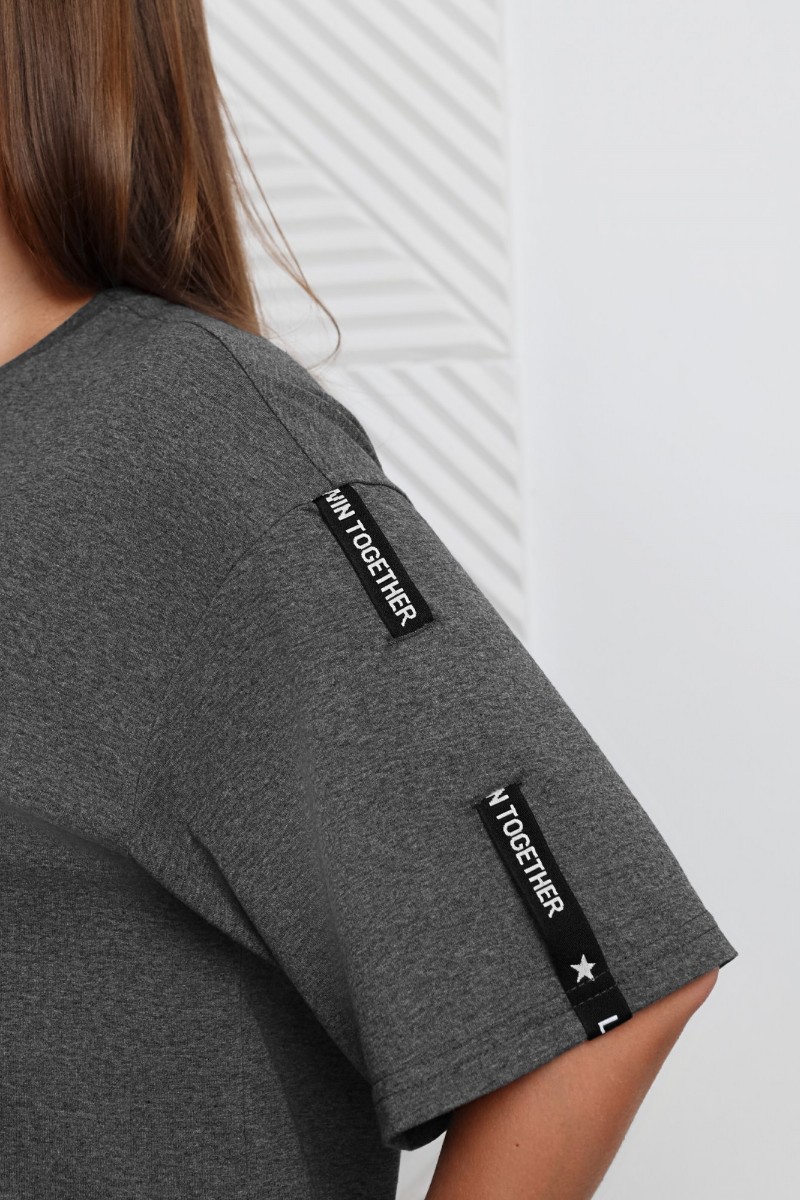 Представляем Вашему вниманию женскую тунику из гладкокрашеного «меланжированного» трикотажного полотна «кулирка» прямого силуэта, горловиной овальной формы, обработанной втачной планкой, короткими втачными рукавами и фигурным низом. На рукавах модным элементом является отделка декоративной лентой, продетой в две обметанные петли. На полочке выполнен принт в технике «шелкографии».