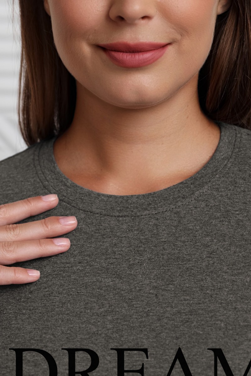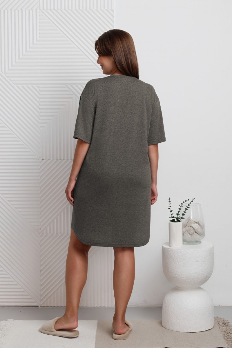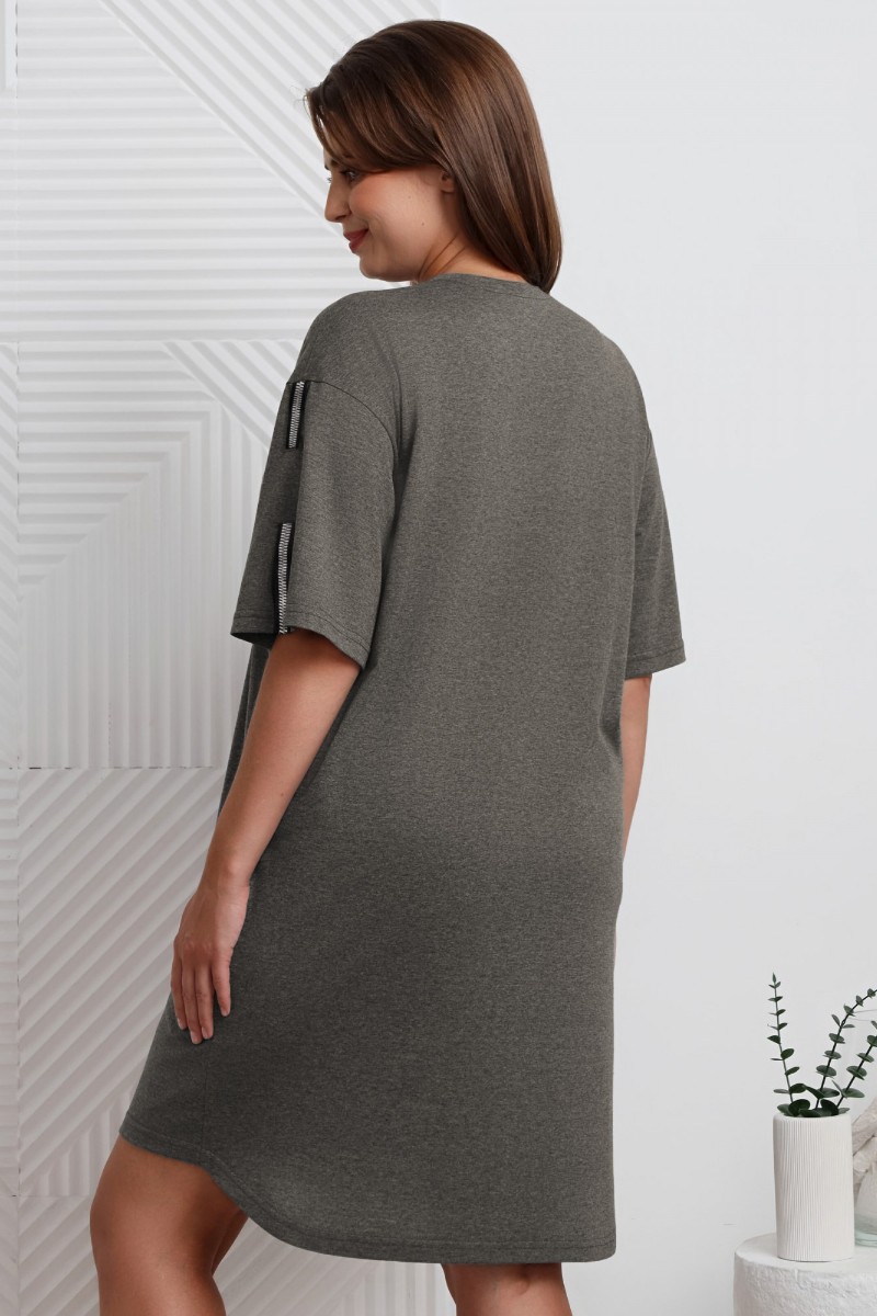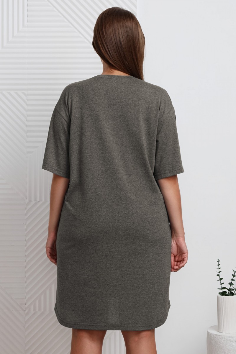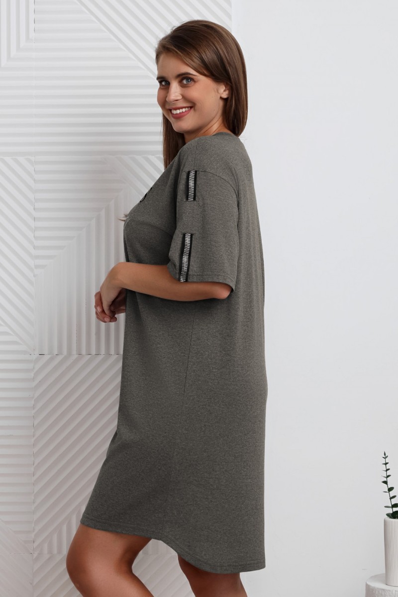 Представляем Вашему вниманию женскую тунику из гладкокрашеного «меланжированного» трикотажного полотна «кулирка» прямого силуэта, горловиной овальной формы, обработанной втачной планкой, короткими втачными рукавами и фигурным низом. На рукавах модным элементом является отделка декоративной лентой, продетой в две обметанные петли. На полочке выполнен принт в технике «шелкографии».