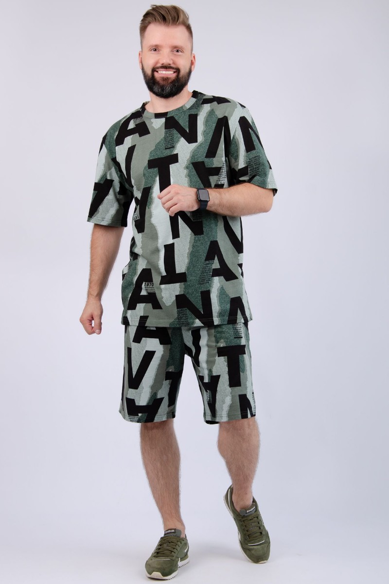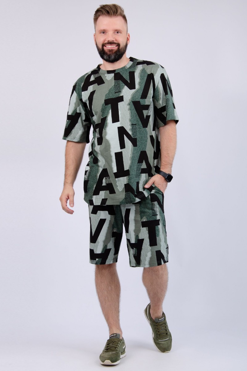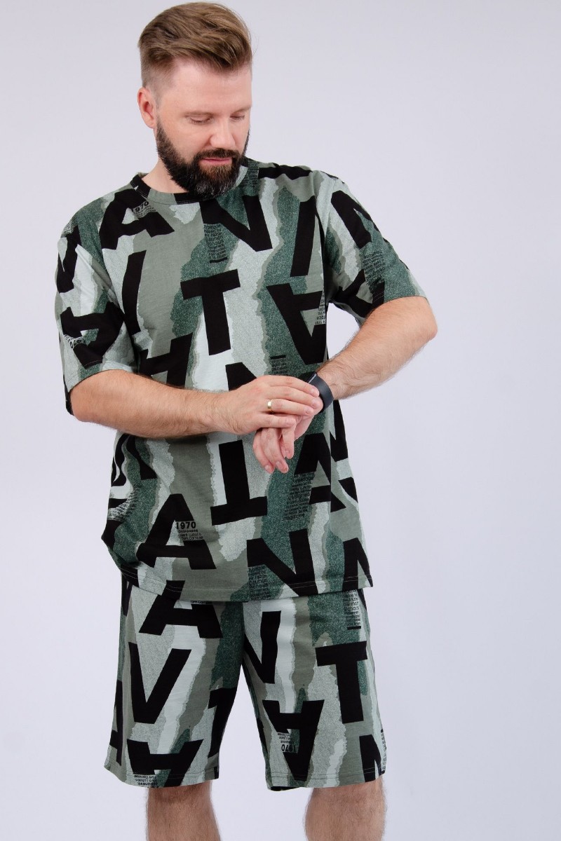 Представляем Вашему вниманию мужской костюм двойку, состоящий из футболки и шорт. Комплект имеет интересную расцветку, которая красиво смотрится и поднимает настроение. Костюм хорошо сидит на фигуре и подчеркивает её достоинства. Отдых в нём будет максимально комфортным и расслабляющим.