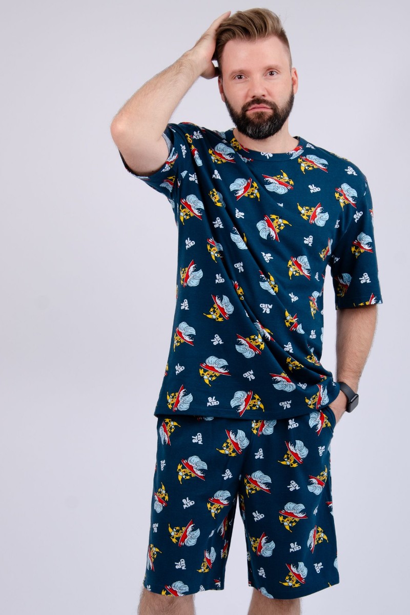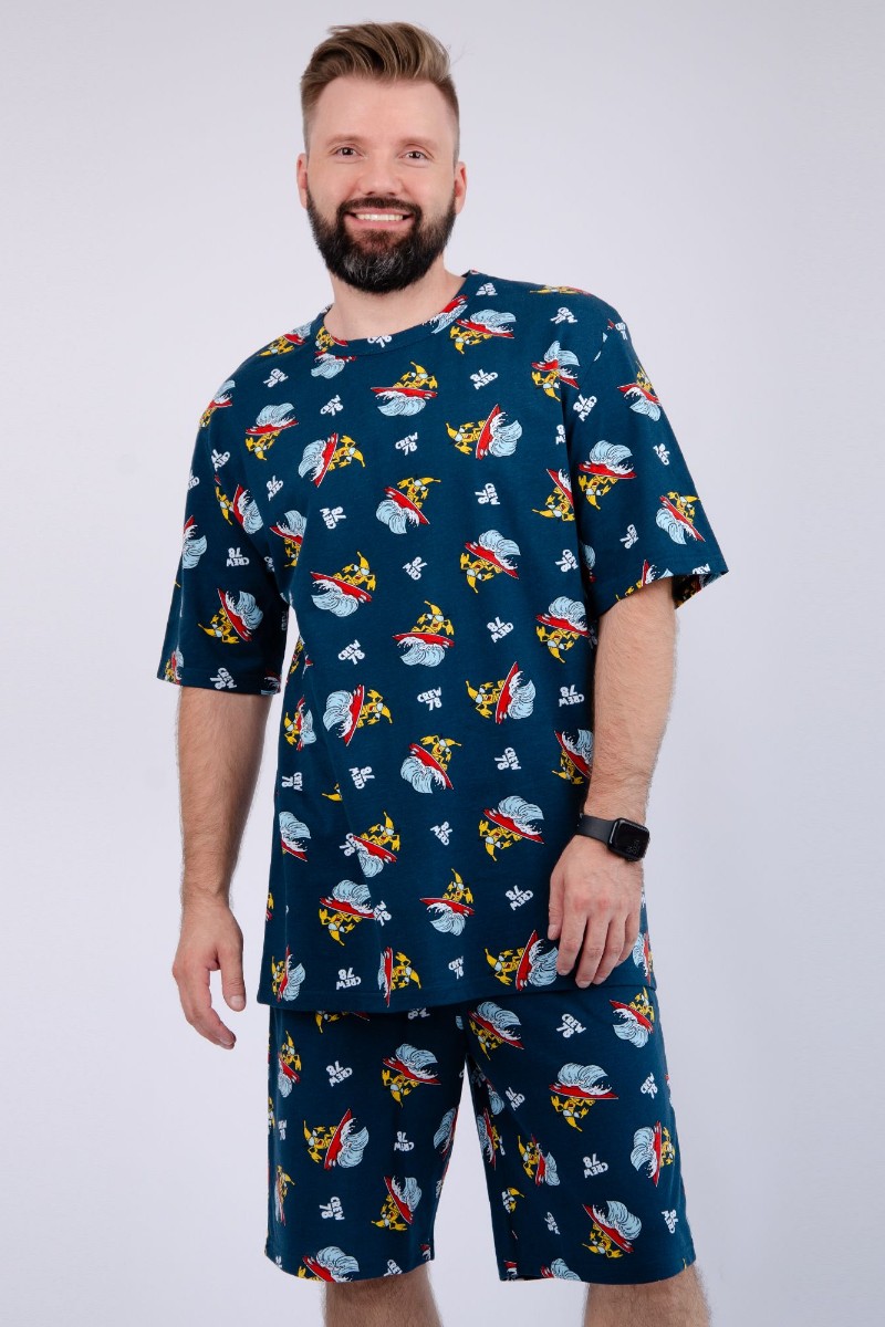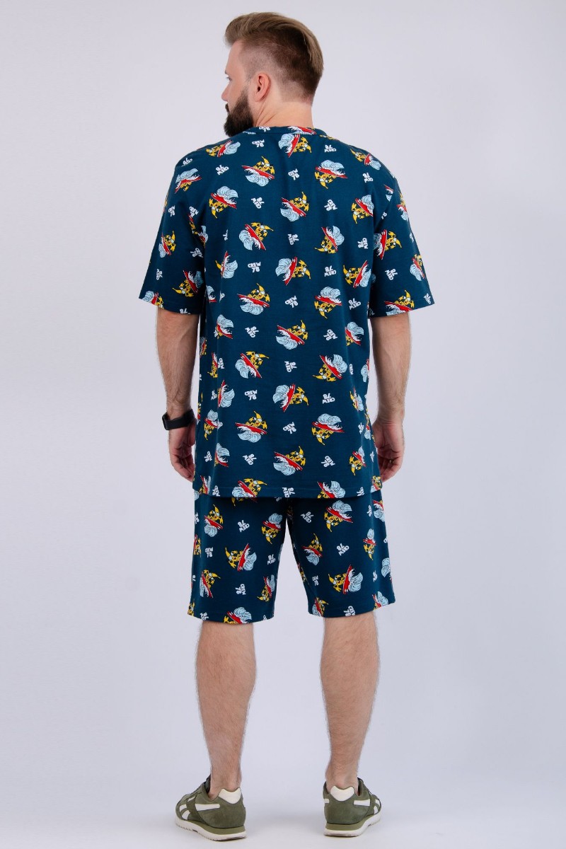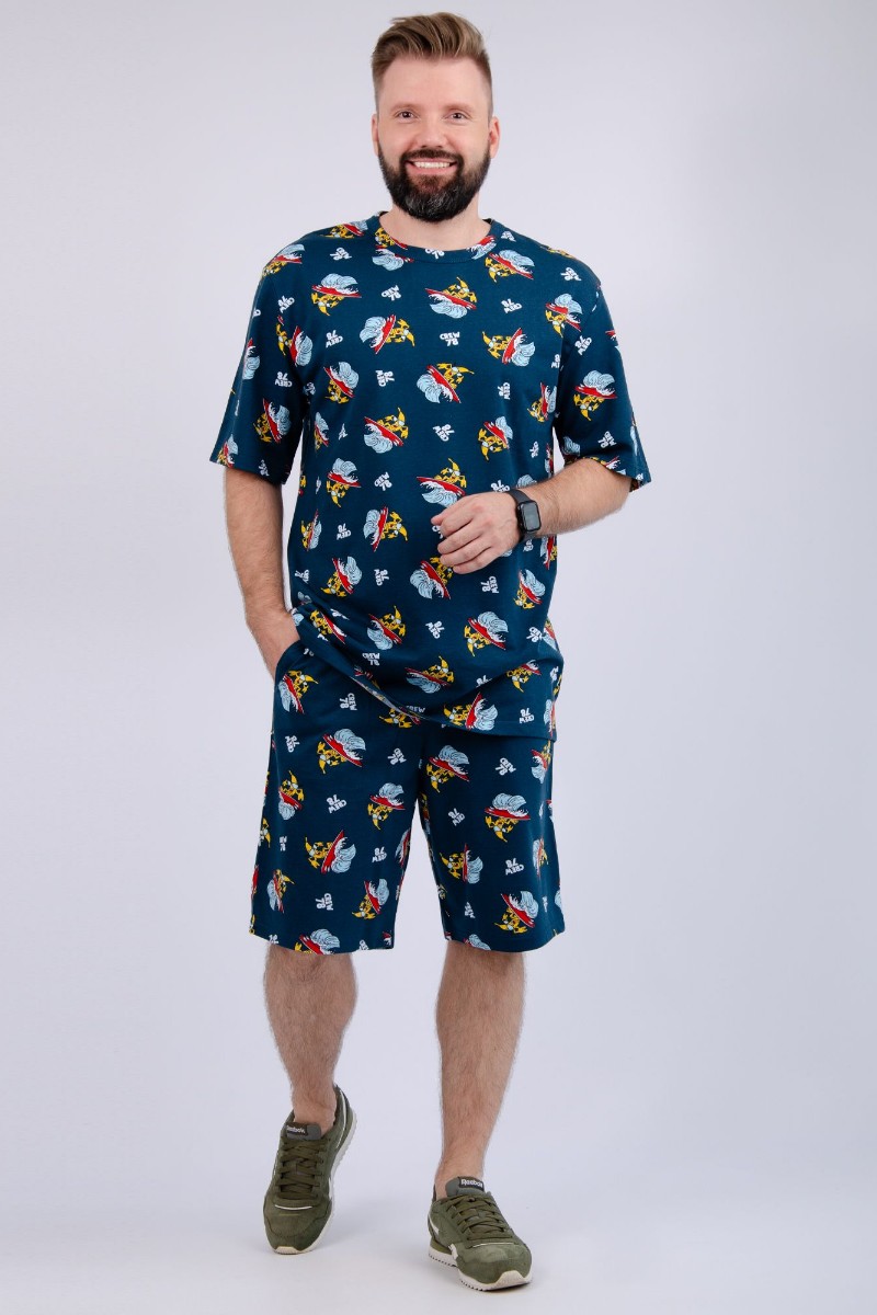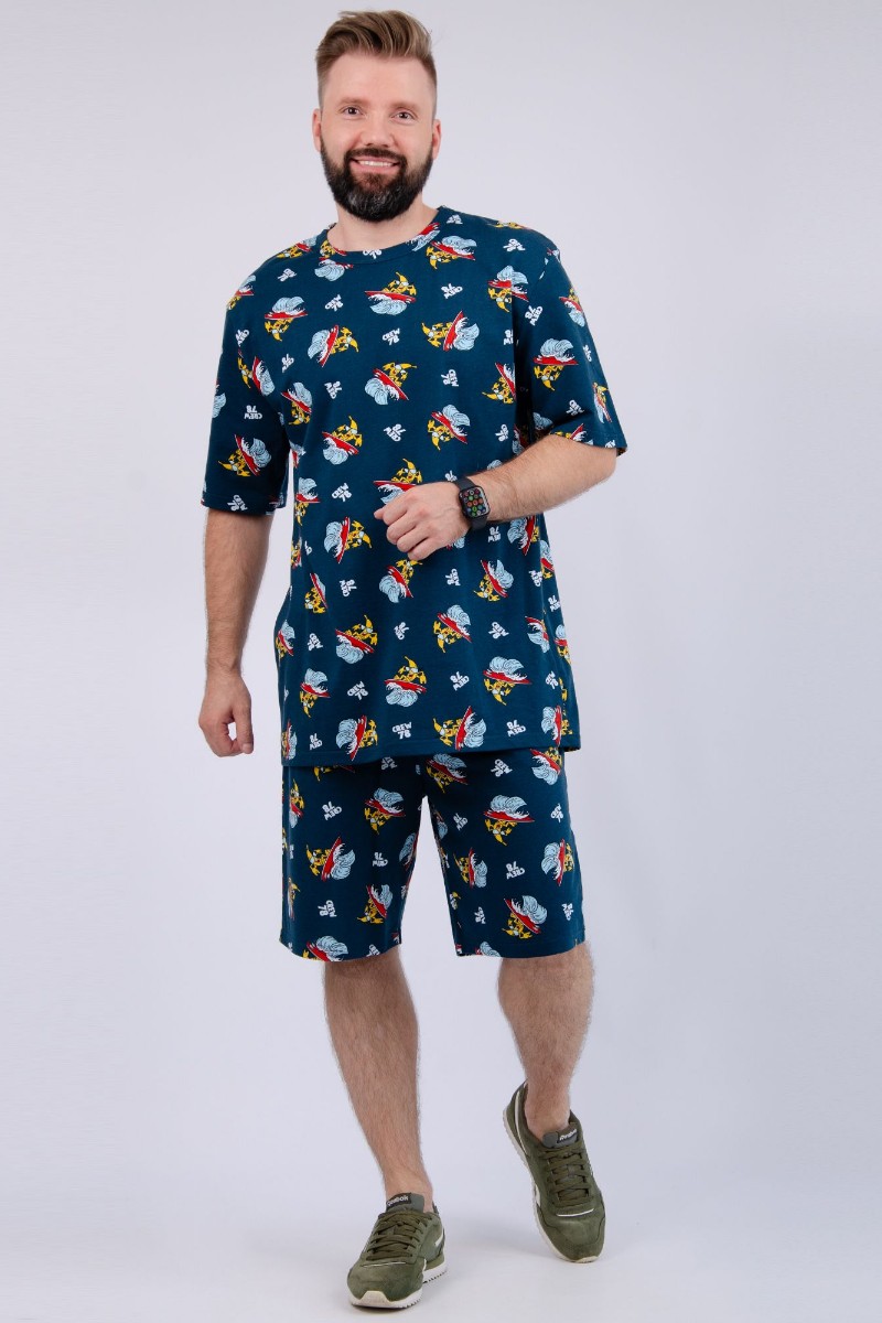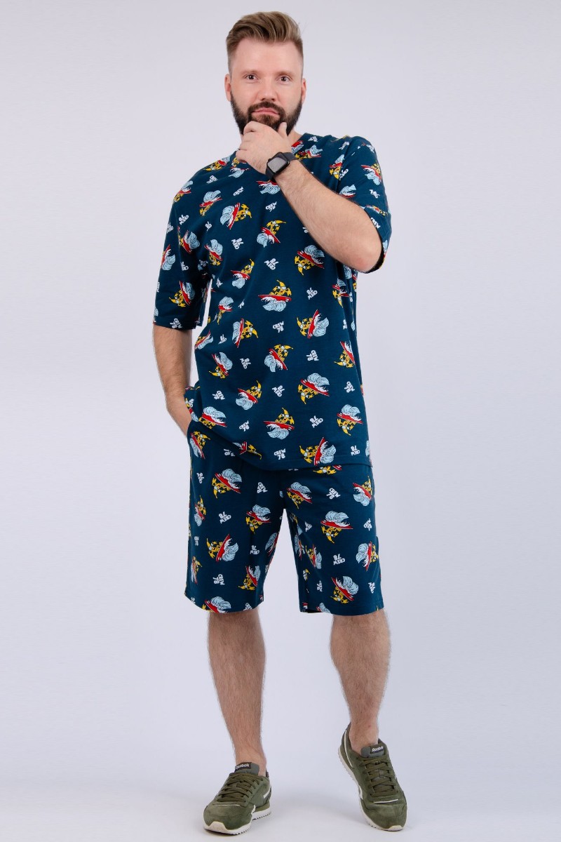 Представляем Вашему вниманию мужской костюм двойку, состоящий из футболки и шорт. Комплект имеет интересную расцветку, которая красиво смотрится и поднимает настроение. Костюм хорошо сидит на фигуре и подчеркивает её достоинства. Отдых в нём будет максимально комфортным и расслабляющим.
